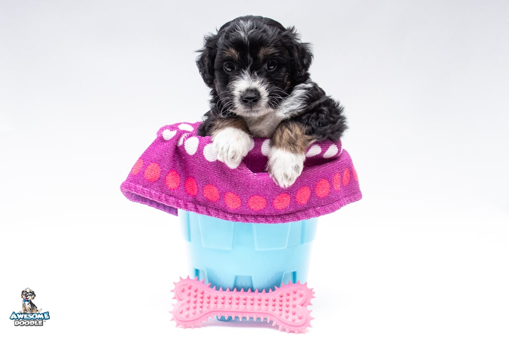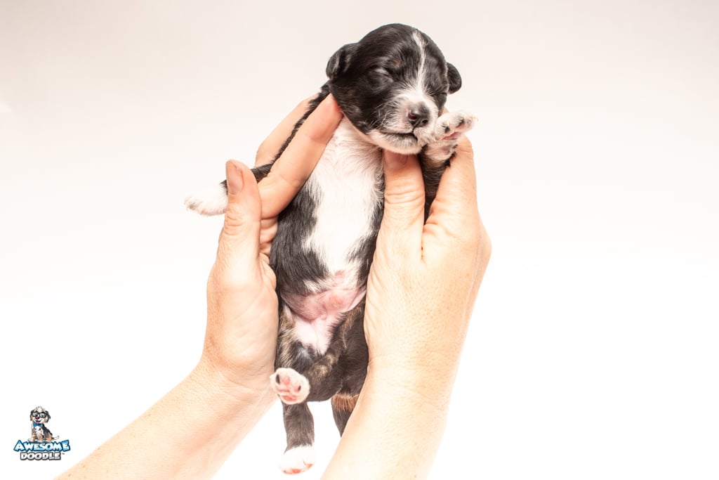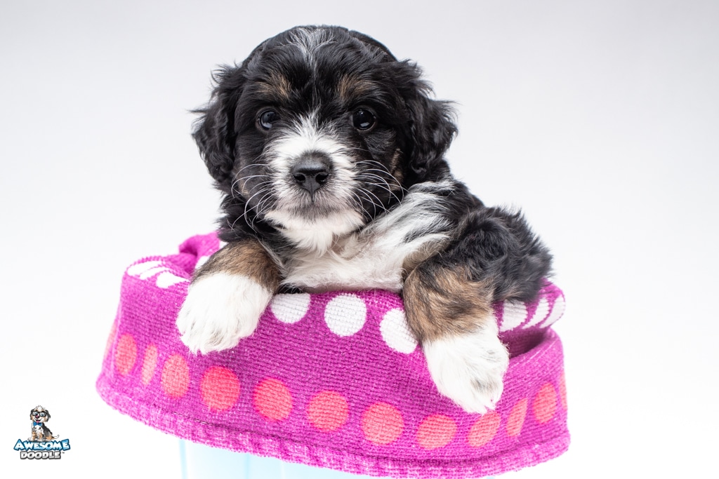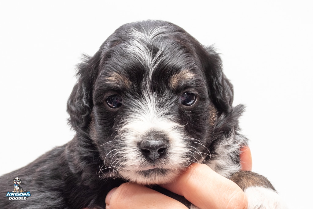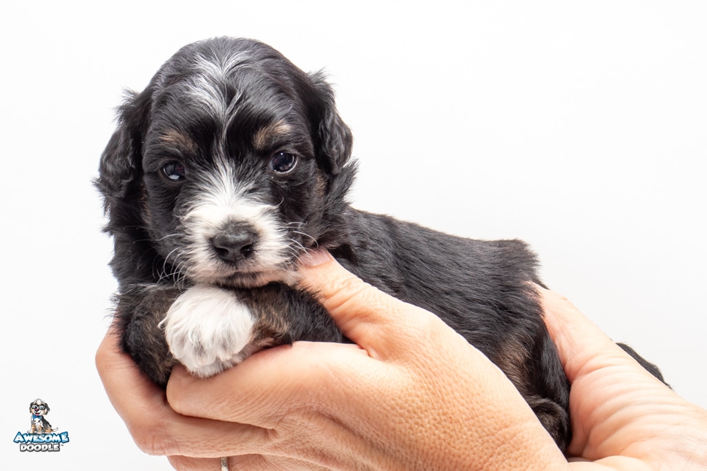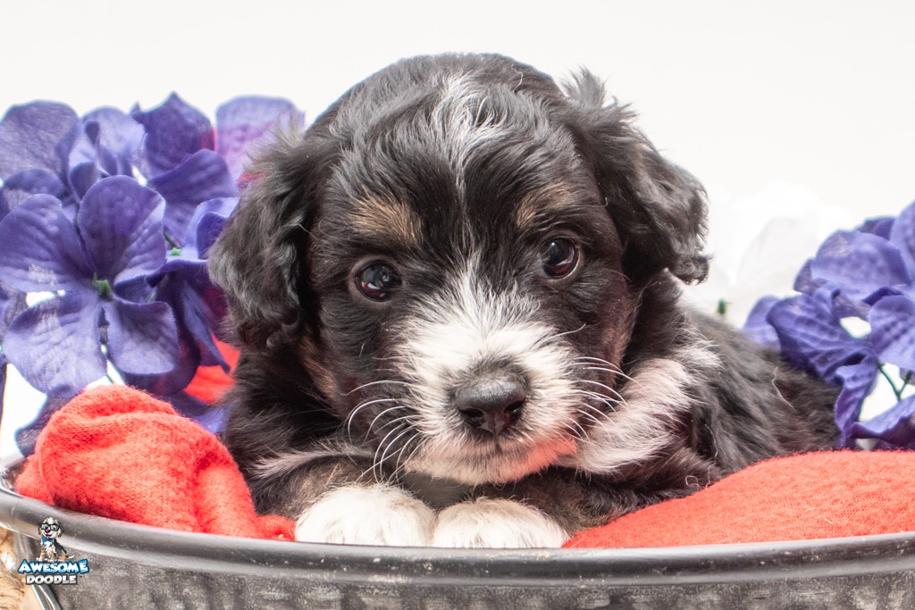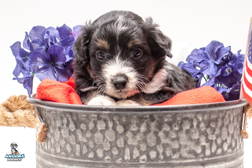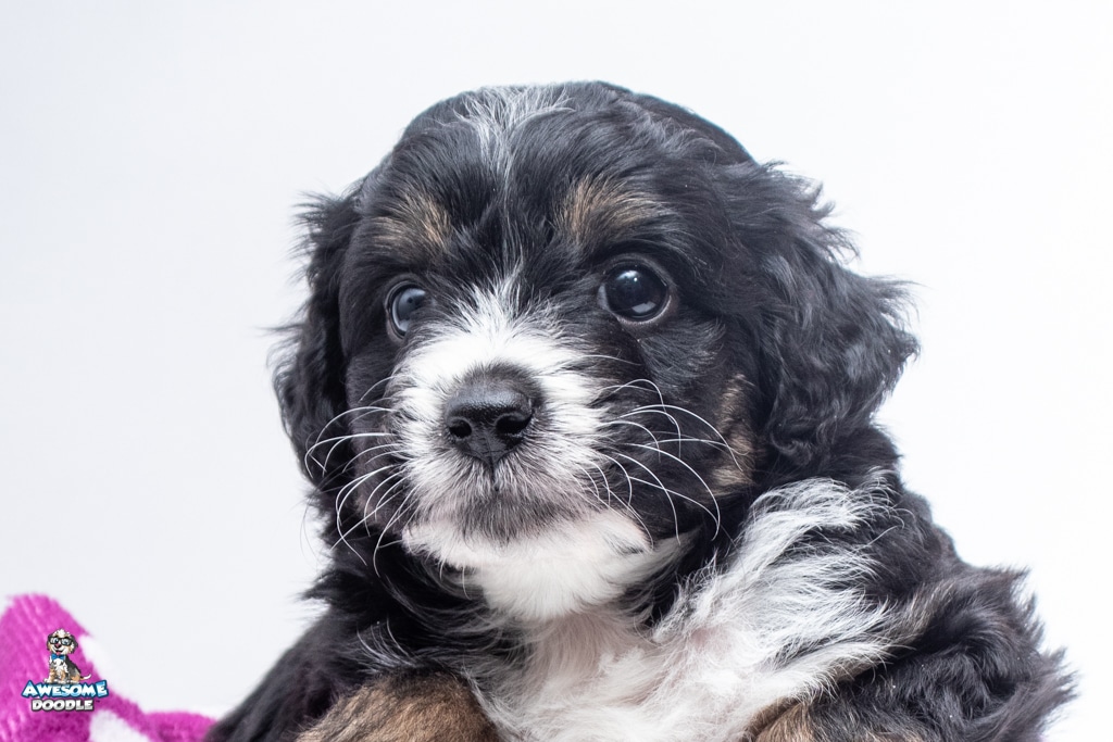 Toby is a male Black Tri-Color F1 AussieDoodle puppy.