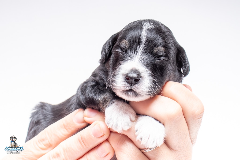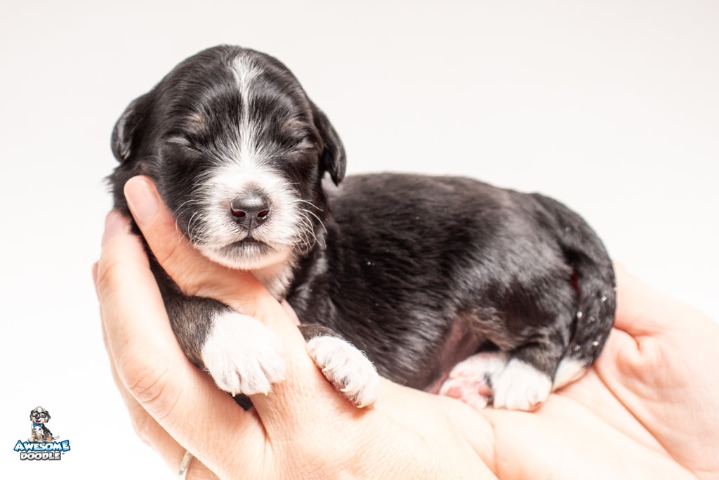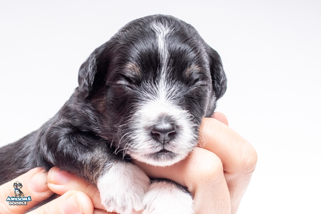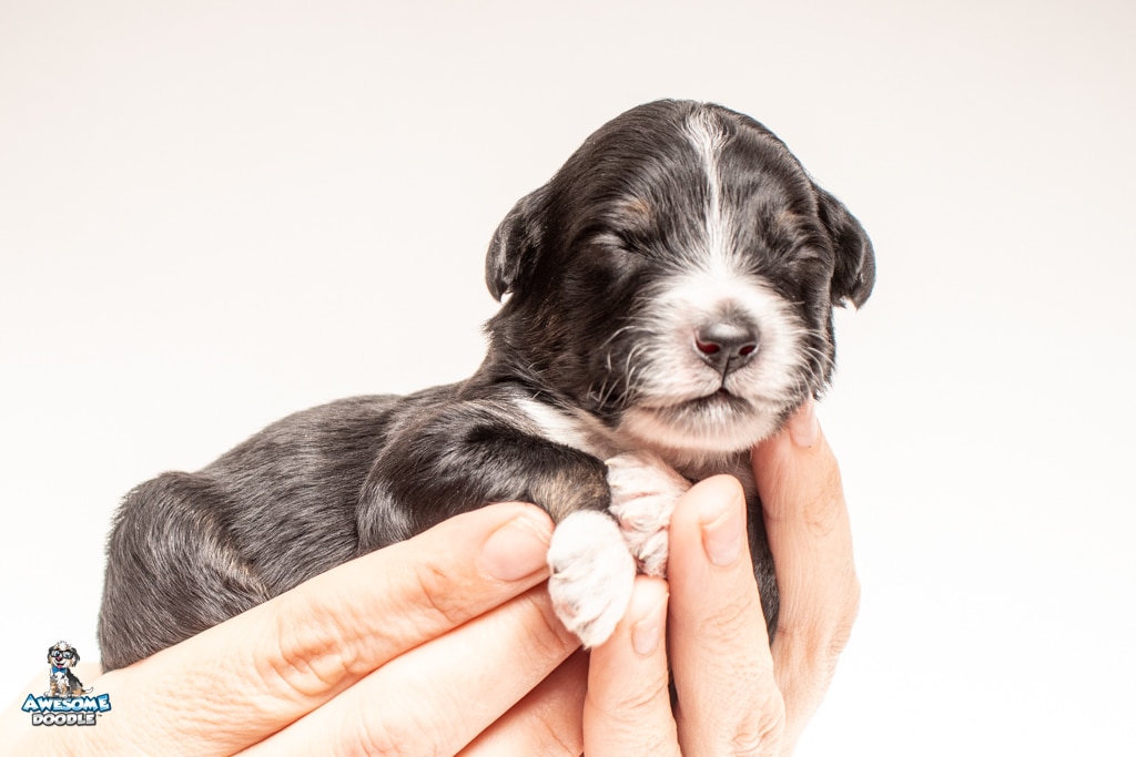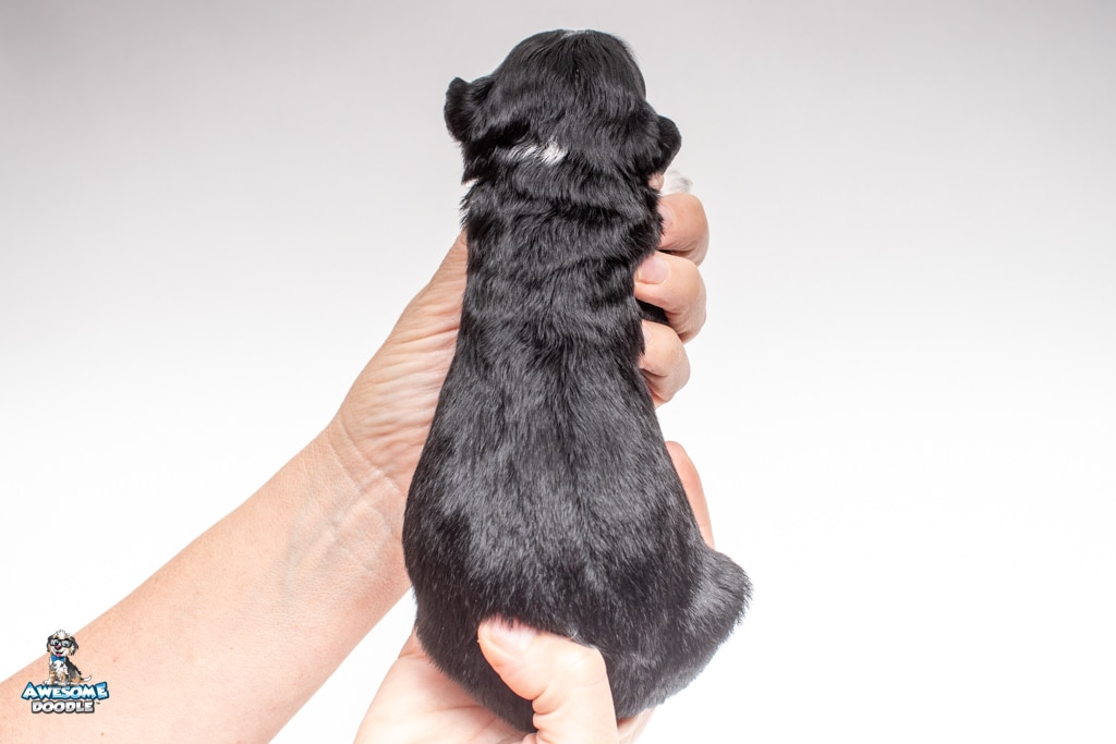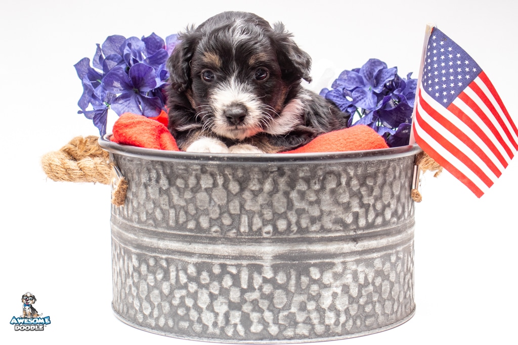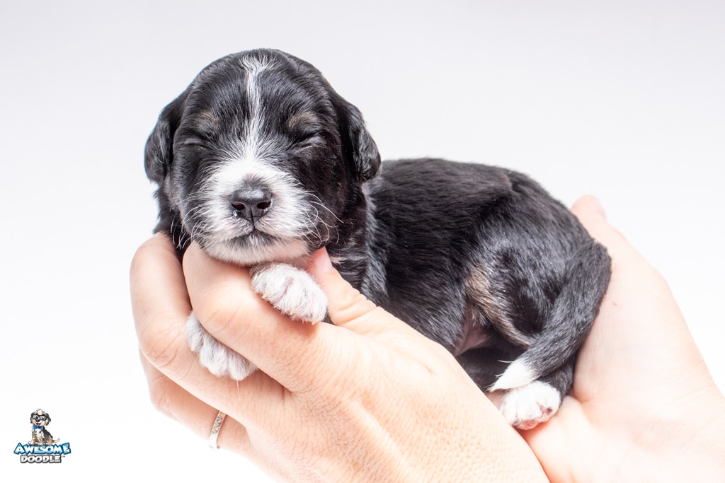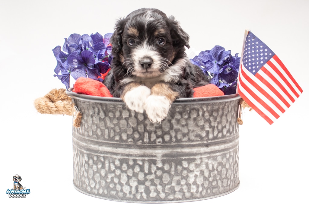 Toby is a male Black Tri-Color F1 AussieDoodle puppy.