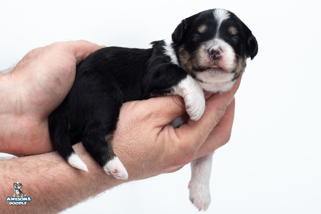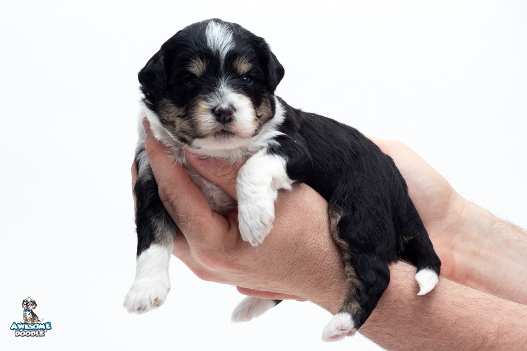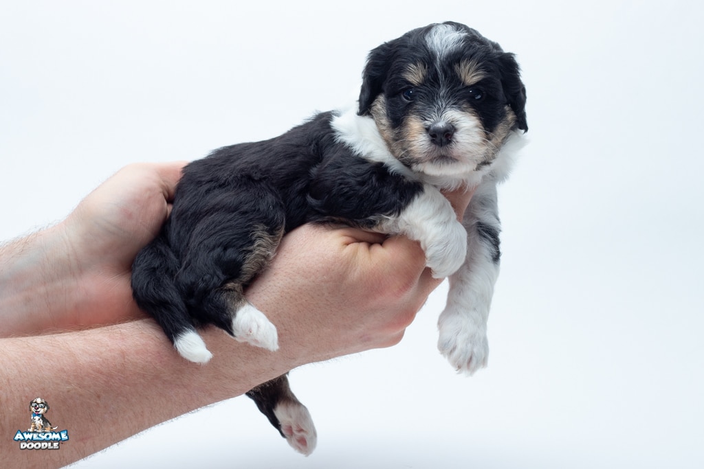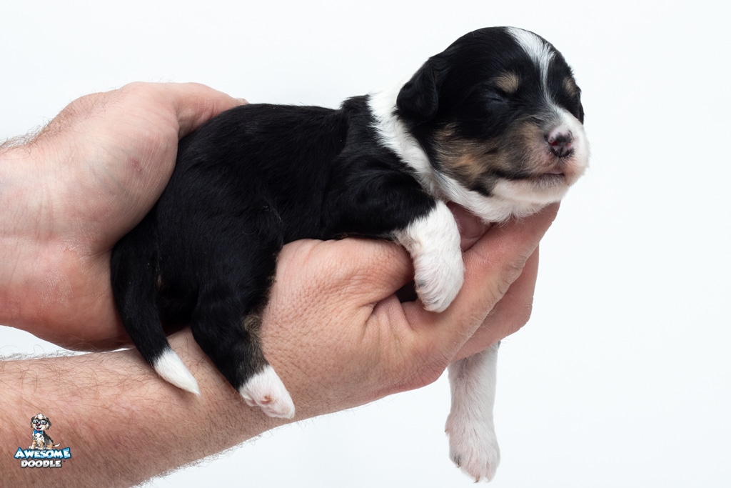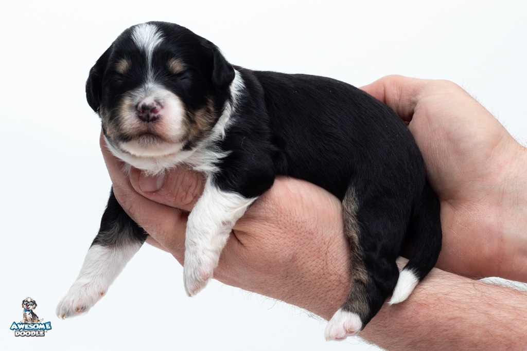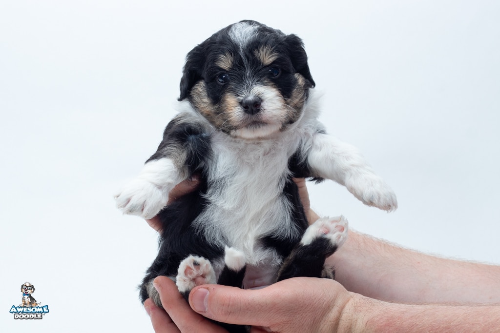 Mookie is a female Black Tri-Color F1 AussieDoodle puppy.