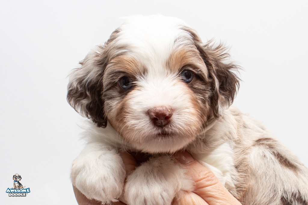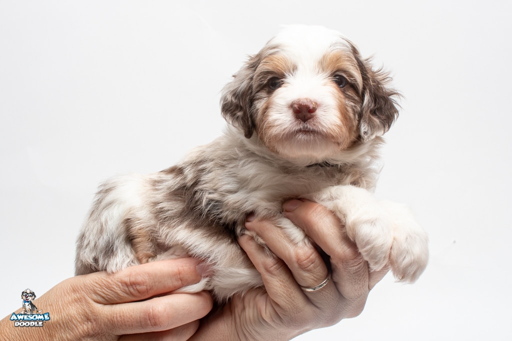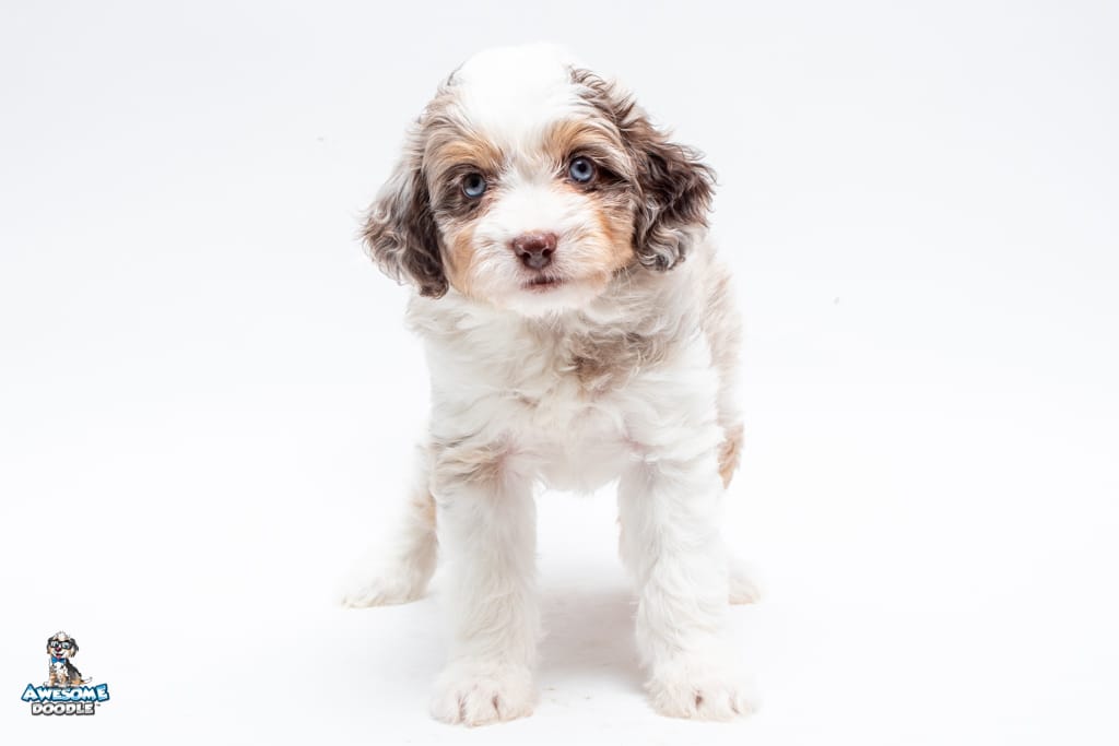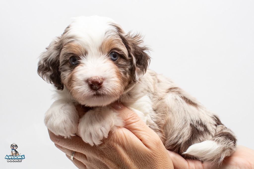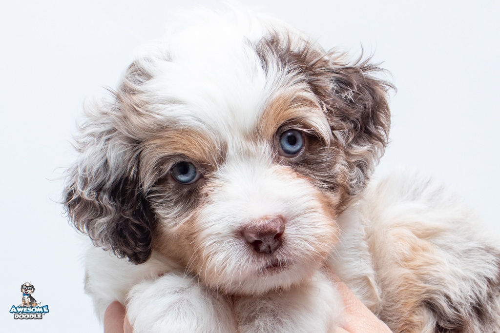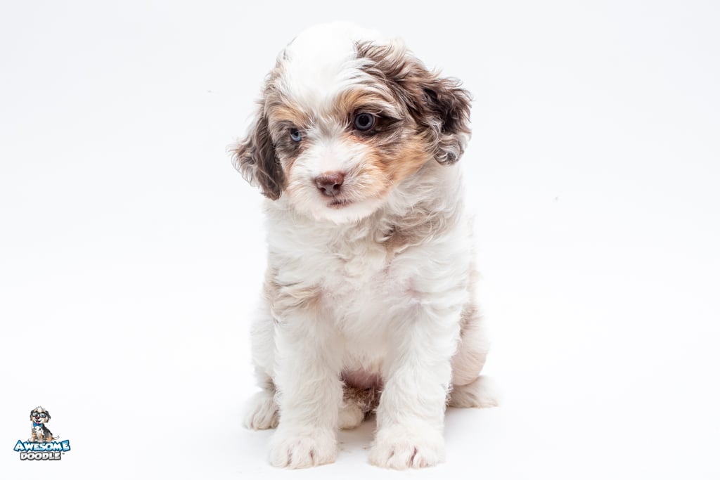 Nova is a female Chocolate Merle w/ White & Copper F1 AussieDoodle puppy.