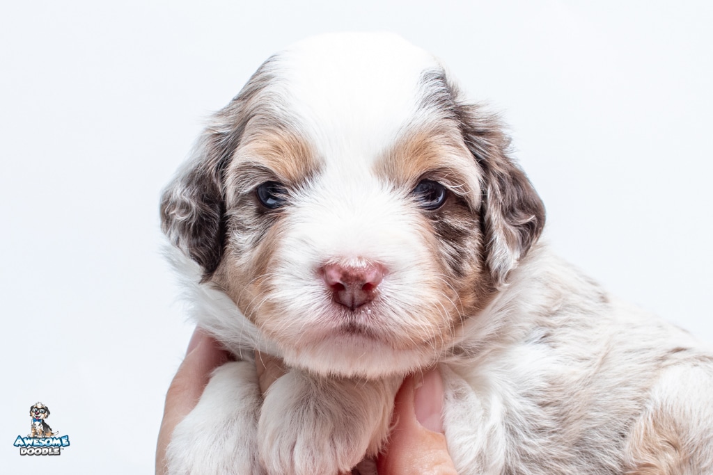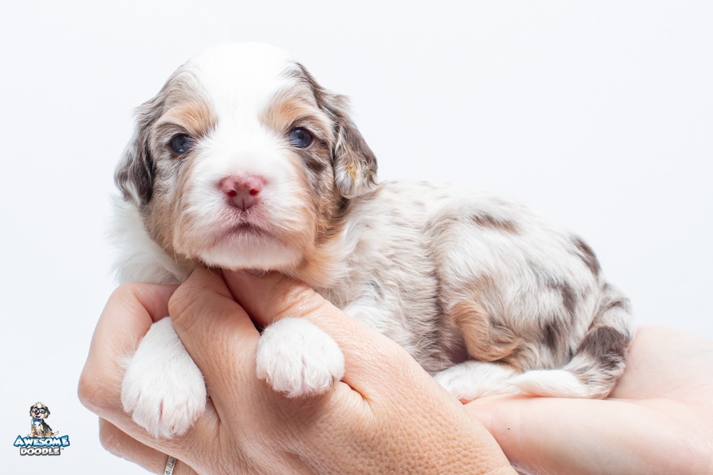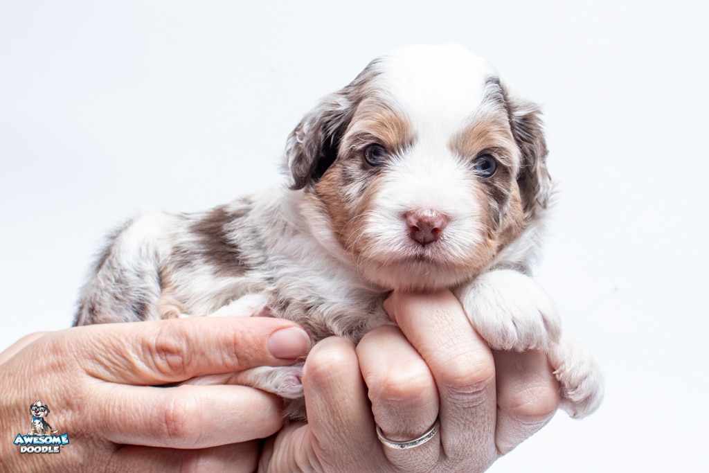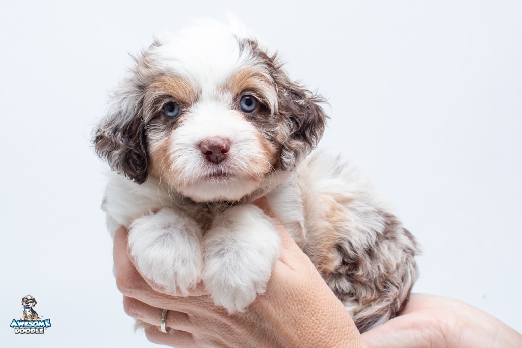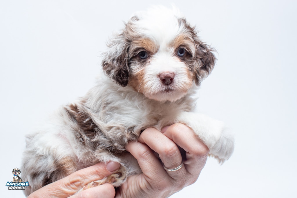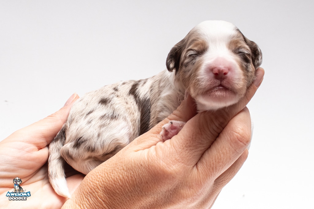 Nova is a female Chocolate Merle w/ White & Copper F1 AussieDoodle puppy.