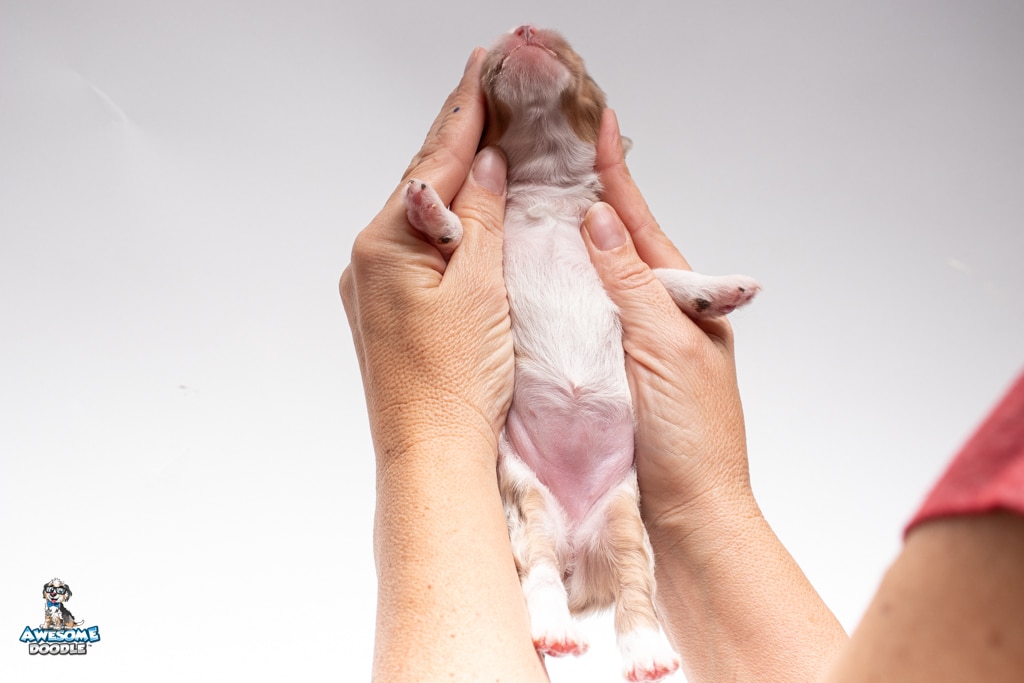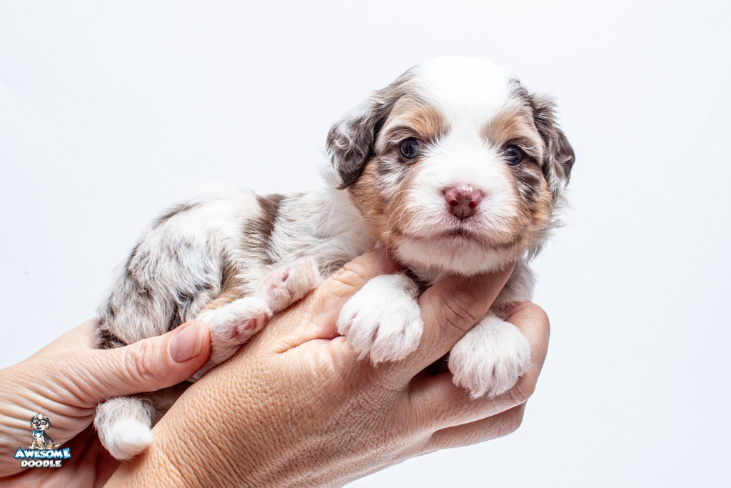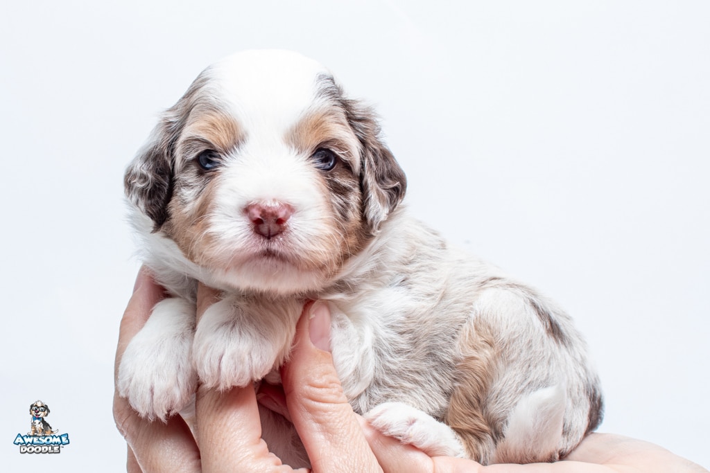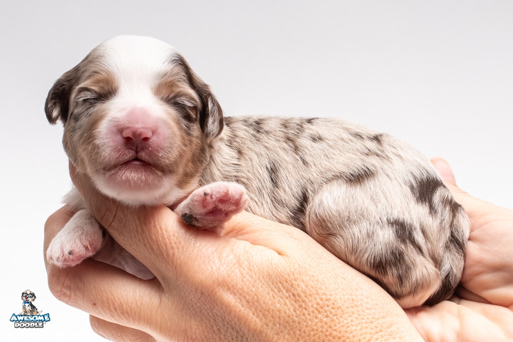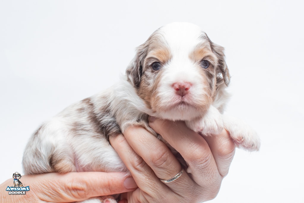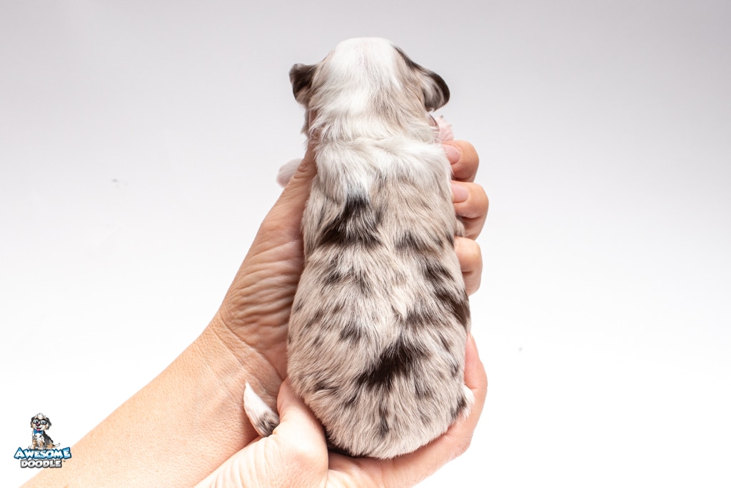 Nova is a female Chocolate Merle w/ White & Copper F1 AussieDoodle puppy.
