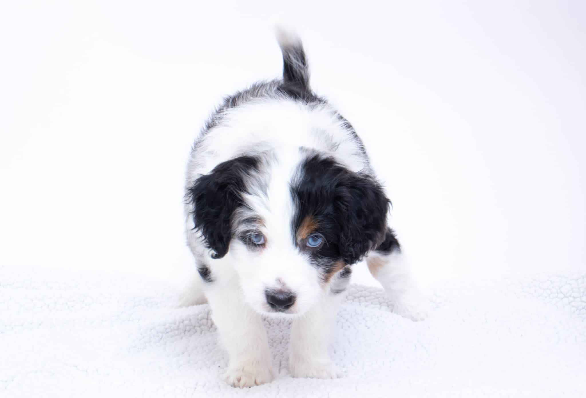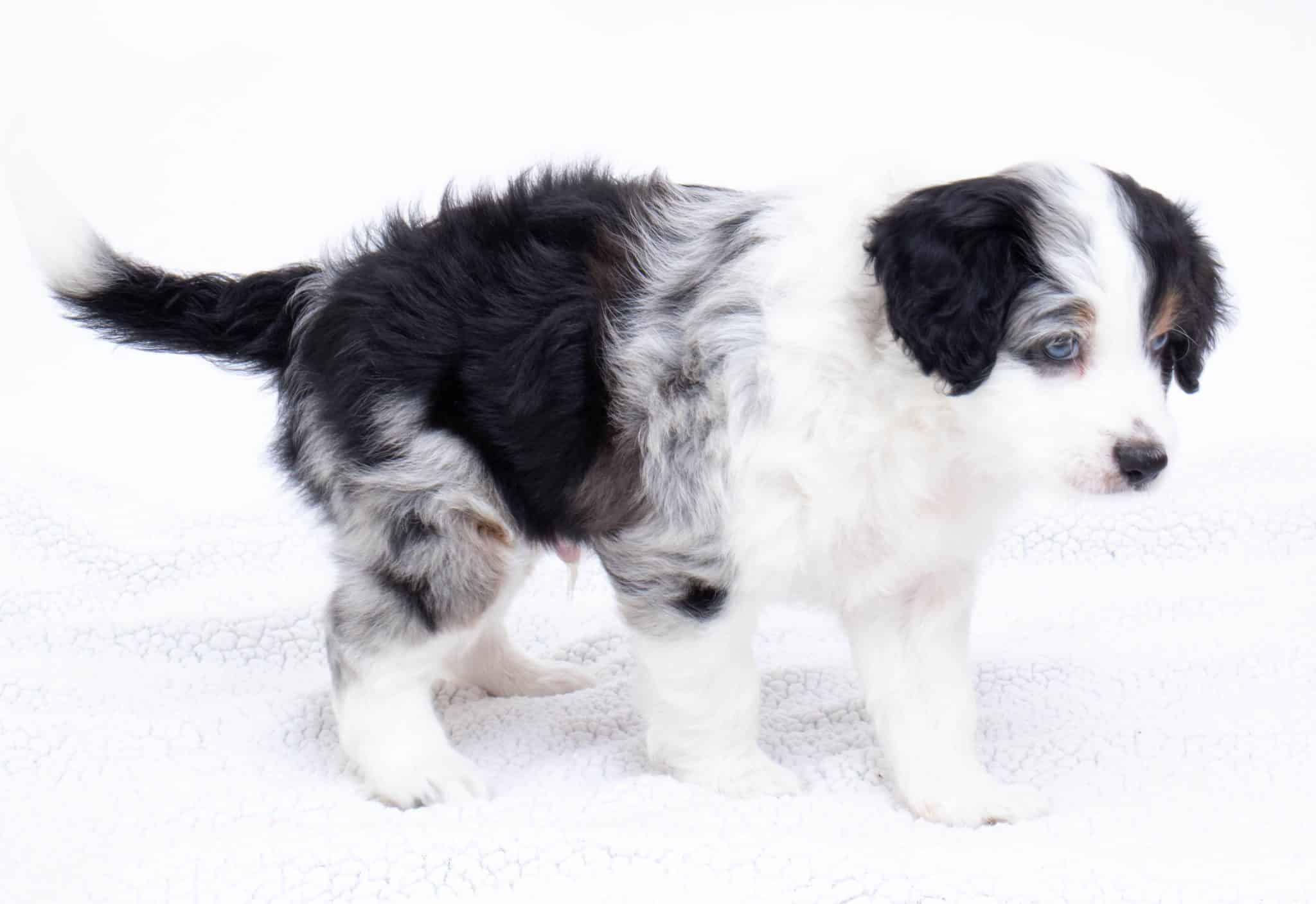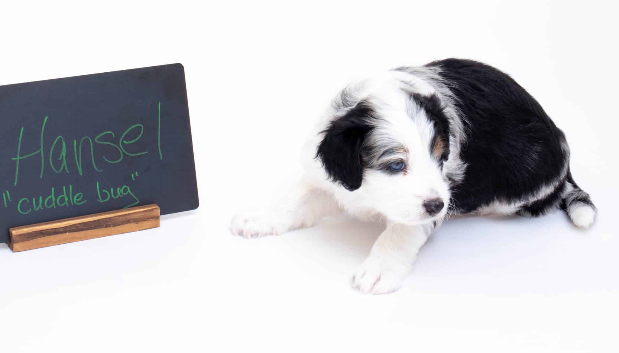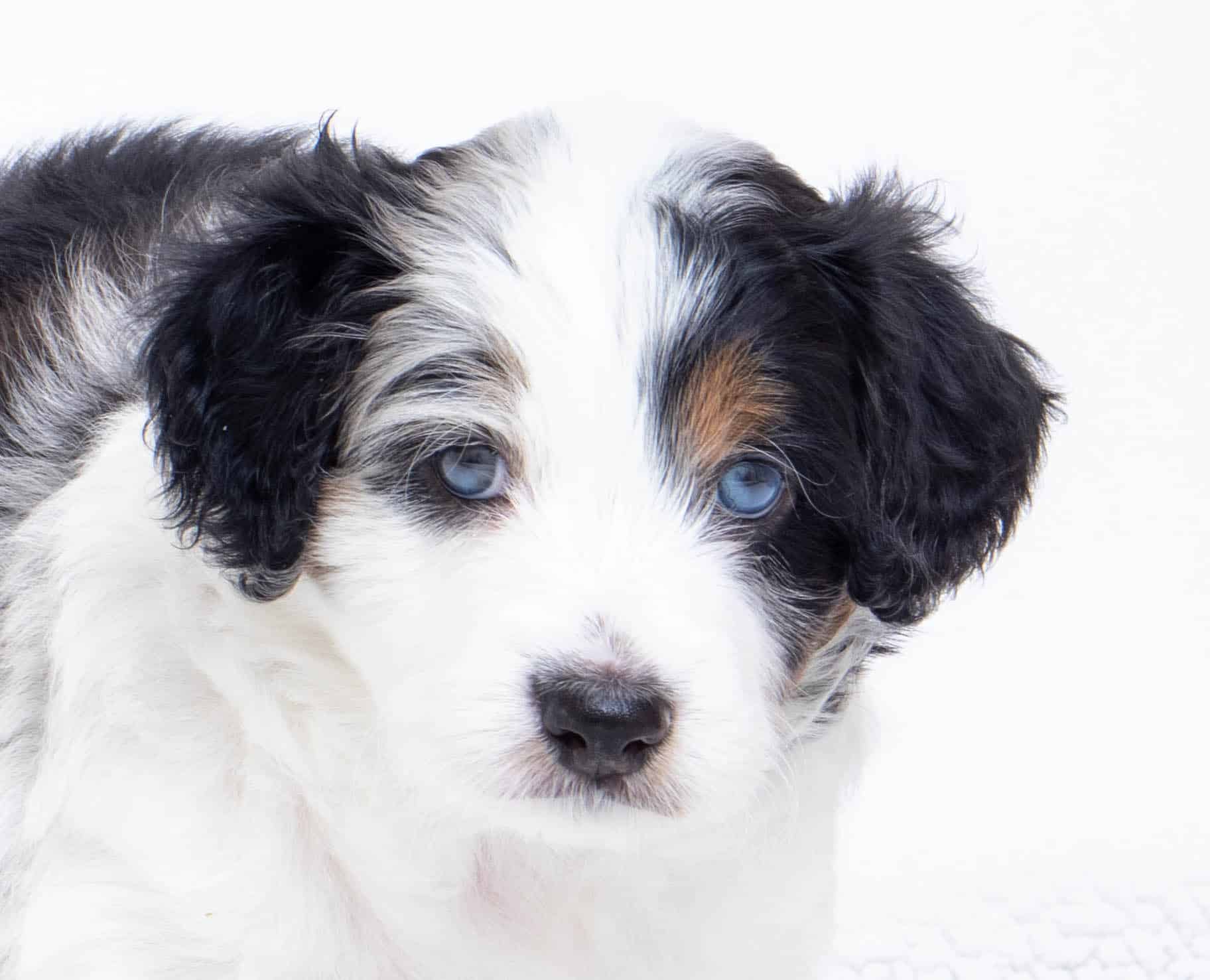 Hansel is a male Blue Merle w/ White & Copper F1 AussieDoodle puppy.