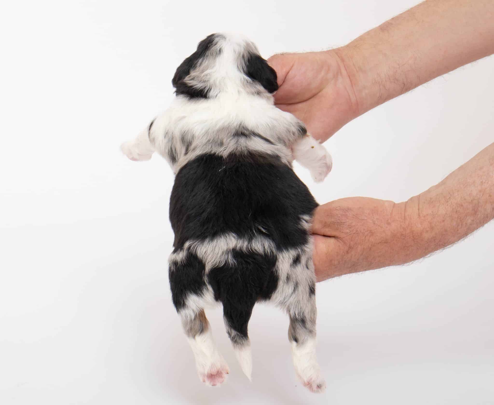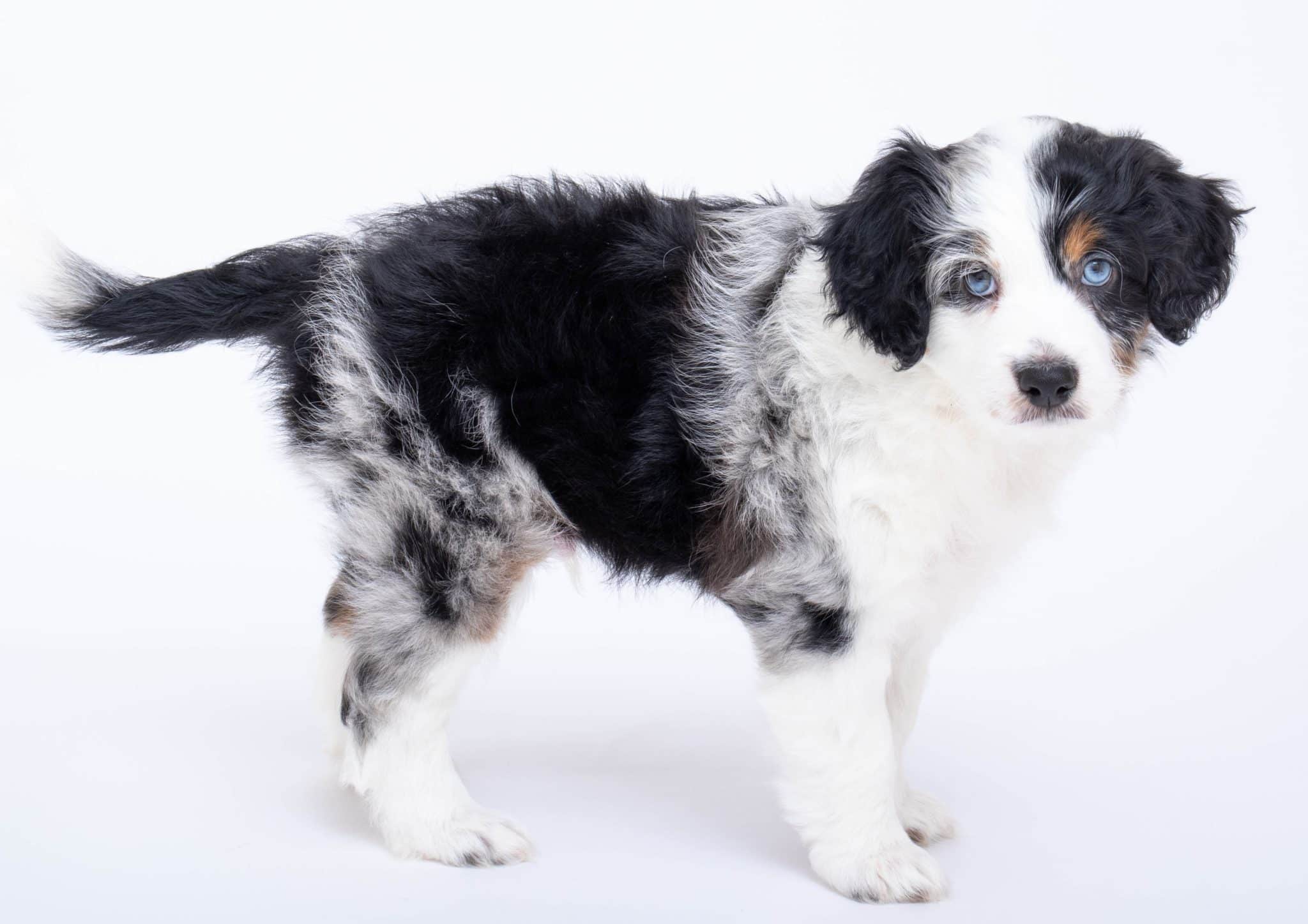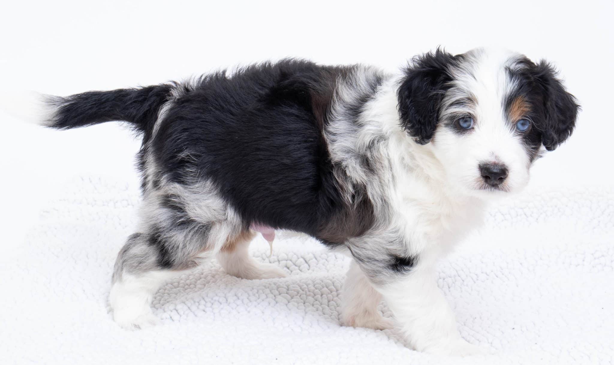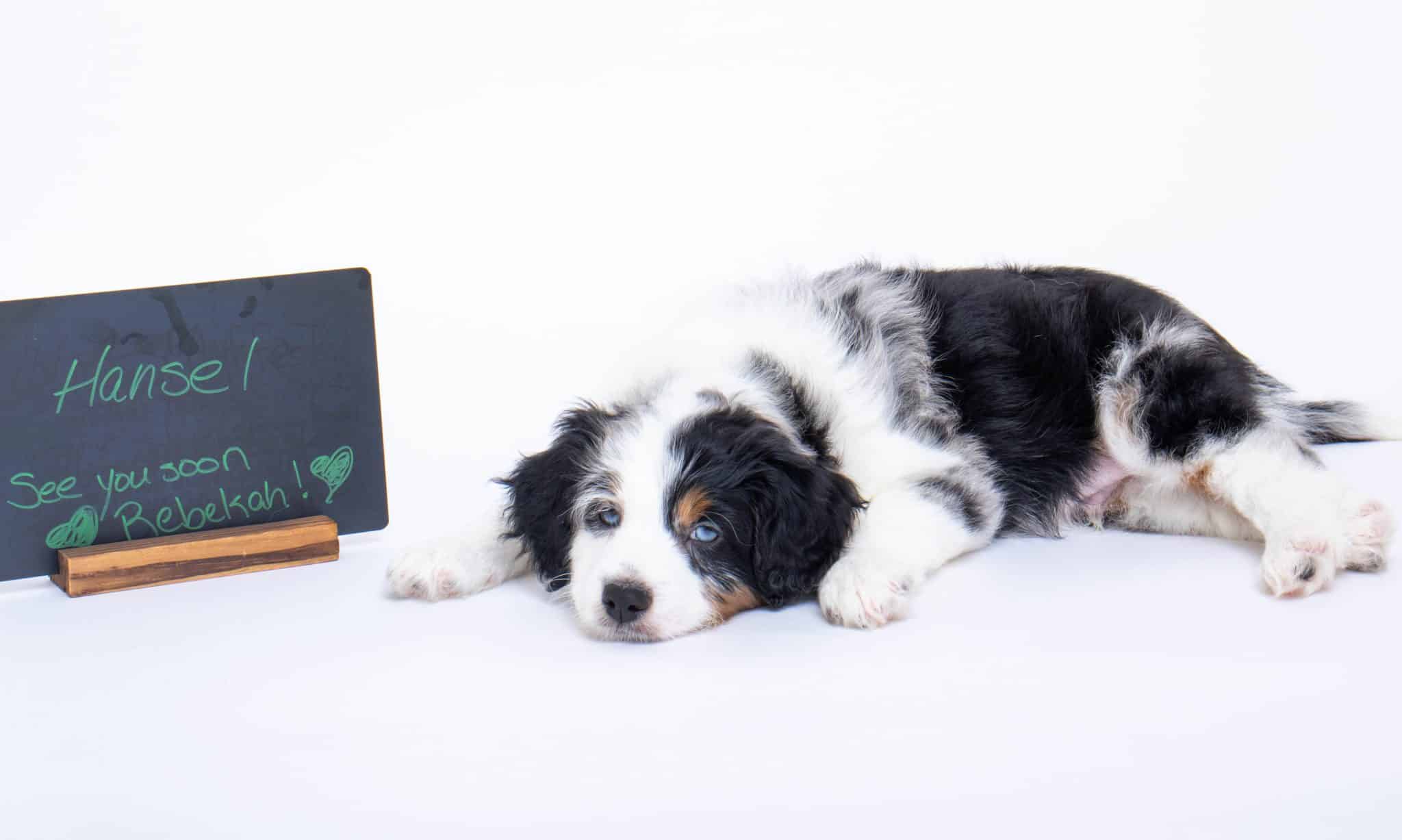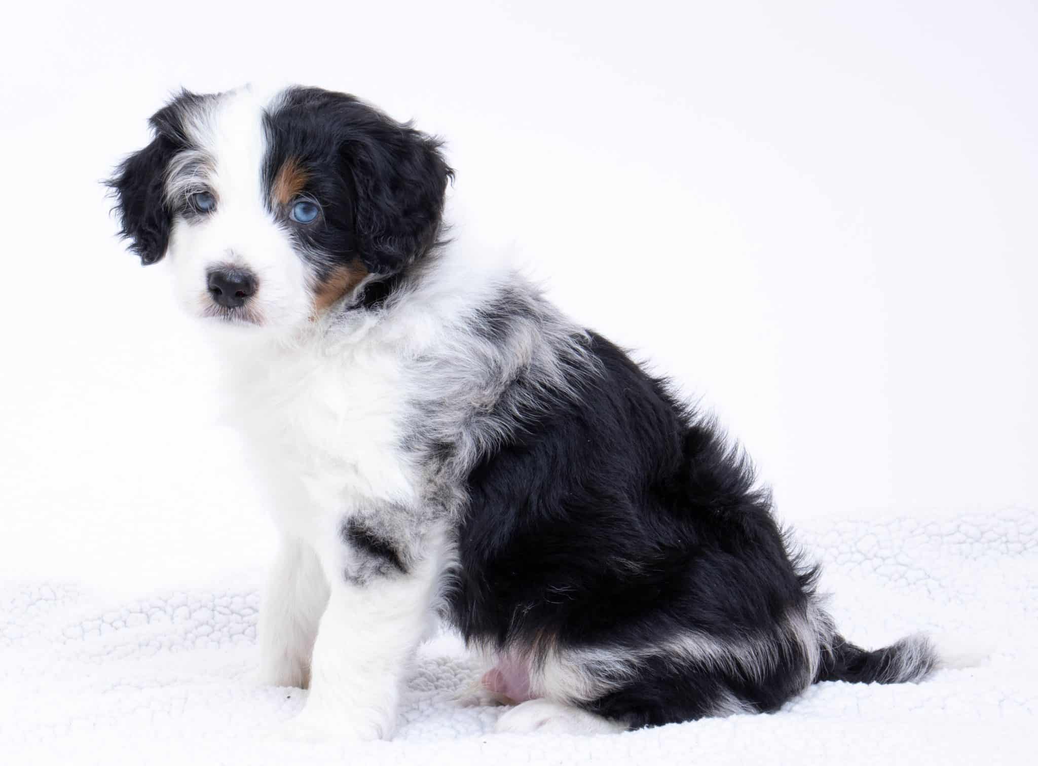 Hansel is a male Blue Merle w/ White & Copper F1 AussieDoodle puppy.