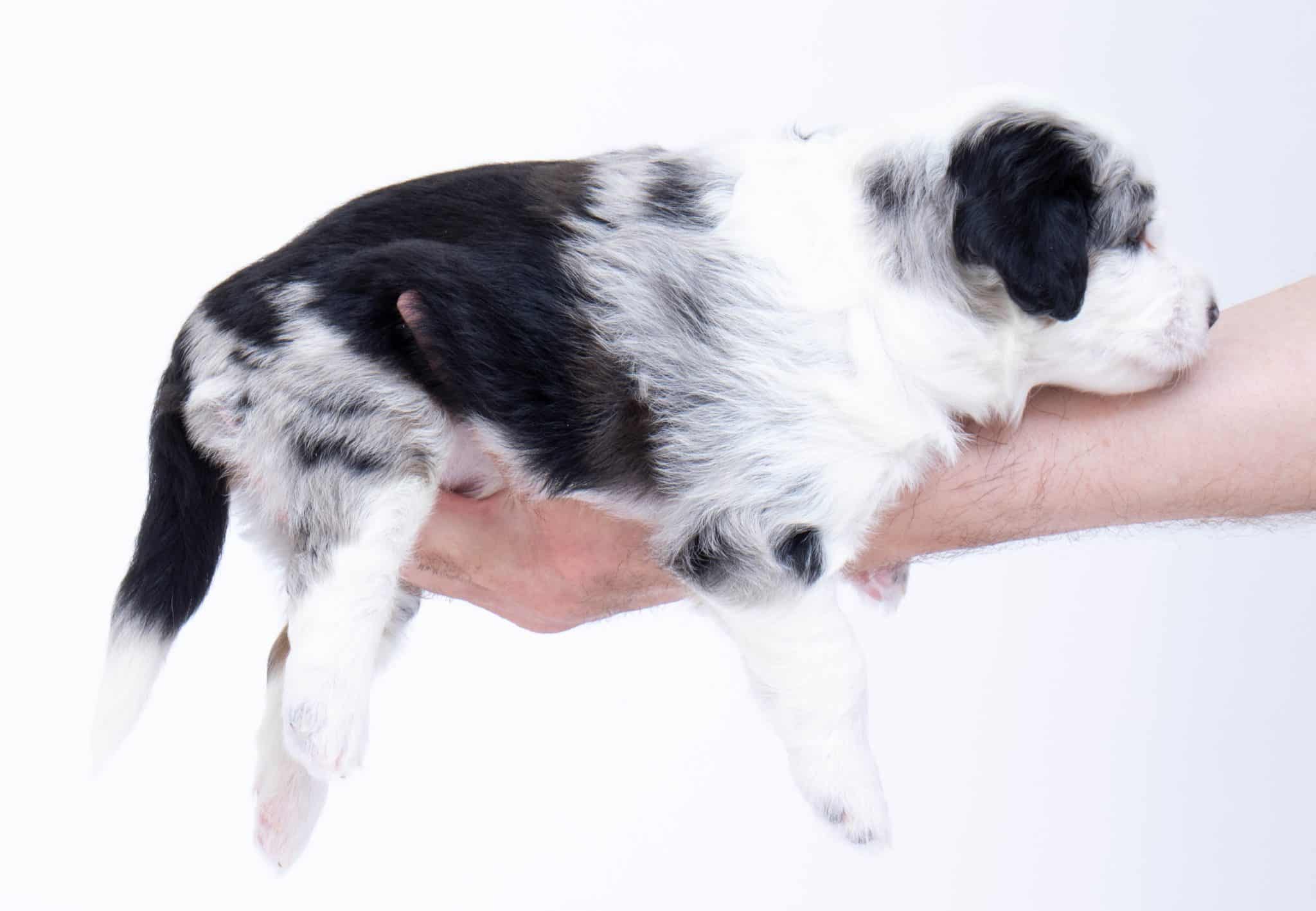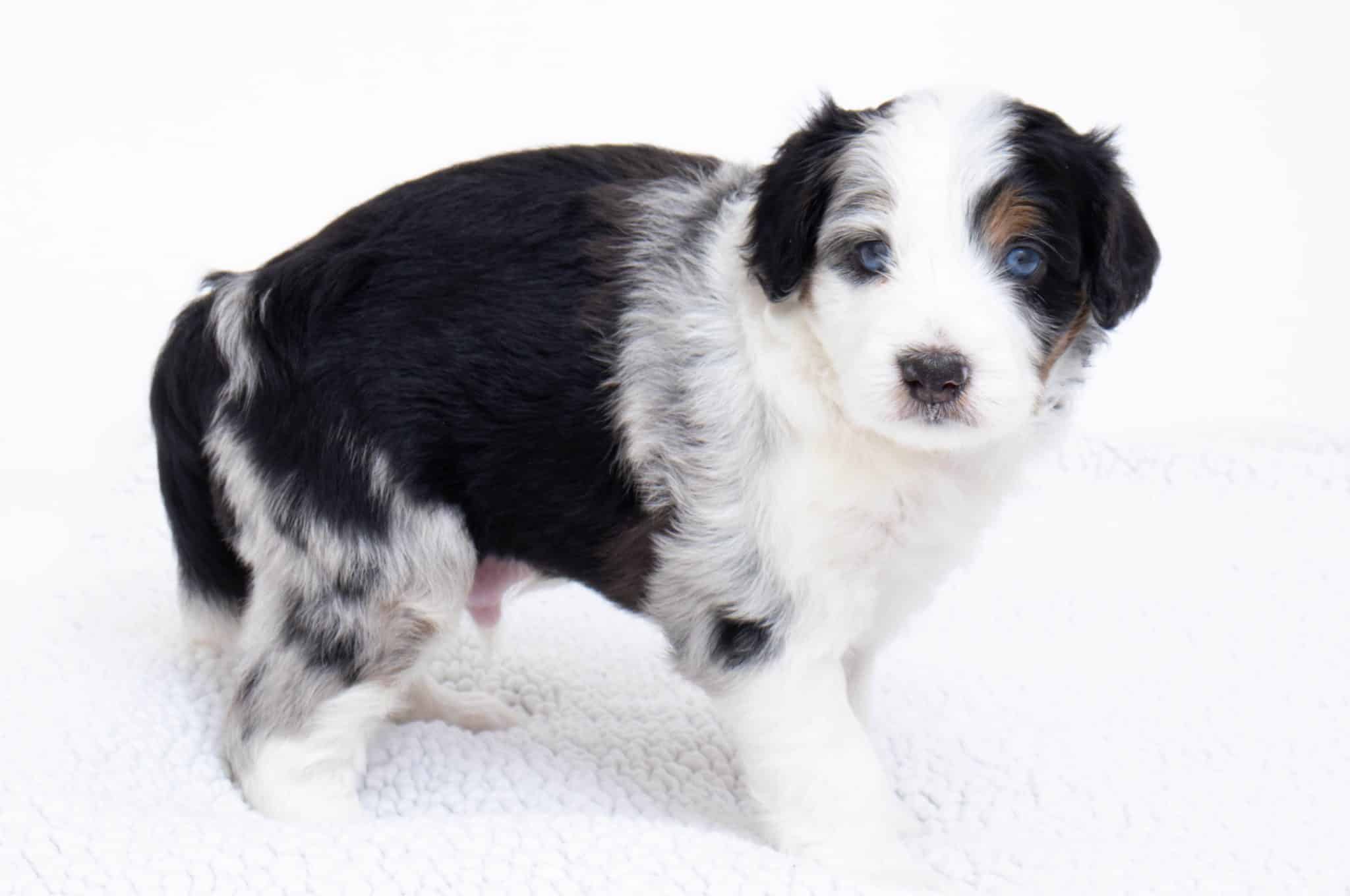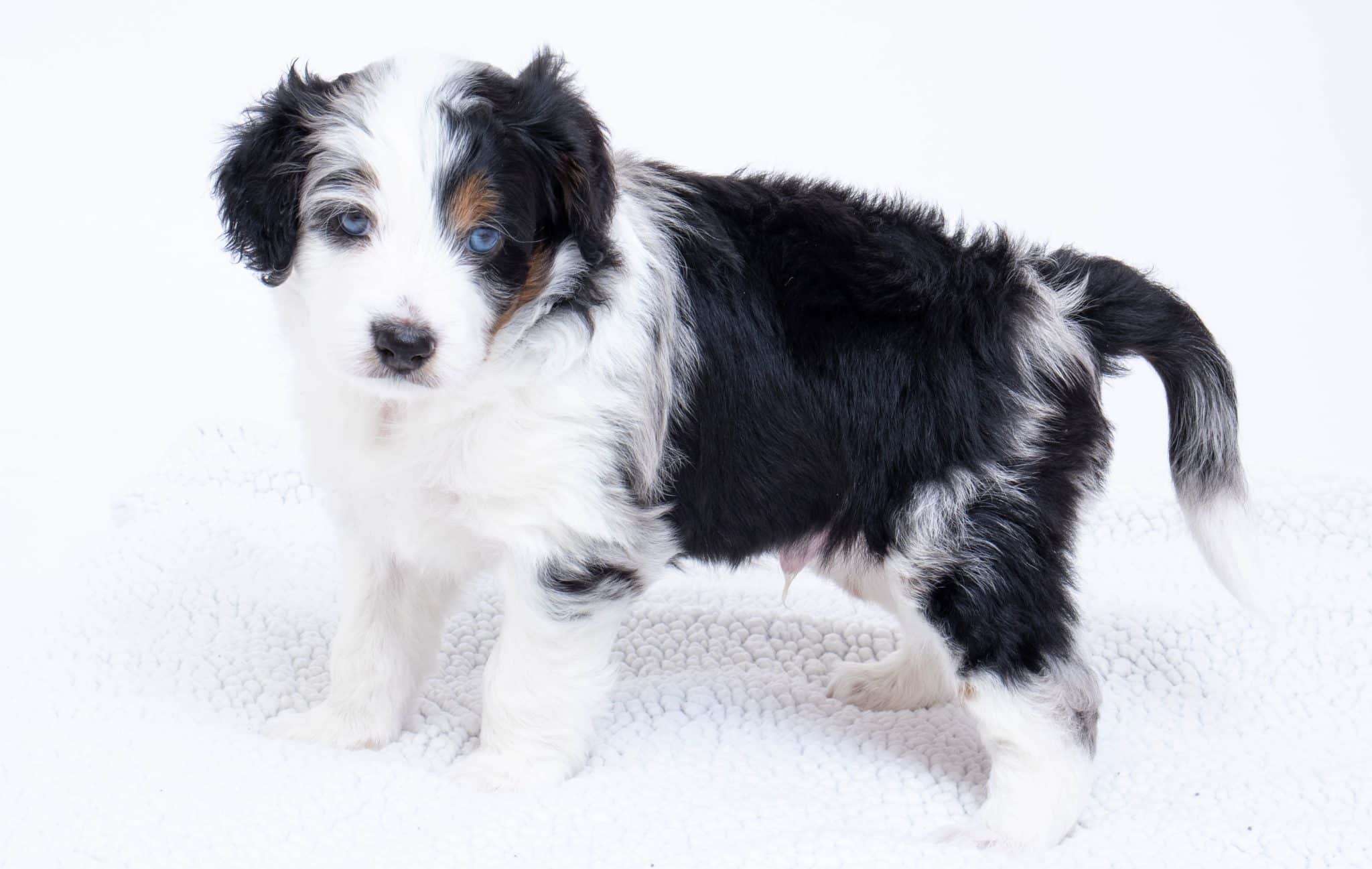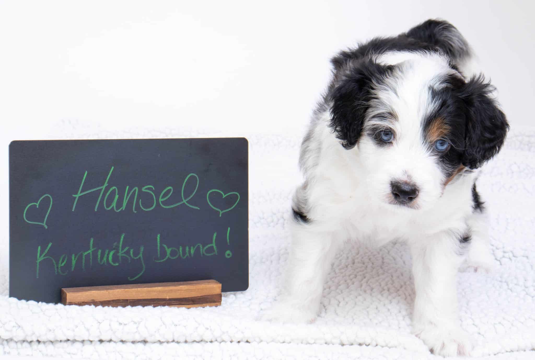Hansel is a male Blue Merle w/ White & Copper F1 AussieDoodle puppy.