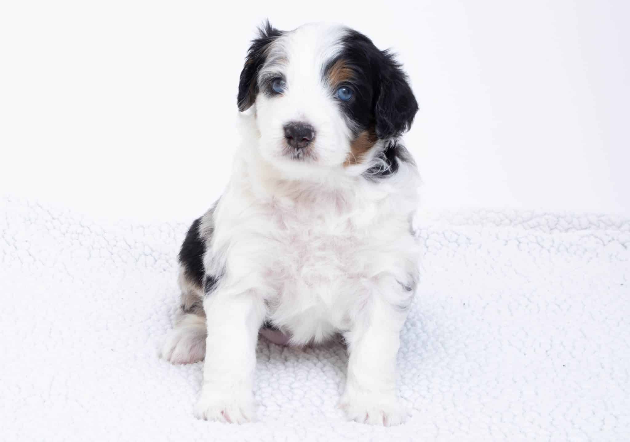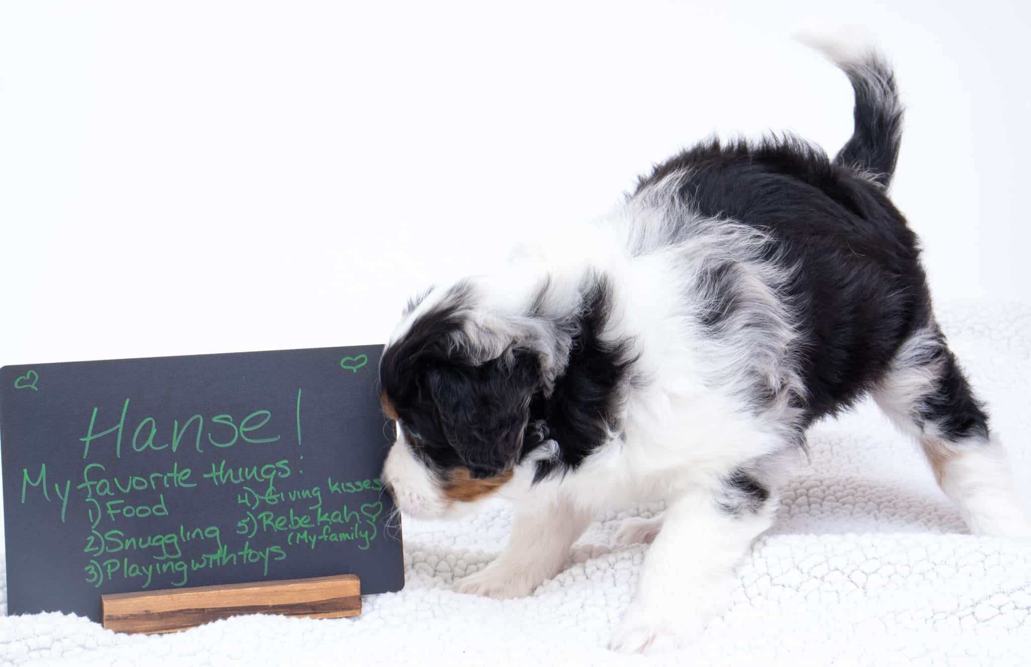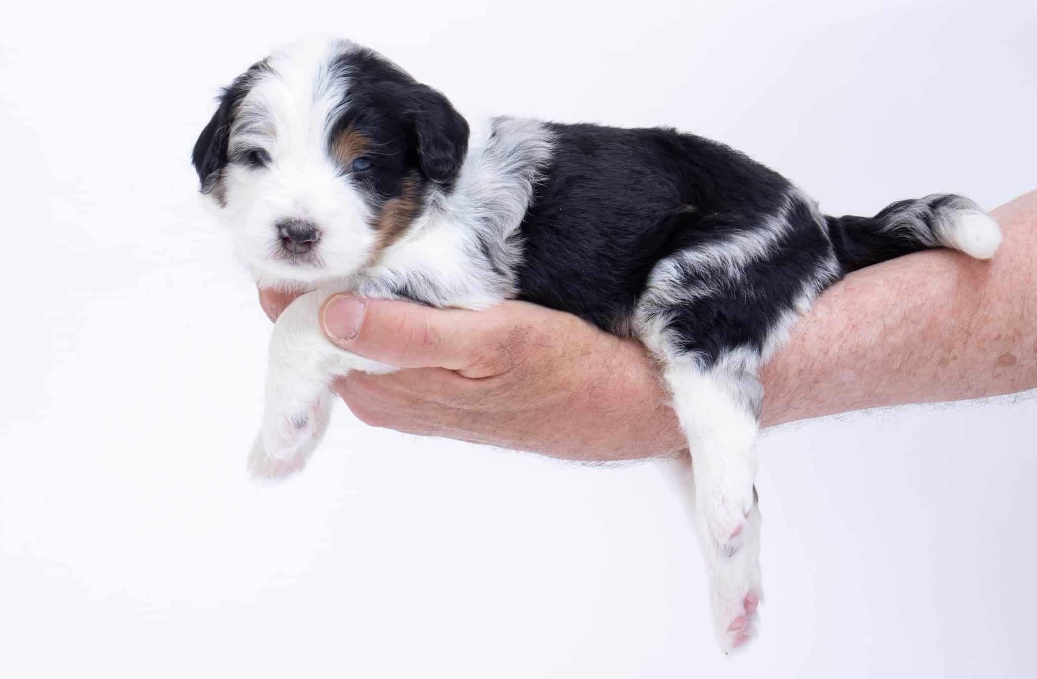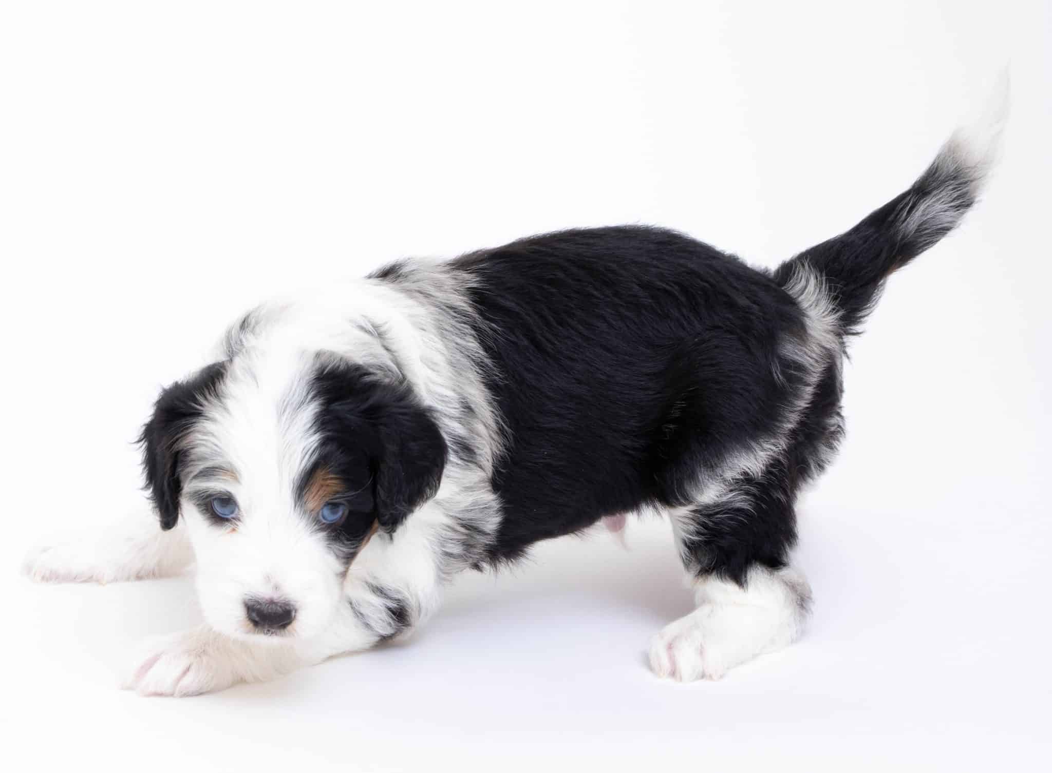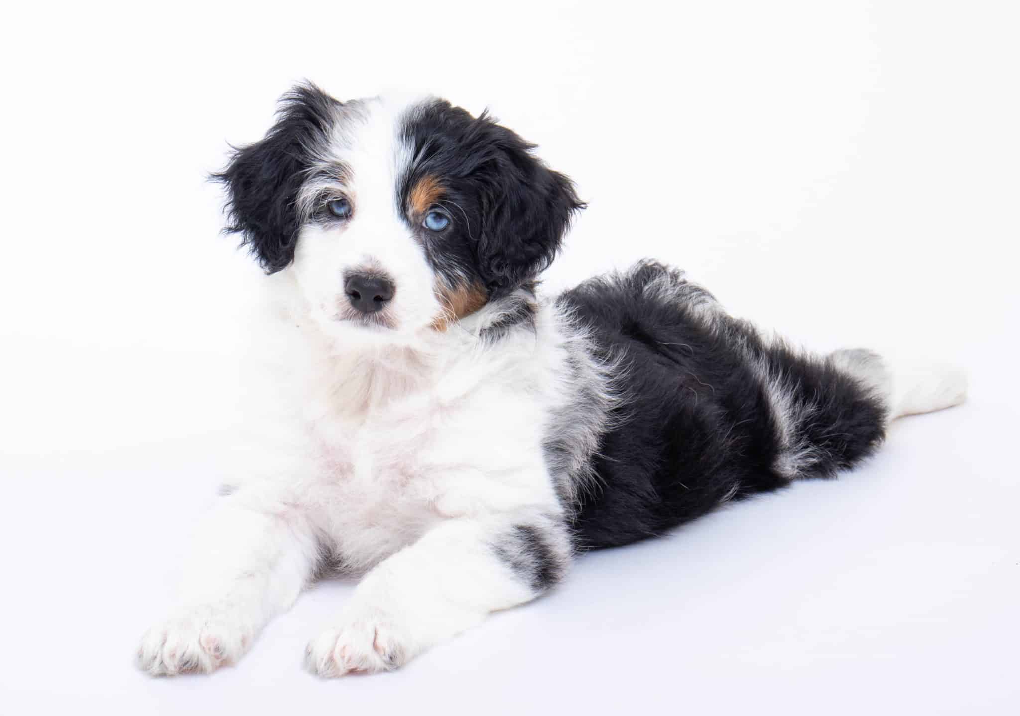 Hansel is a male Blue Merle w/ White & Copper F1 AussieDoodle puppy.