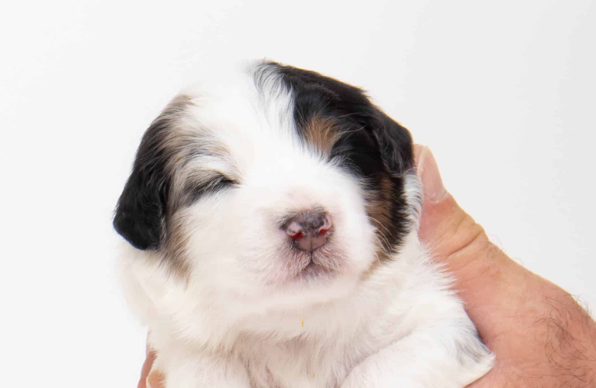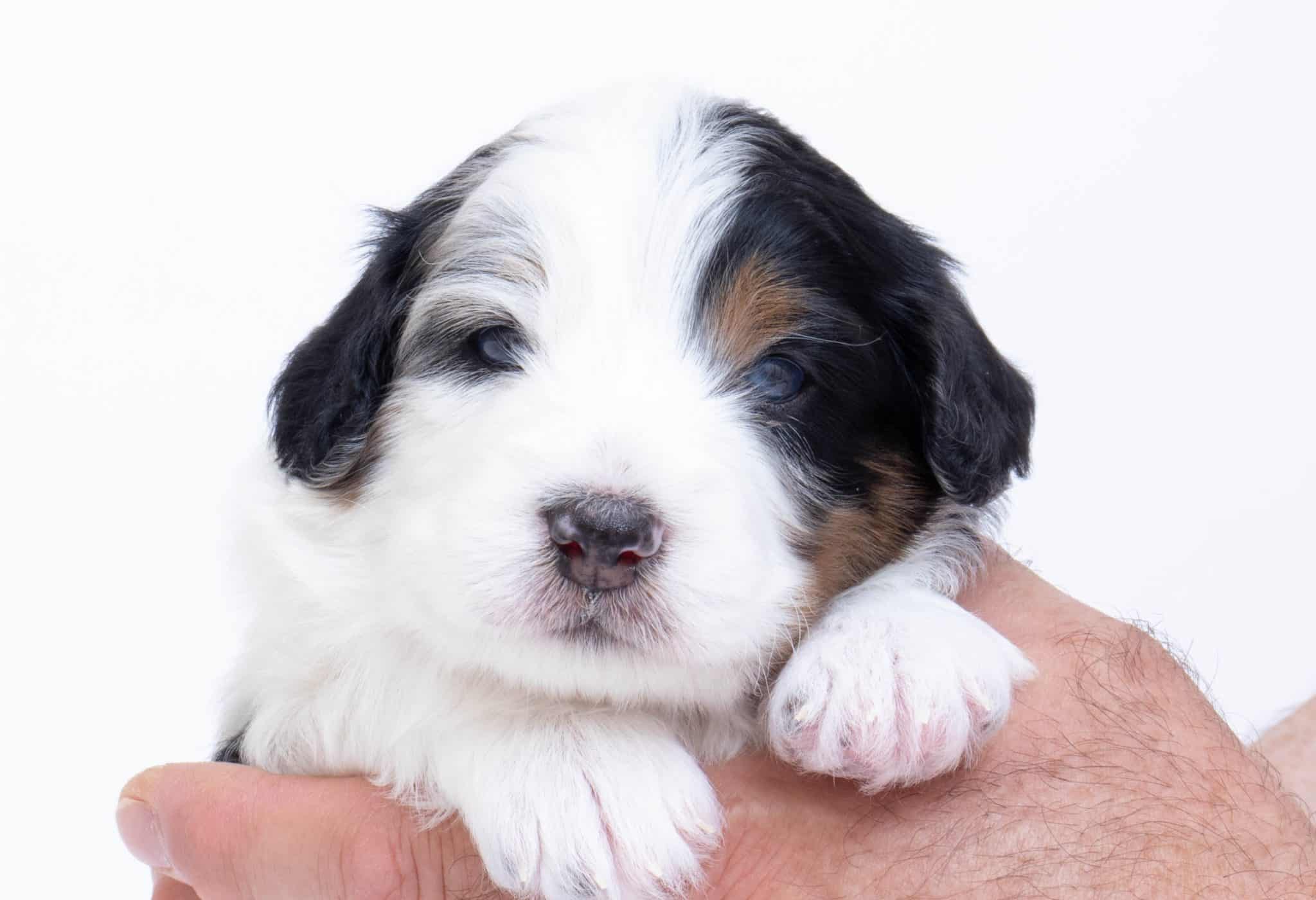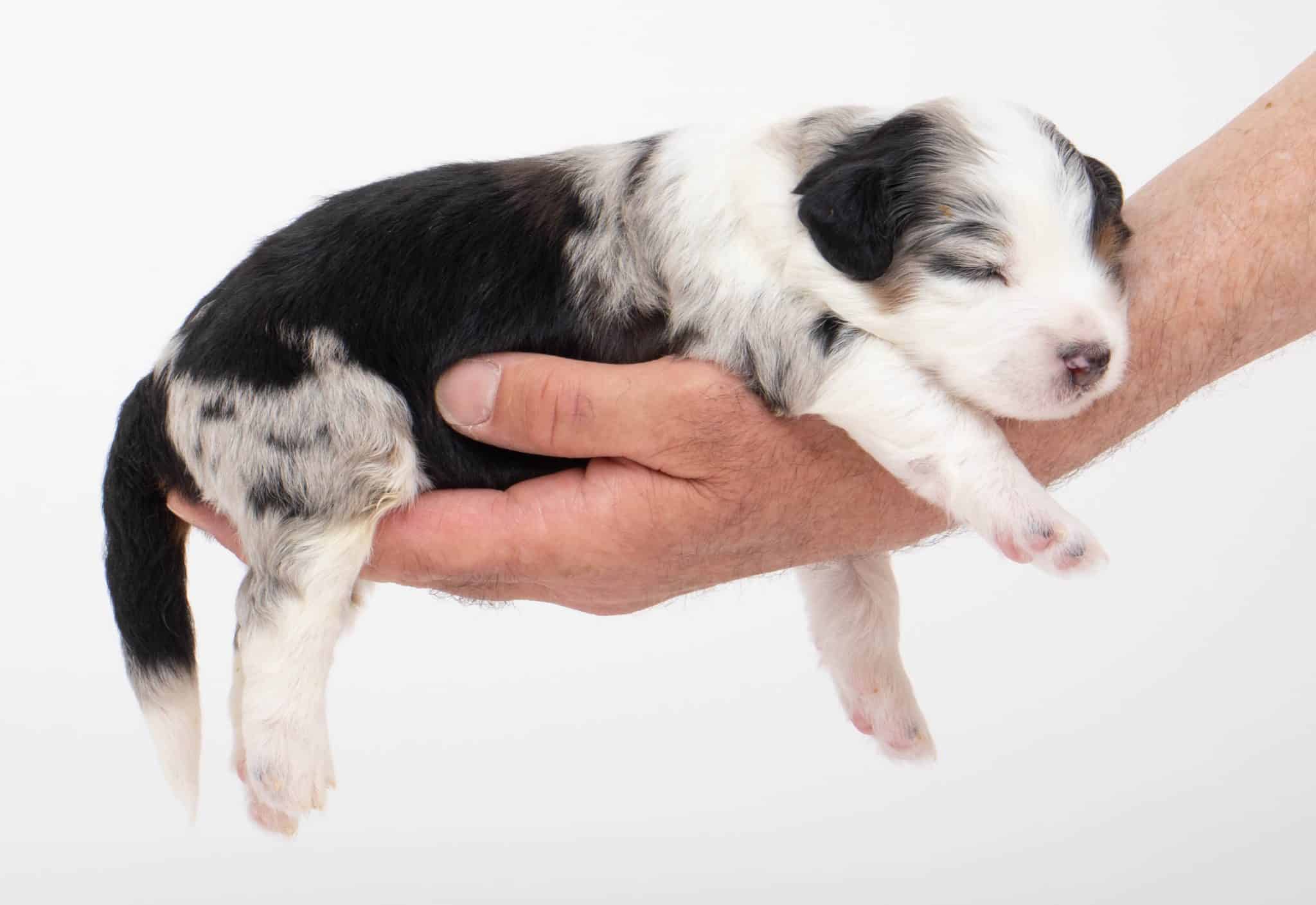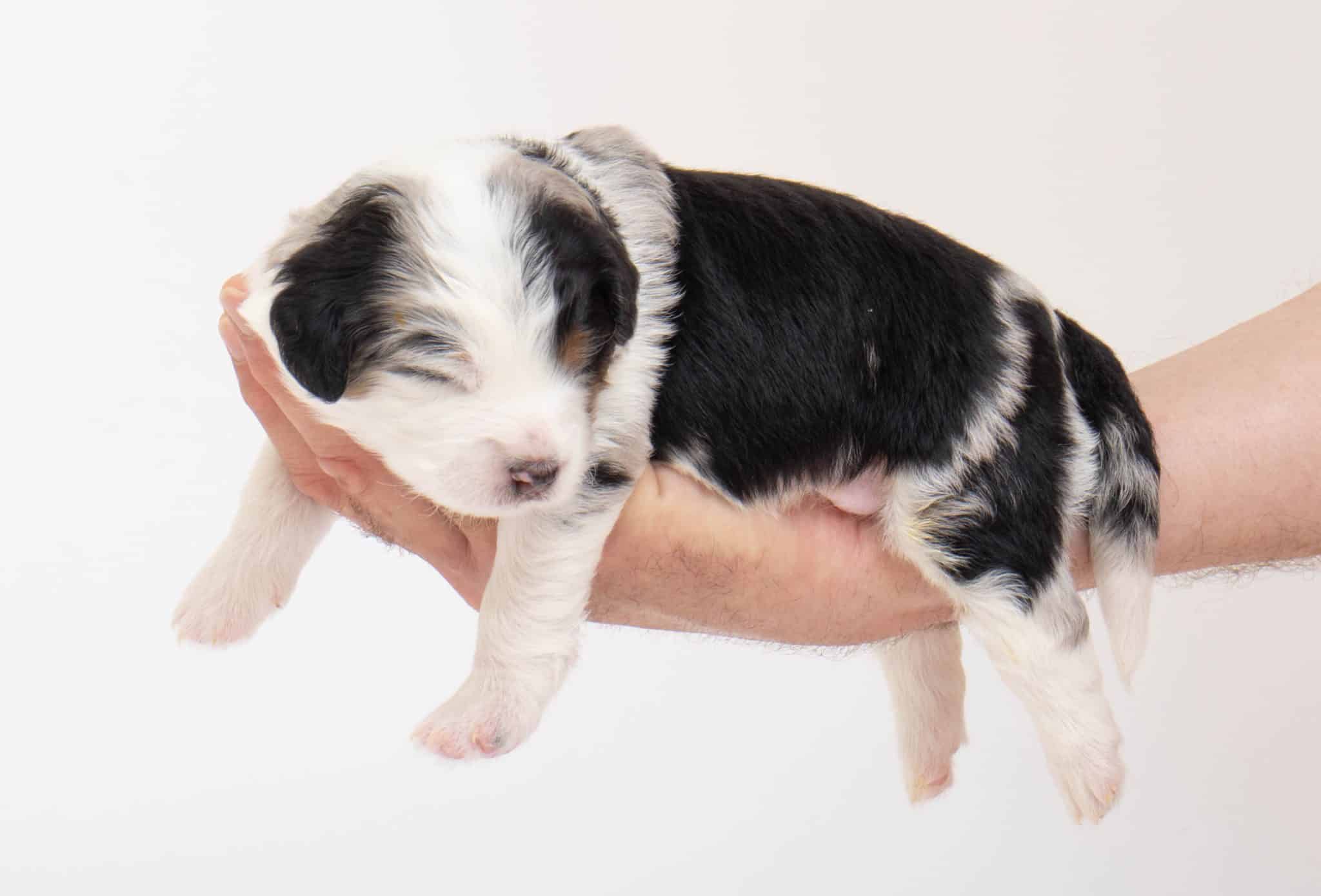 Hansel is a male Blue Merle w/ White & Copper F1 AussieDoodle puppy.