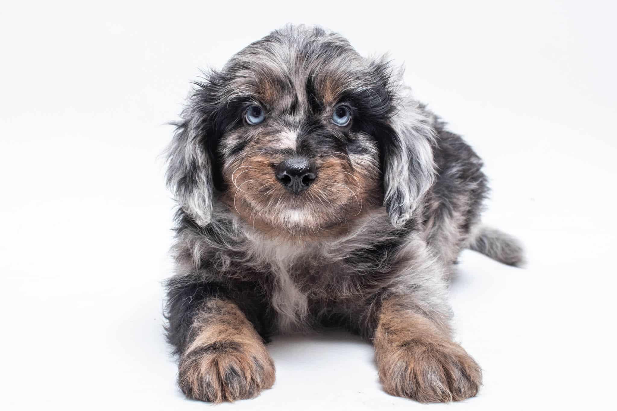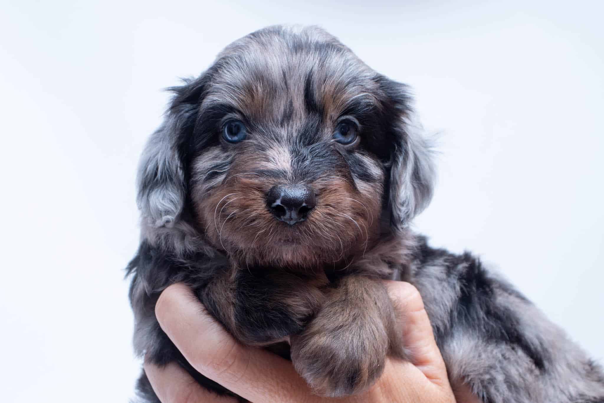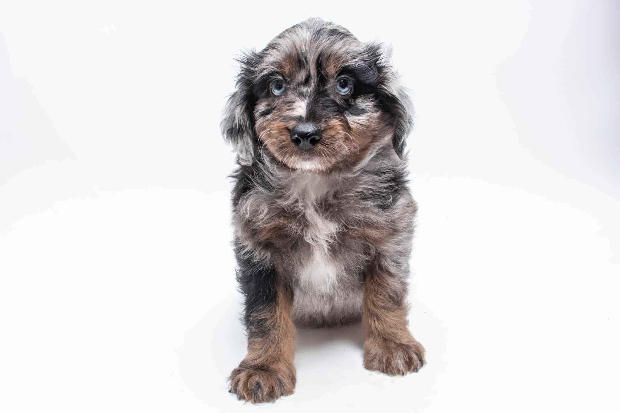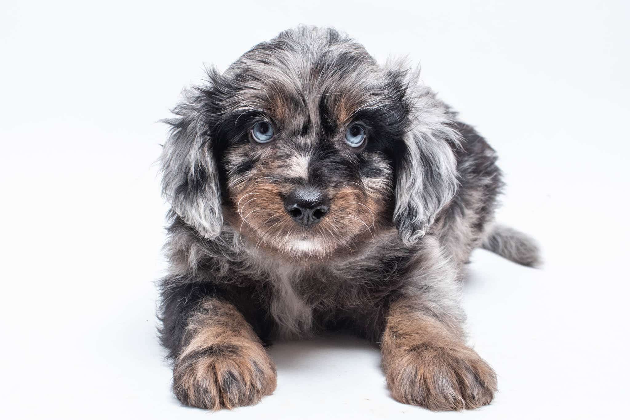 Fynn is a male Phantom Blue Merle F1 AussieDoodle puppy.