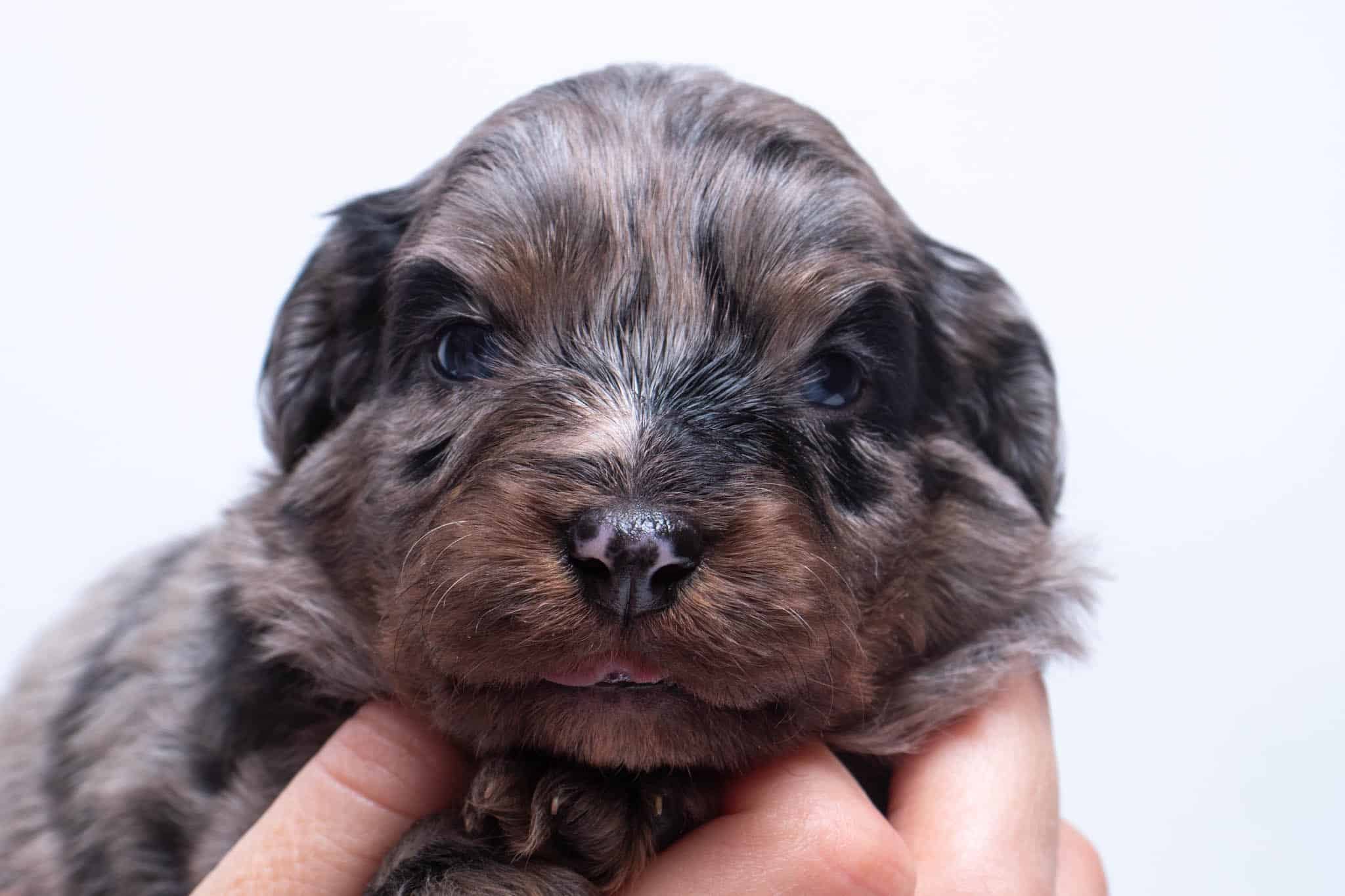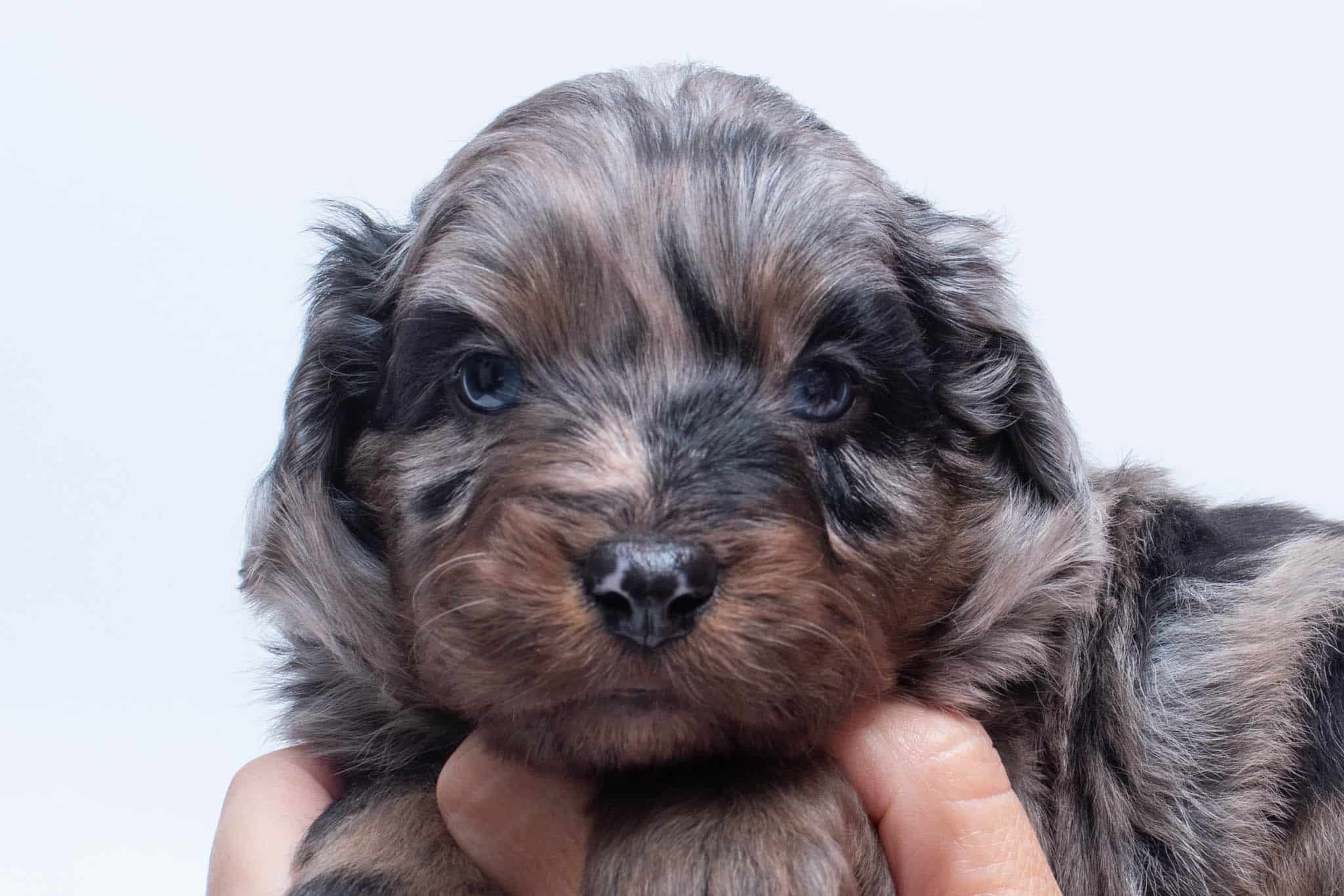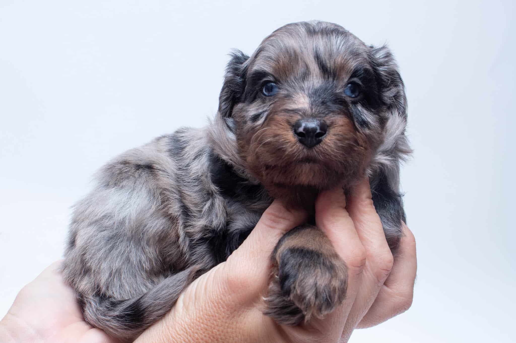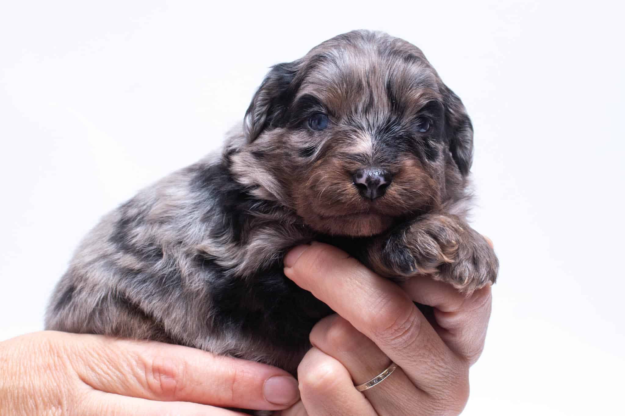 Fynn is a male Phantom Blue Merle F1 AussieDoodle puppy.