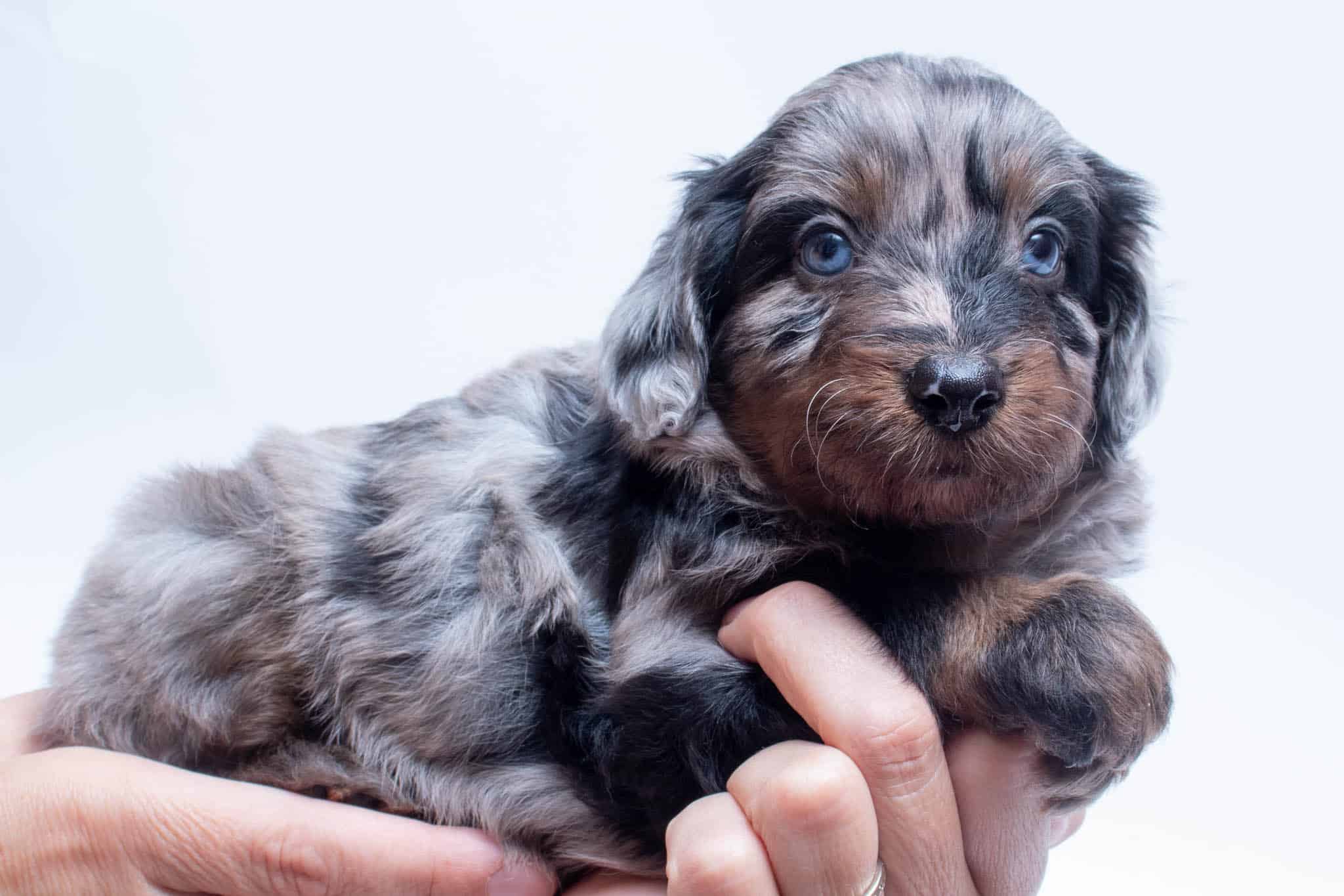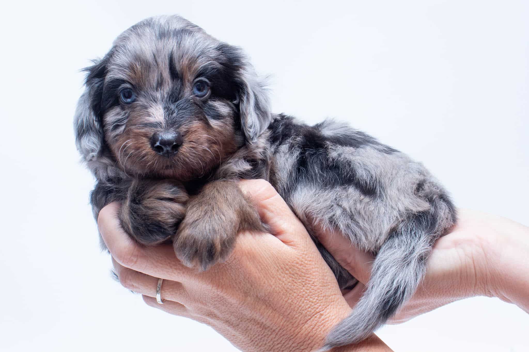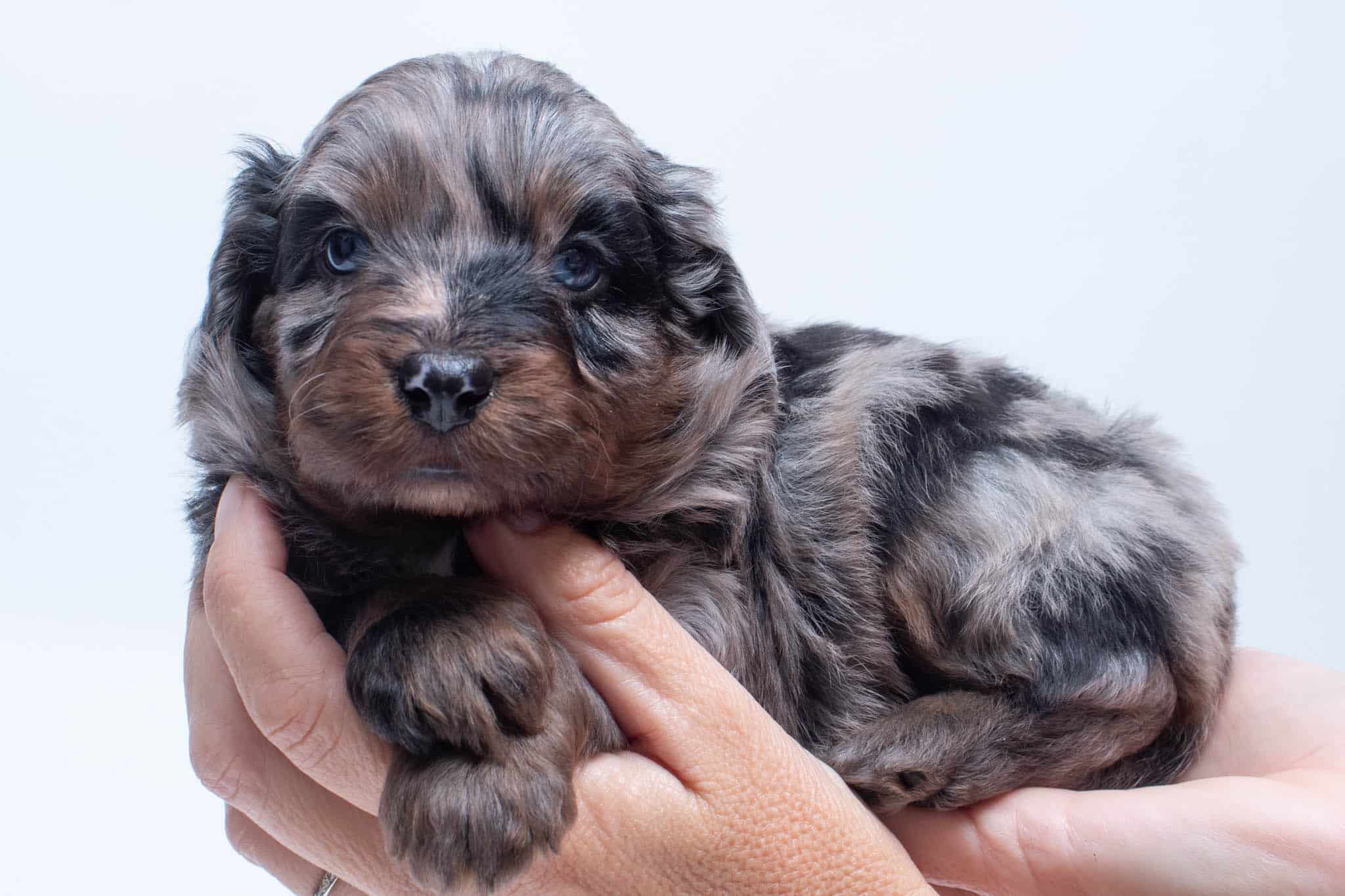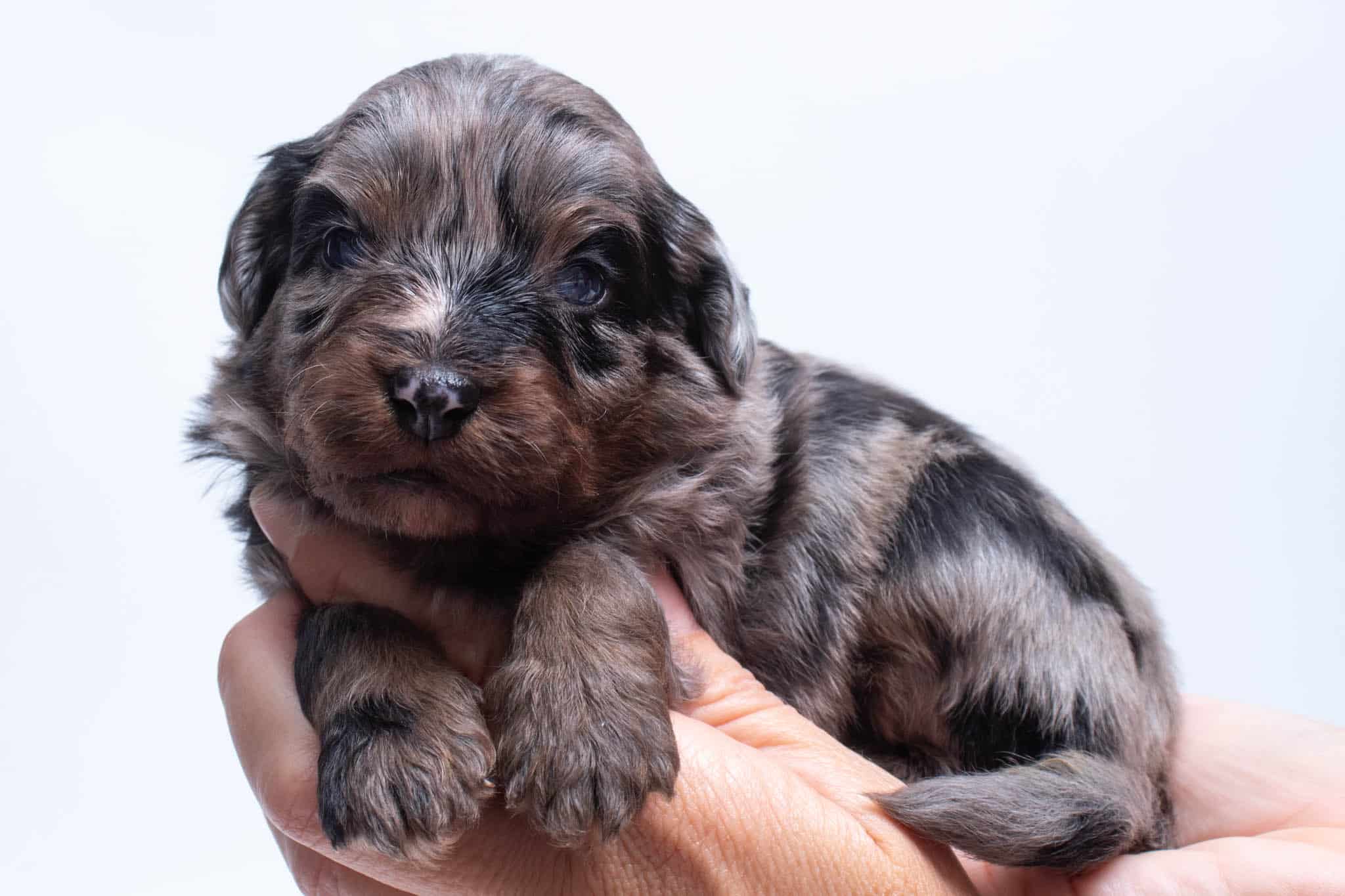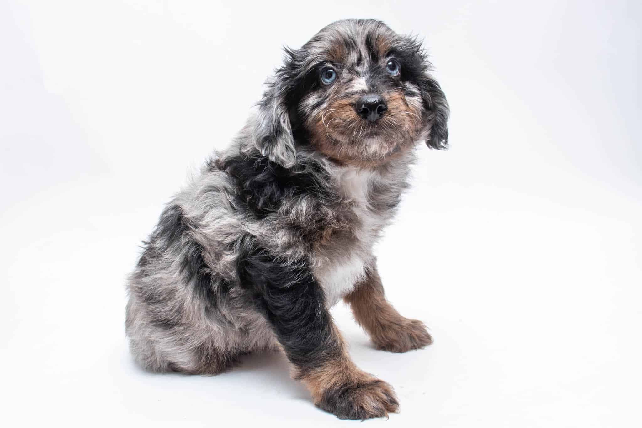 Fynn is a male Phantom Blue Merle F1 AussieDoodle puppy.