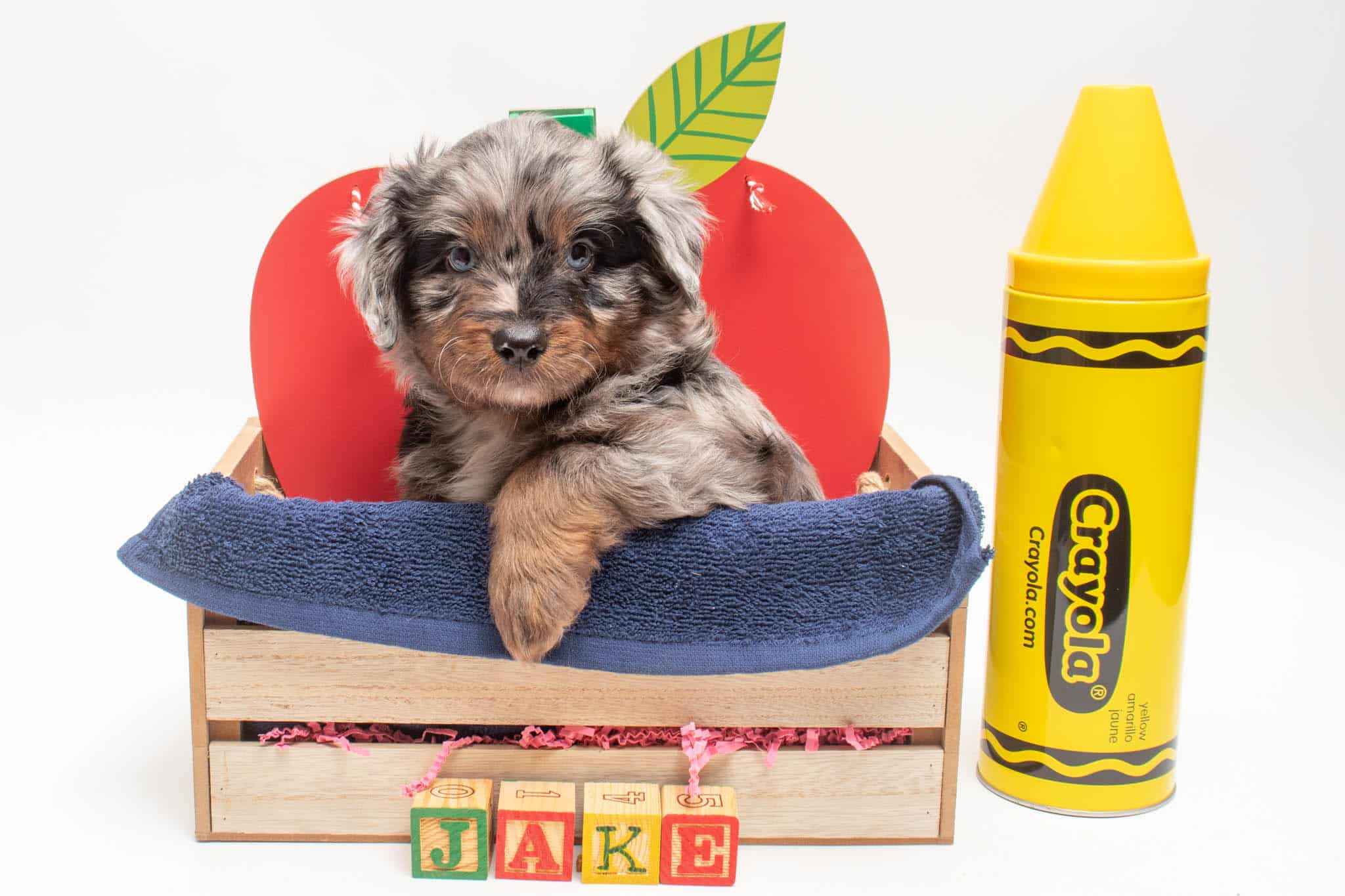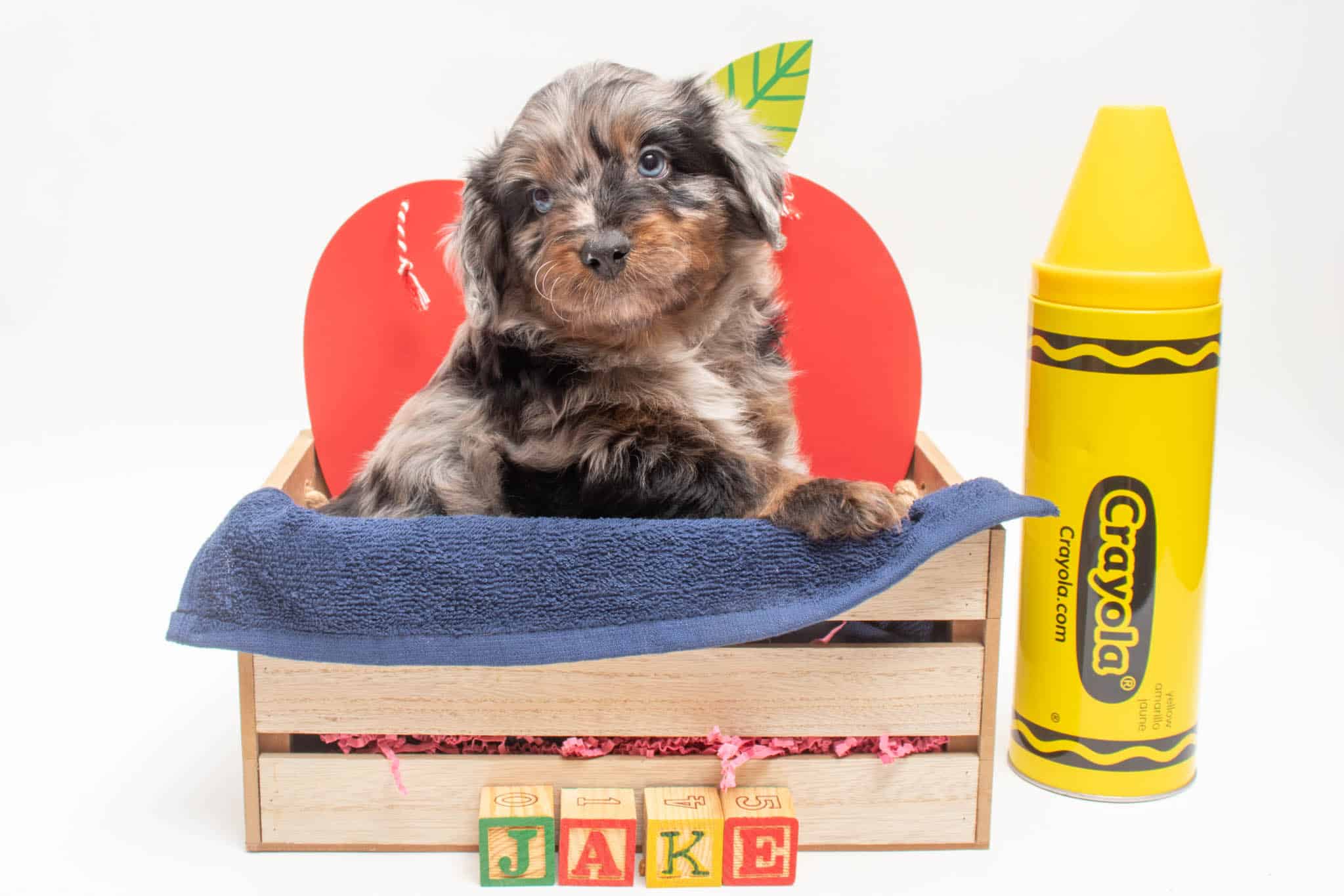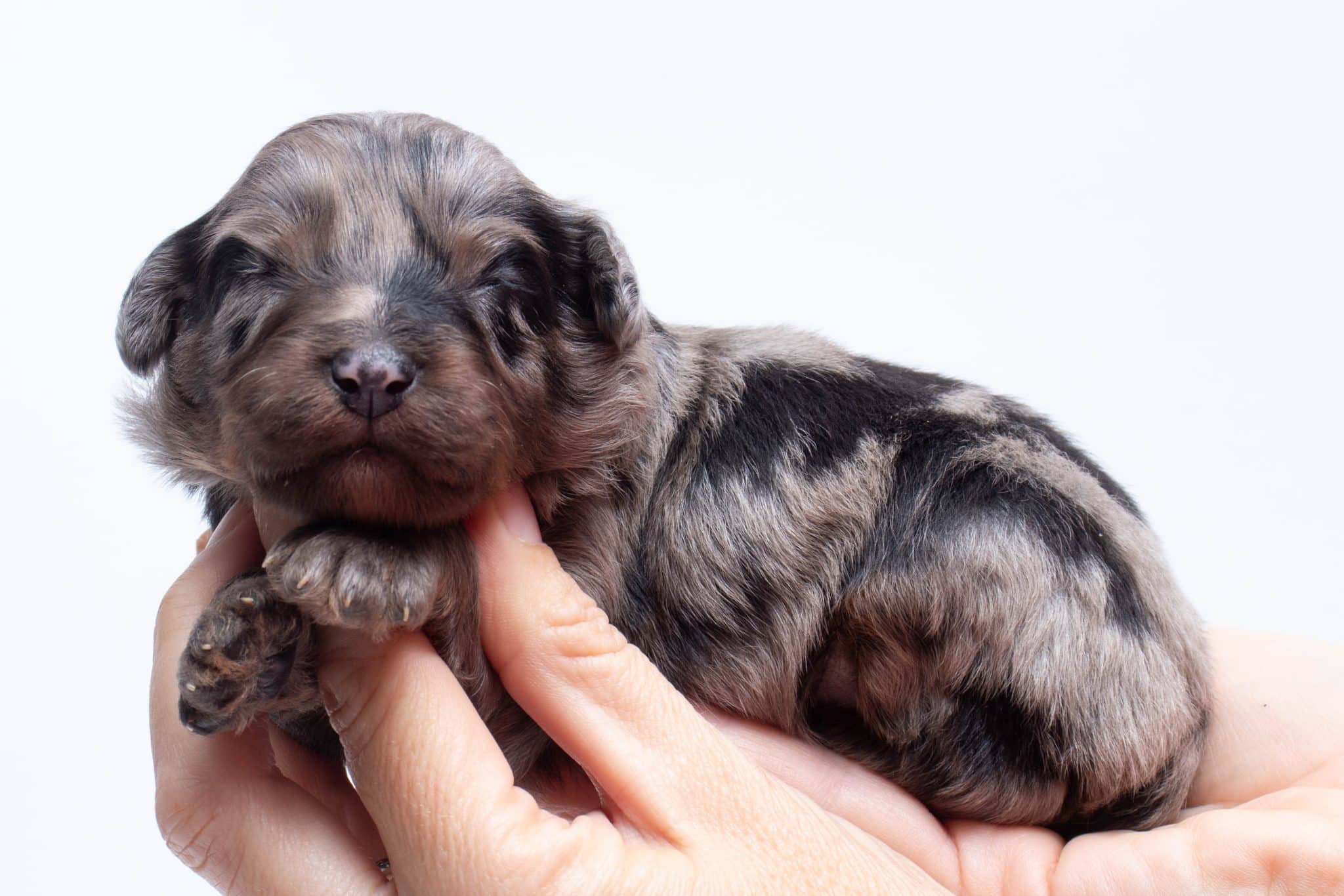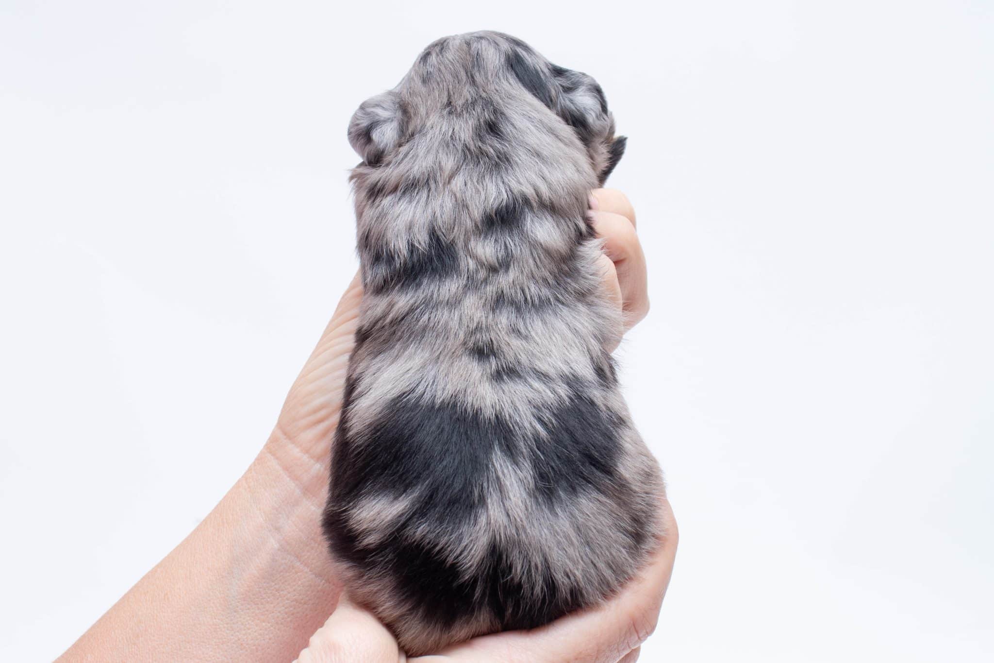 Fynn is a male Phantom Blue Merle F1 AussieDoodle puppy.