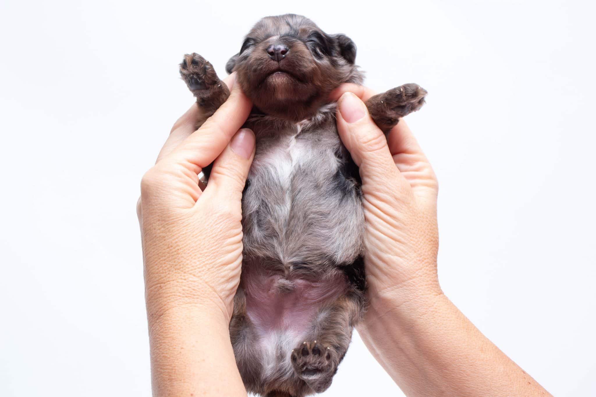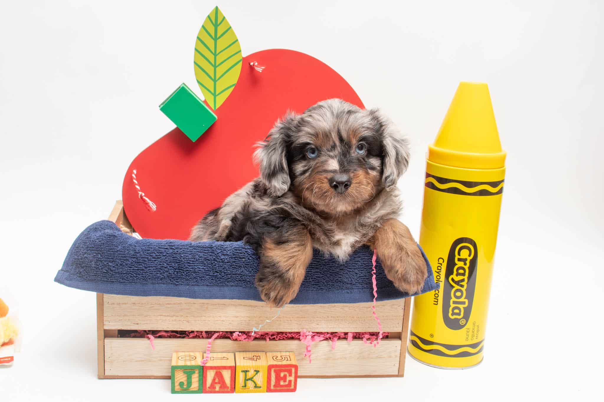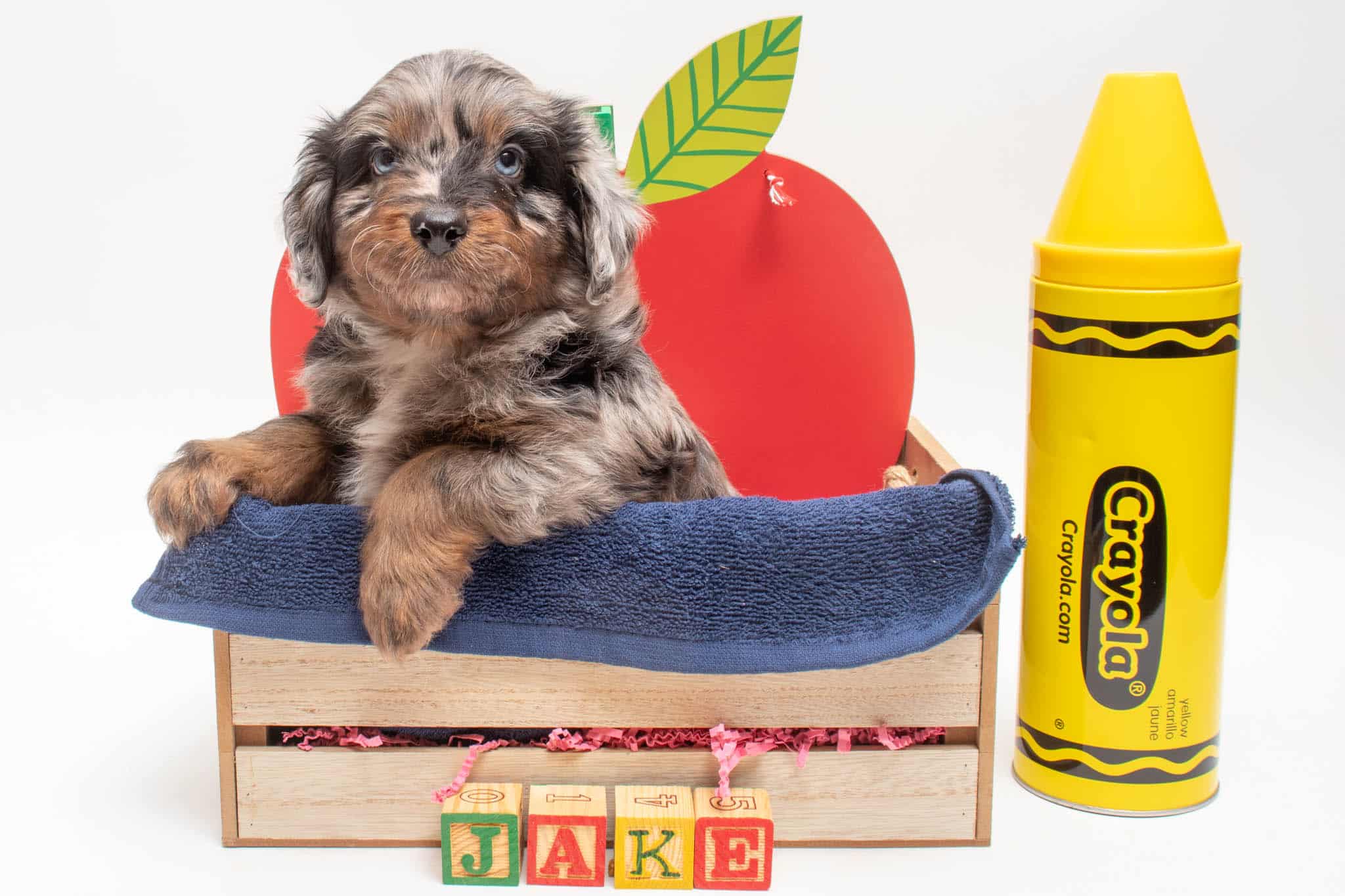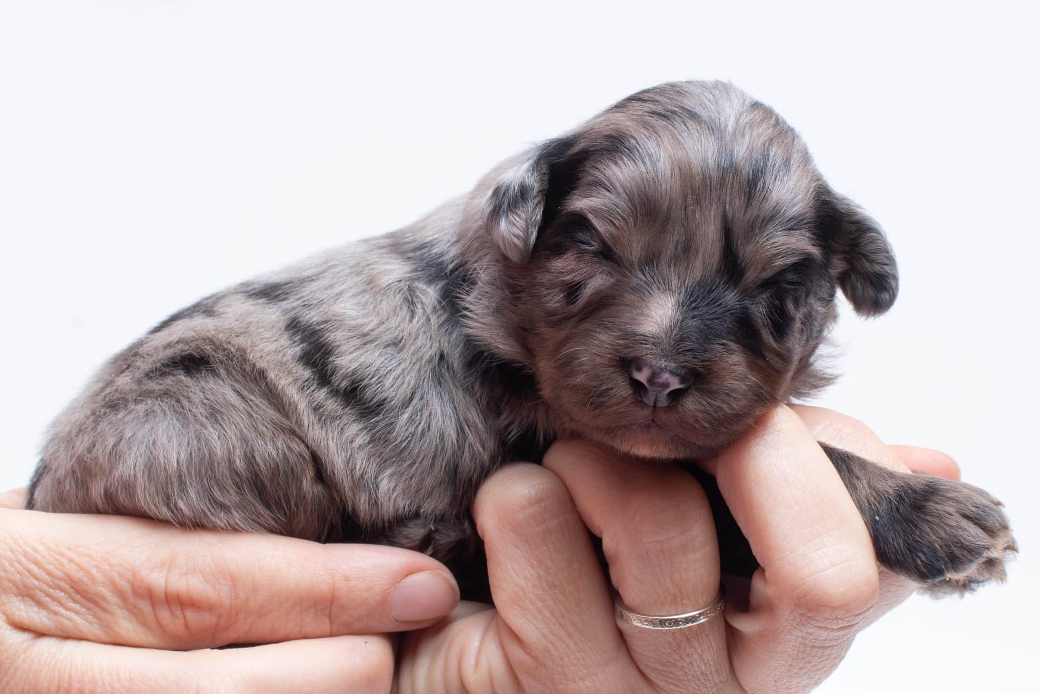 Fynn is a male Phantom Blue Merle F1 AussieDoodle puppy.