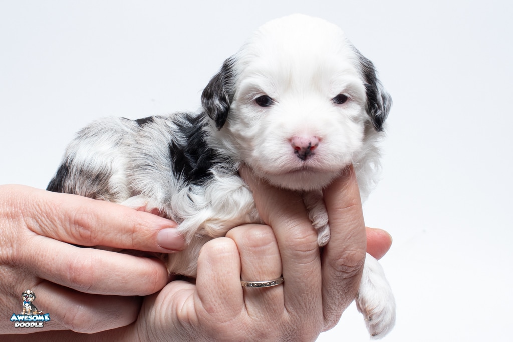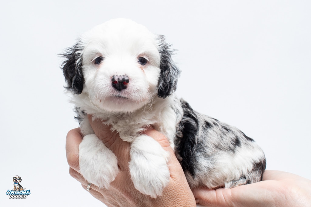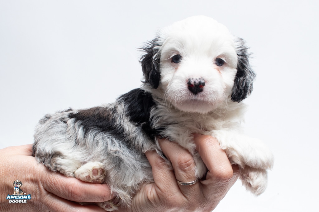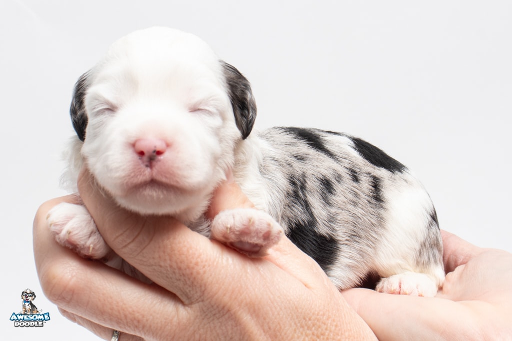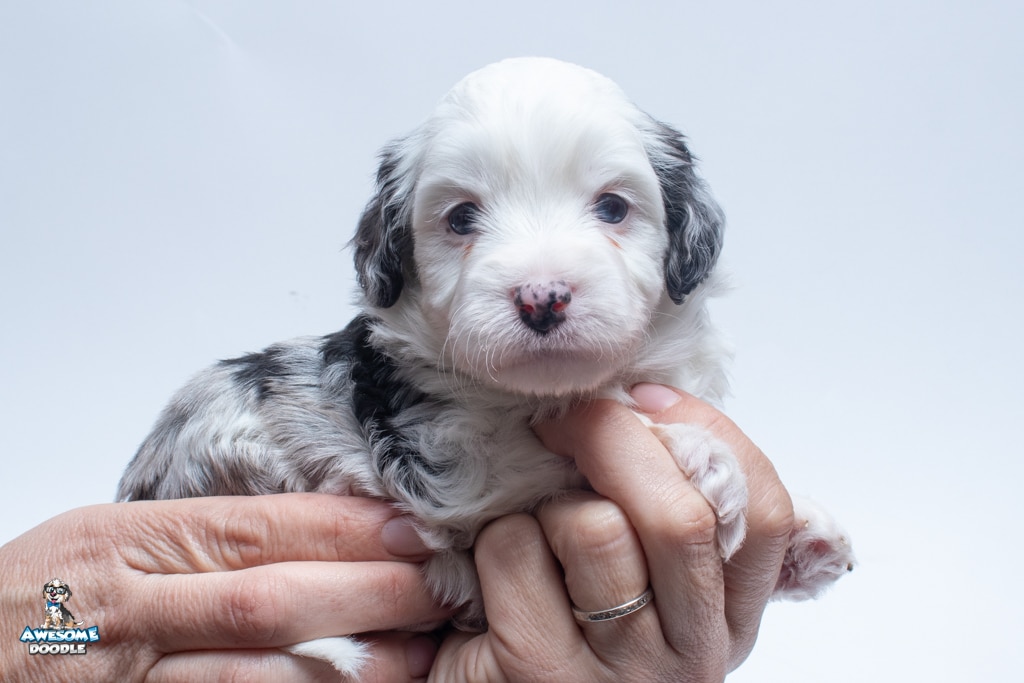 Kit Kat is a male Blue Merle w/White F1 AussieDoodle puppy.