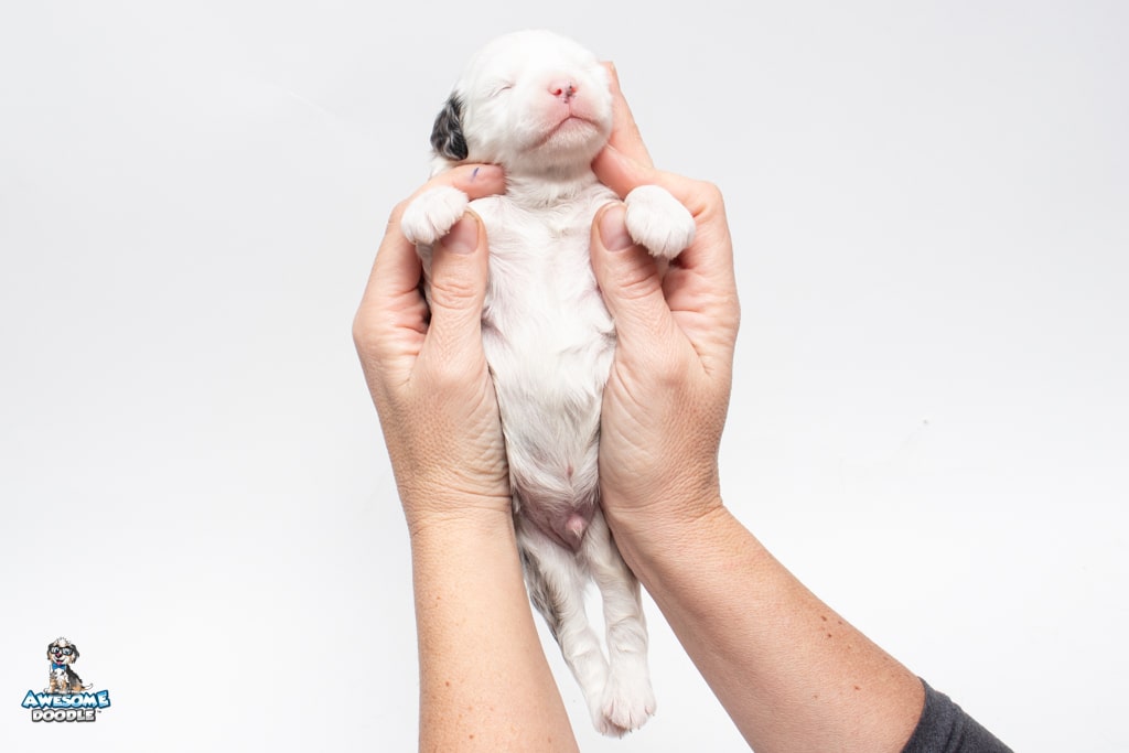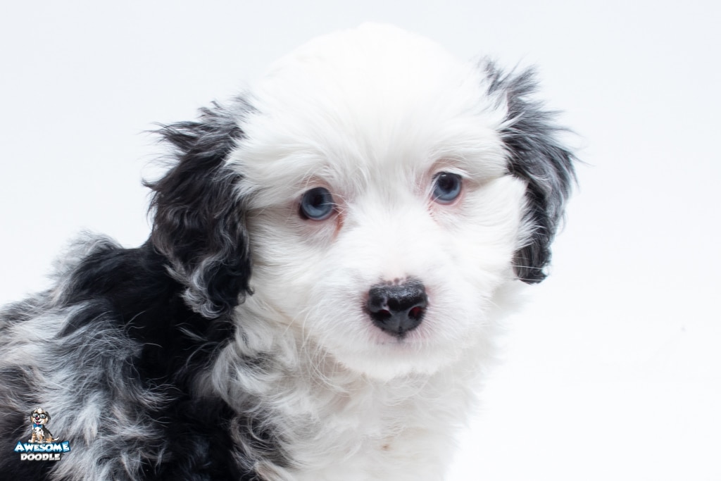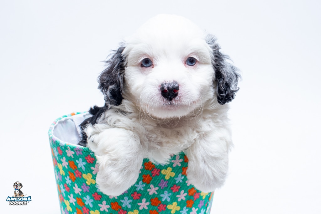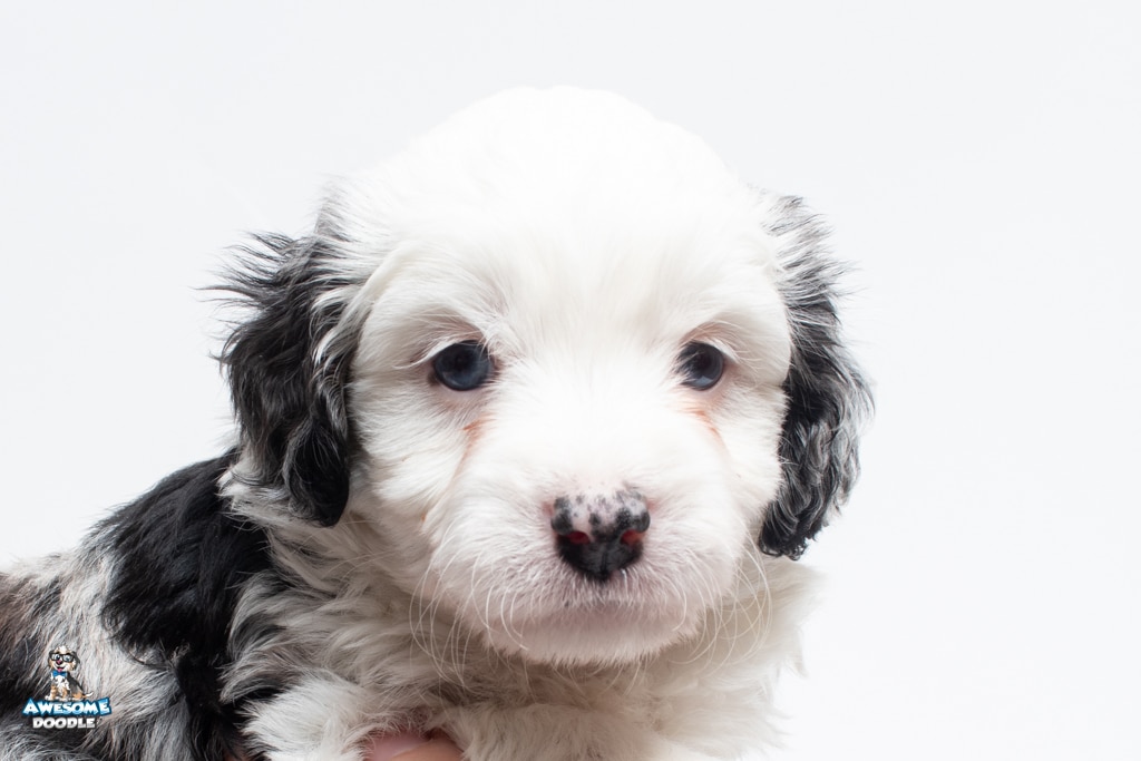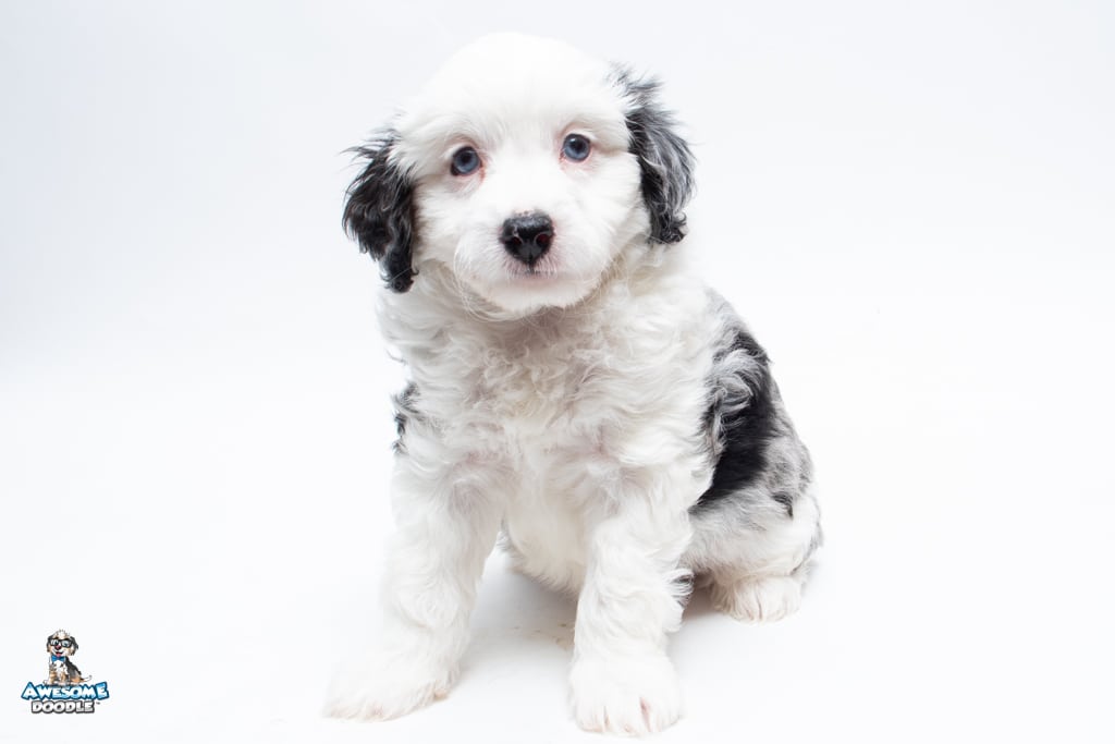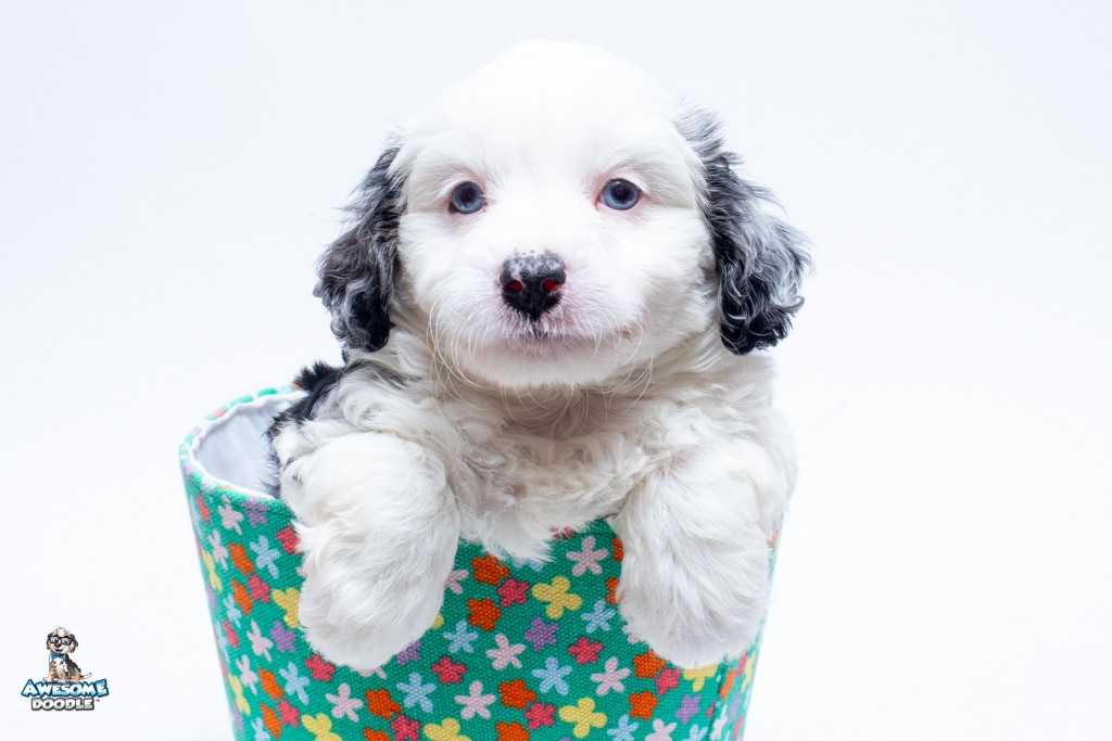 Kit Kat is a male Blue Merle w/White F1 AussieDoodle puppy.