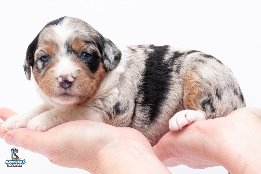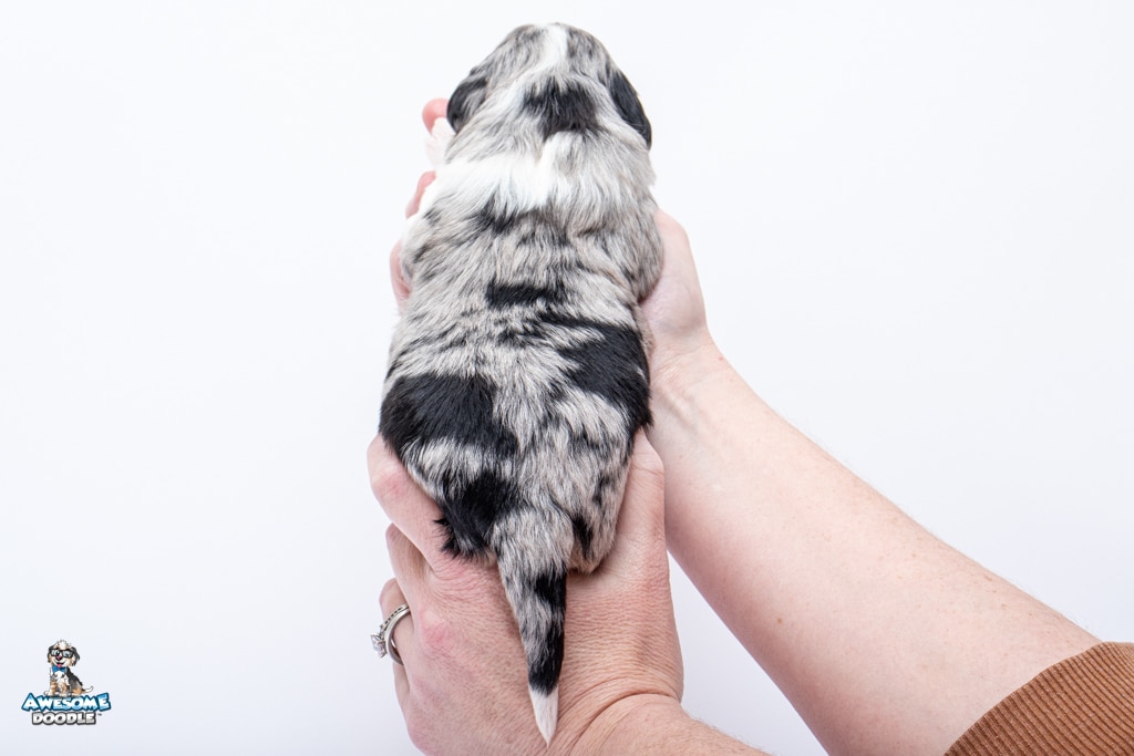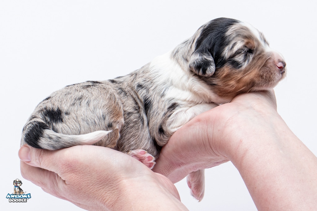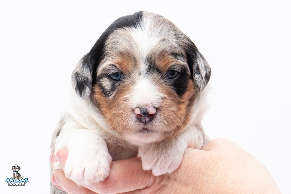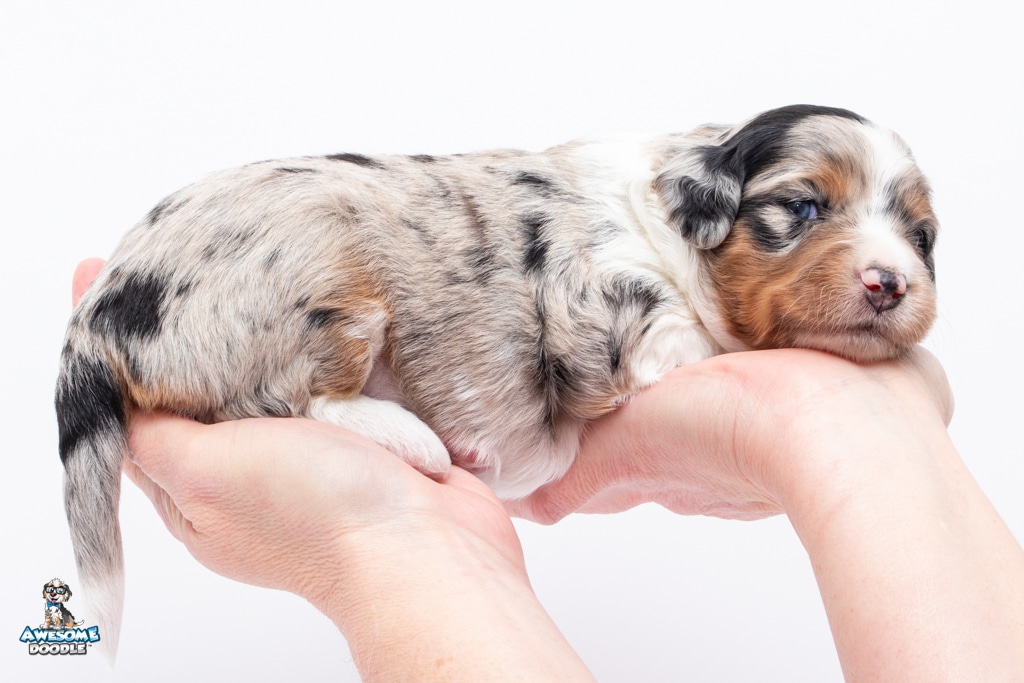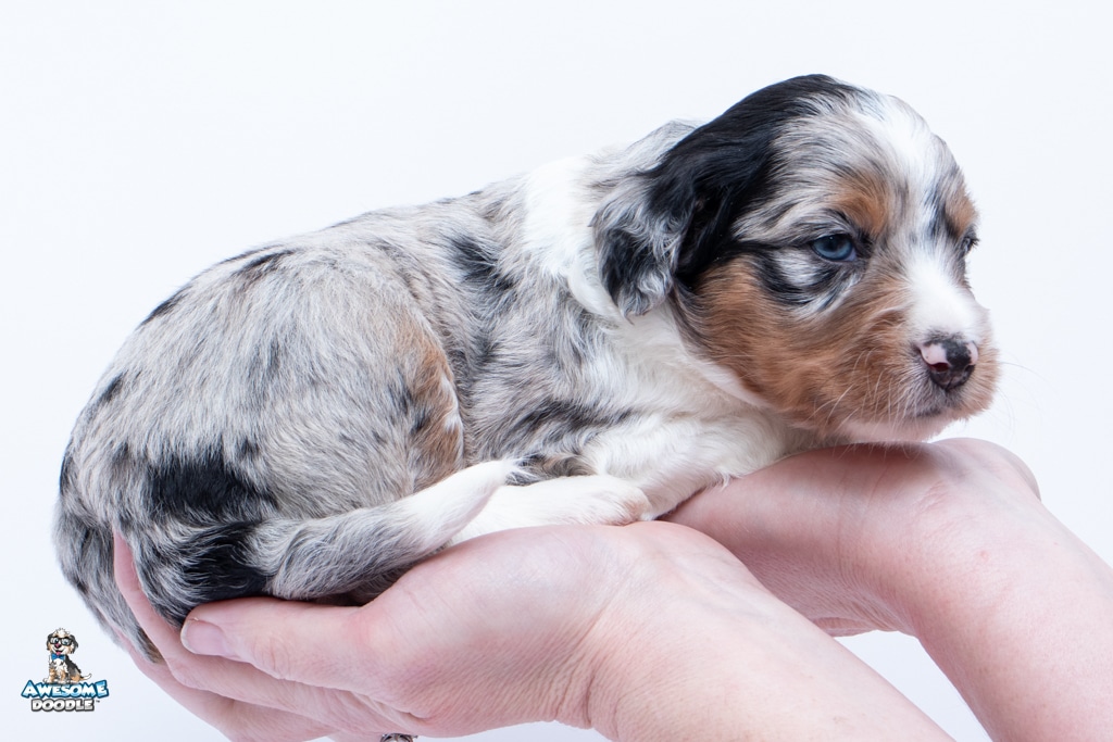 Ruby is a female Blue Merle w/ White & Copper F1 AussieDoodle puppy.