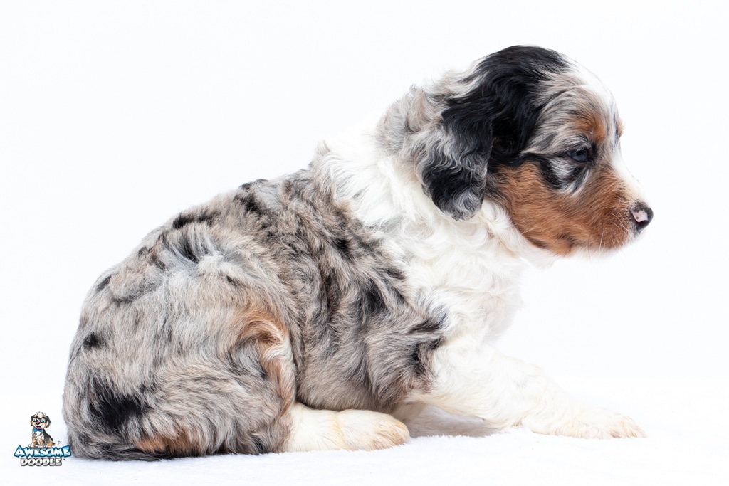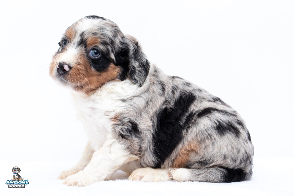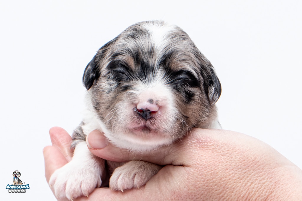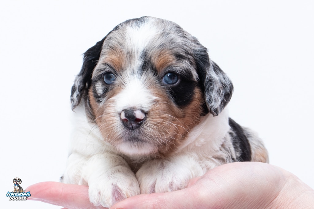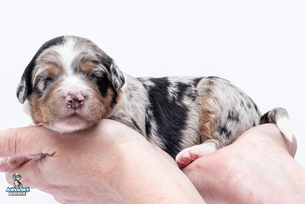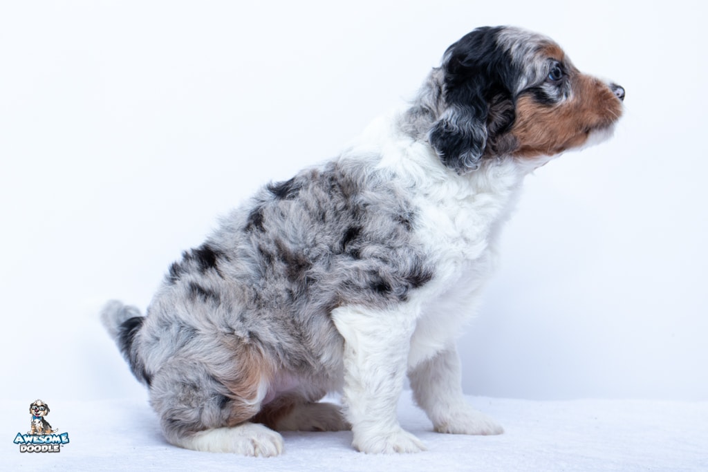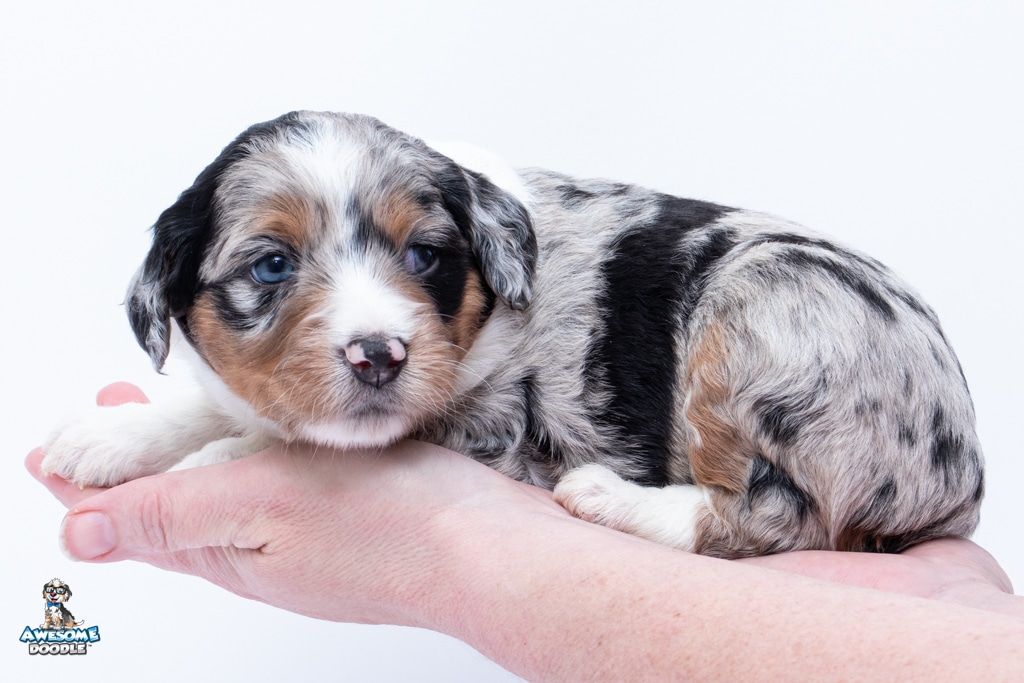 Ruby is a female Blue Merle w/ White & Copper F1 AussieDoodle puppy.