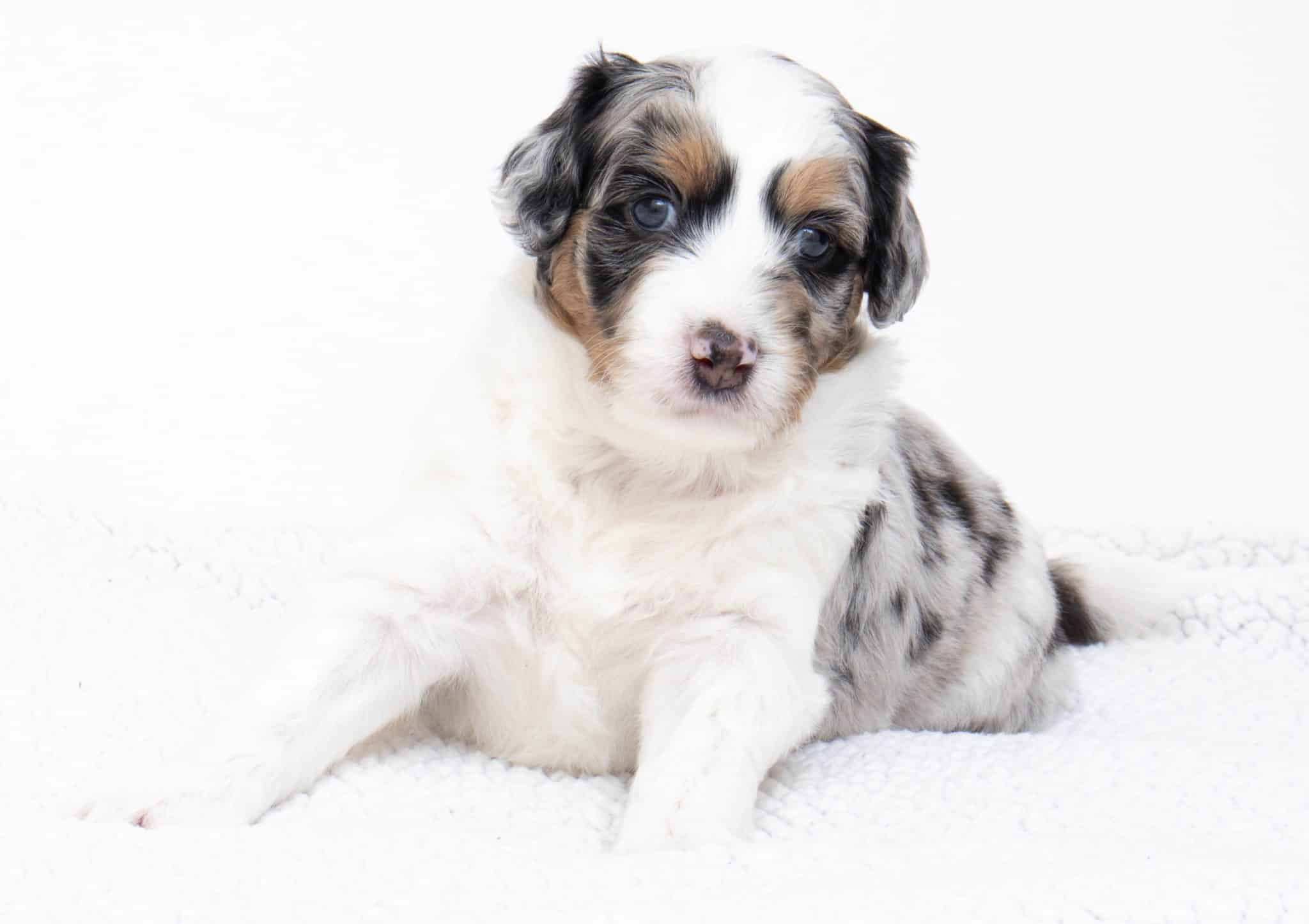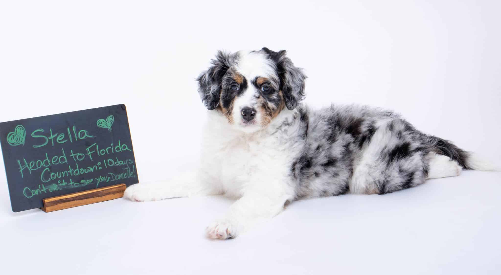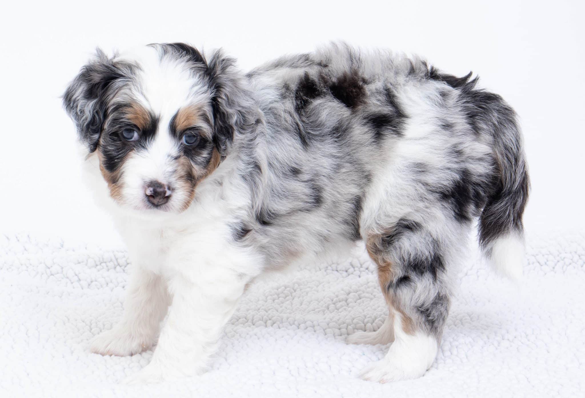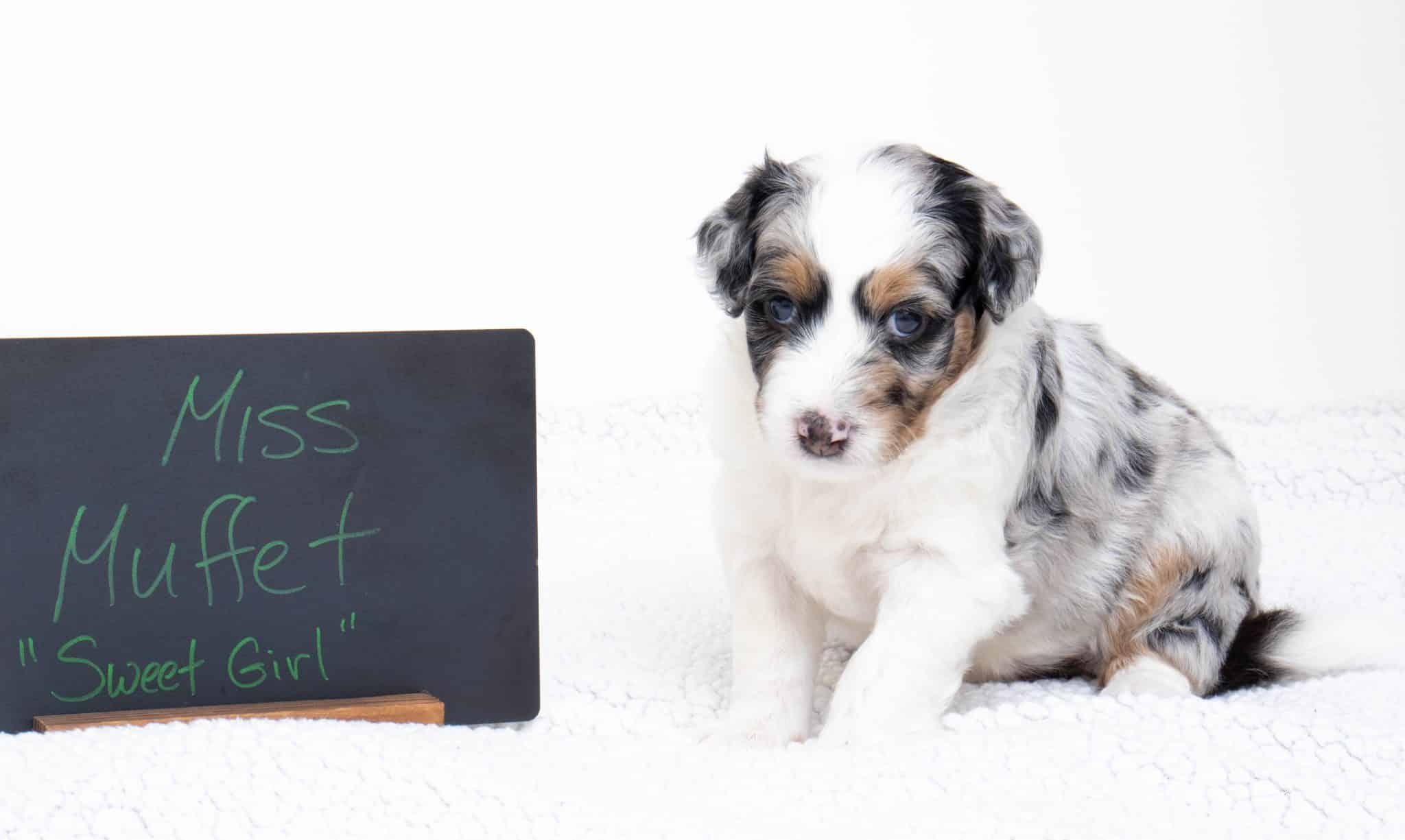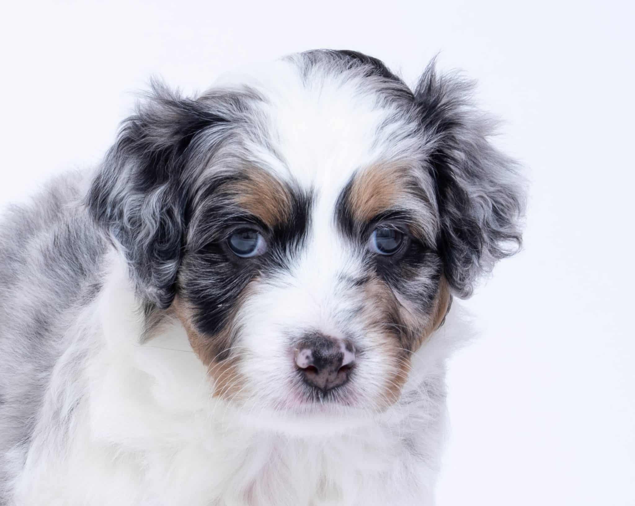 Stella is a female Blue Merle w/ White & Copper F1 AussieDoodle puppy.