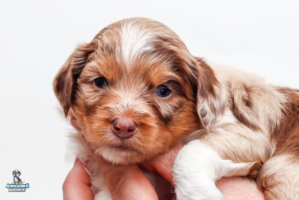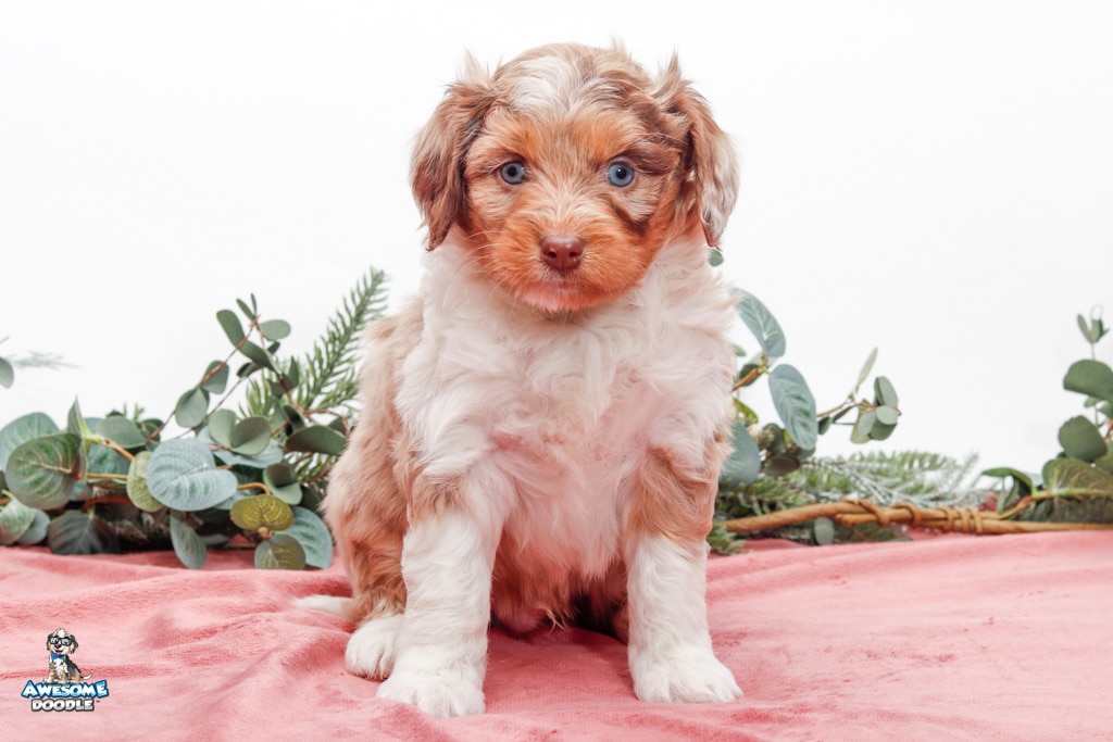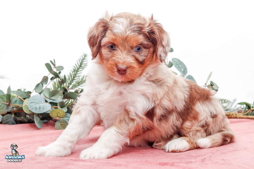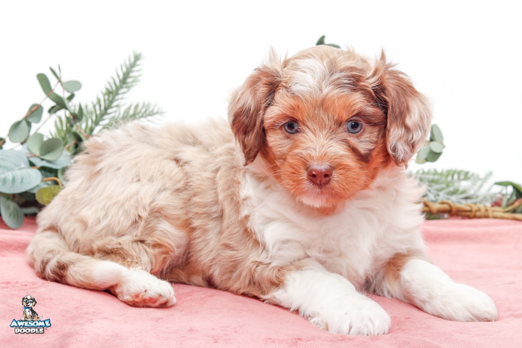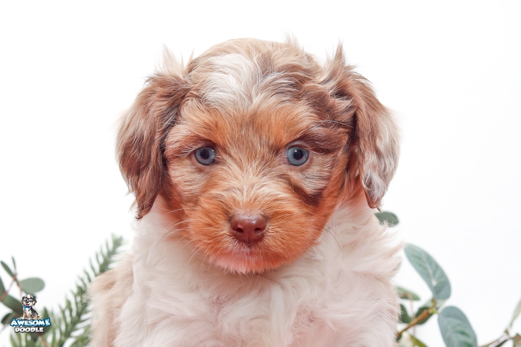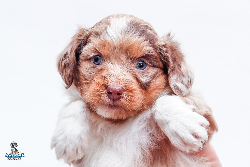 Okee is a male Chocolate Merle w/ White & Copper F1 AussieDoodle puppy.