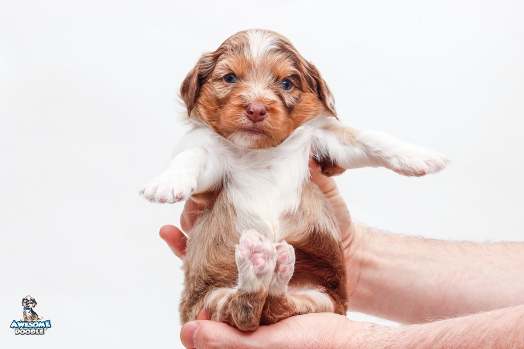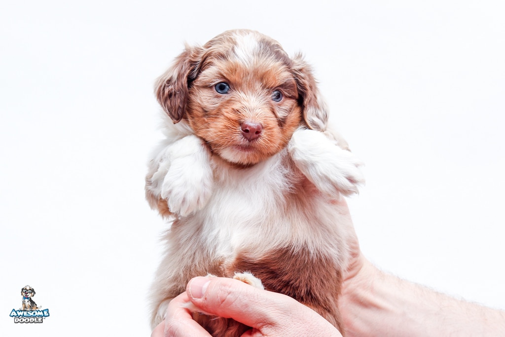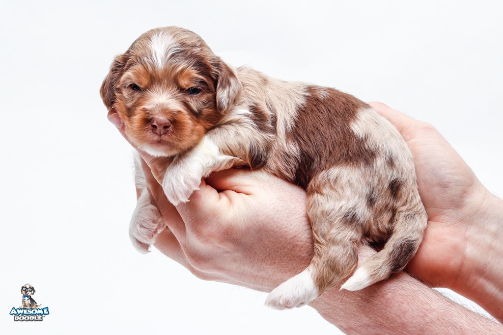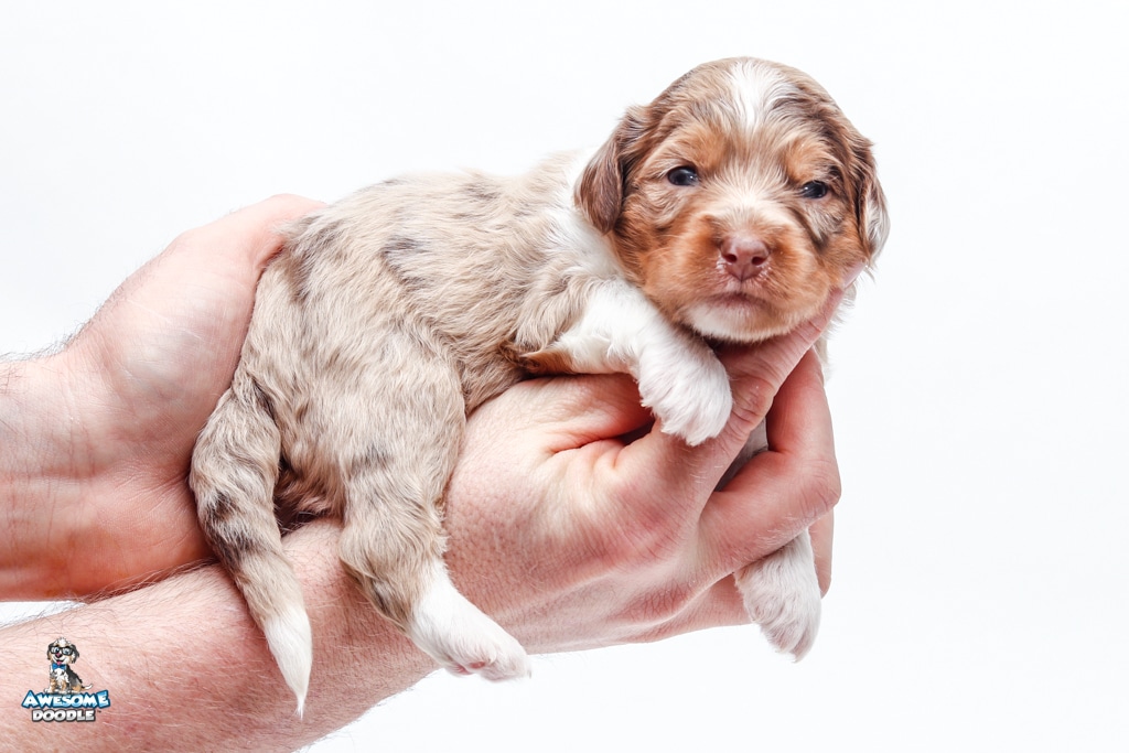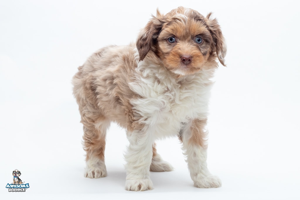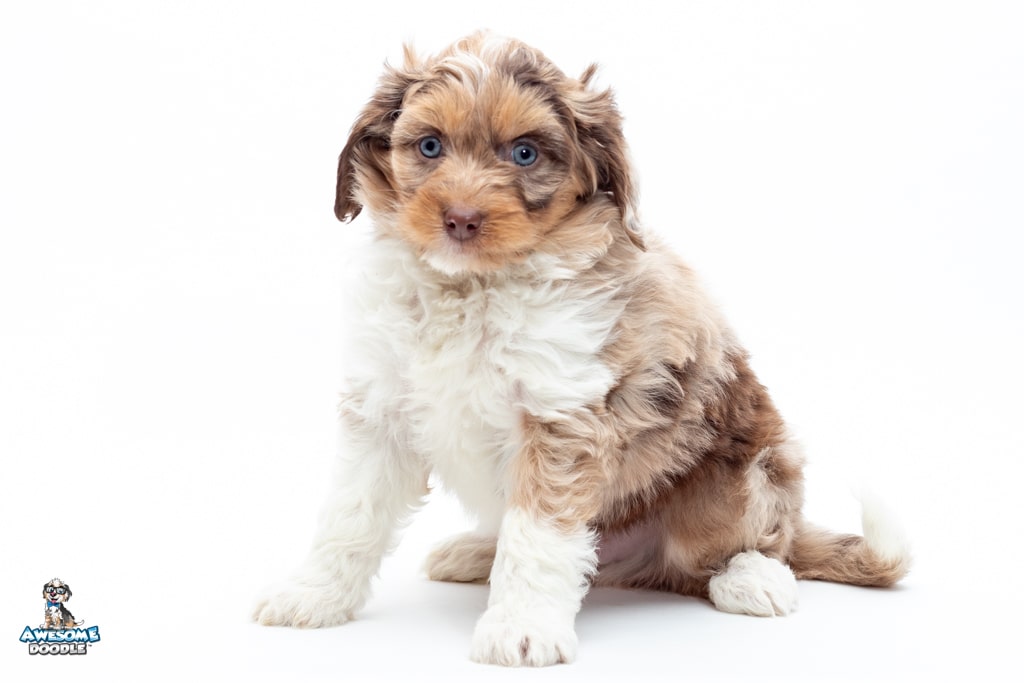 Okee is a male Chocolate Merle w/ White & Copper F1 AussieDoodle puppy.