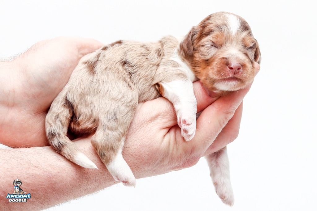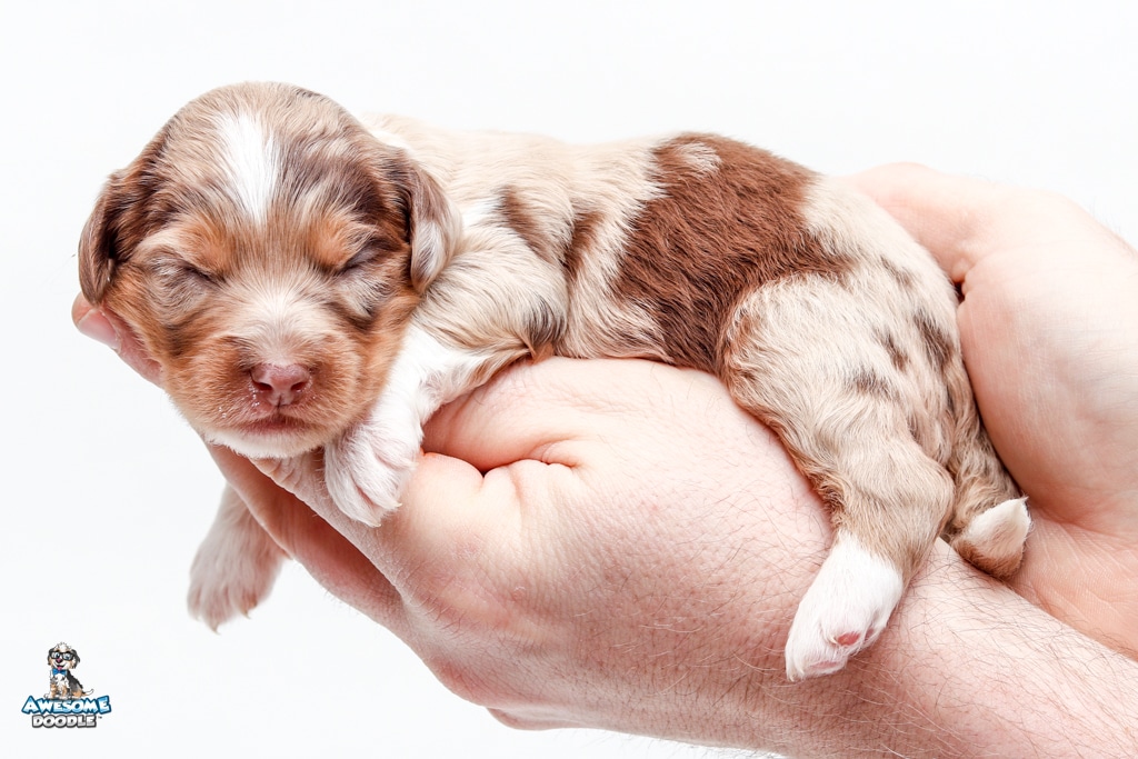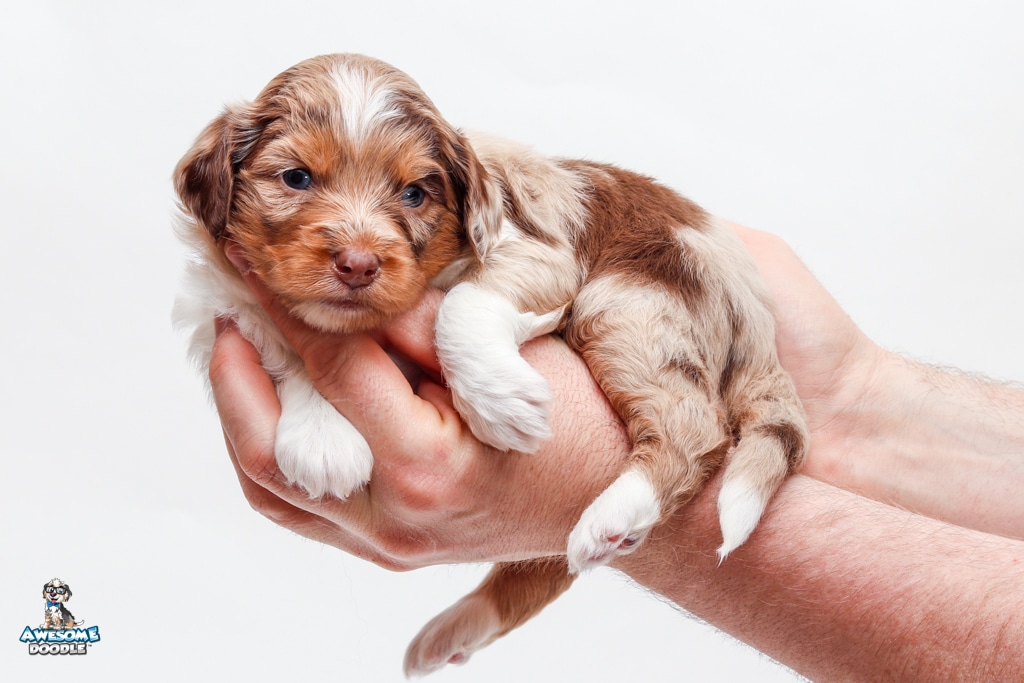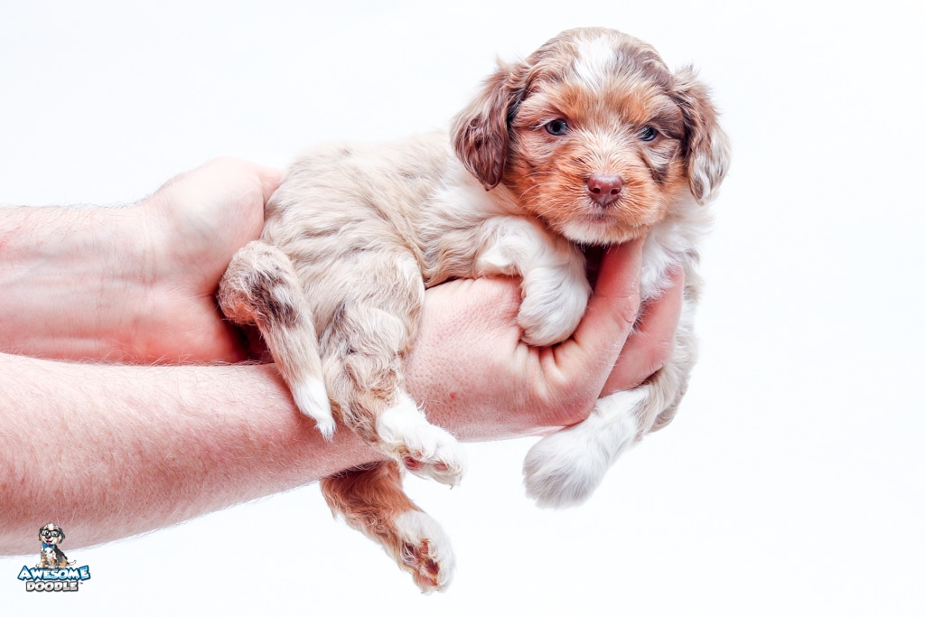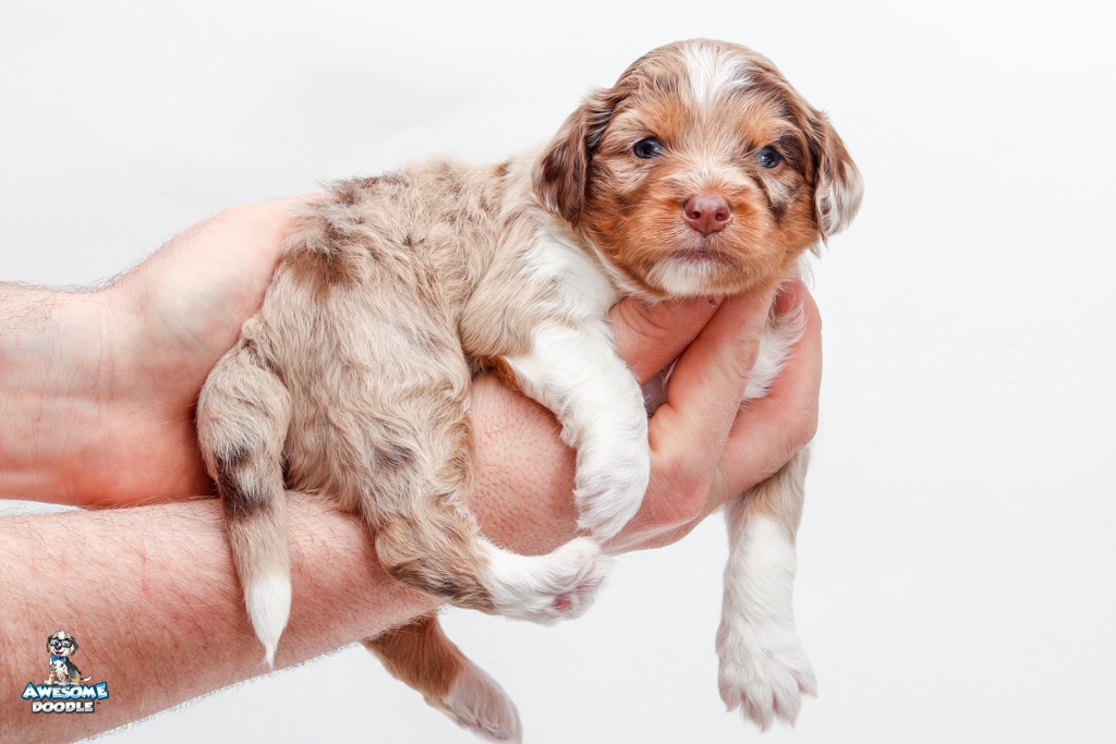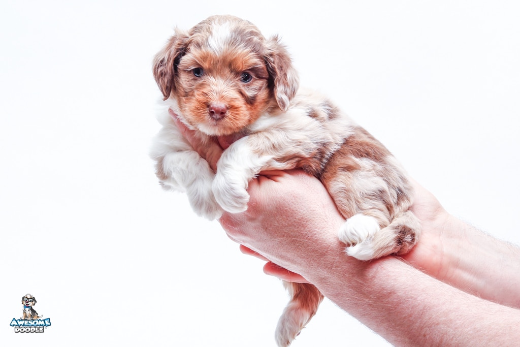 Okee is a male Chocolate Merle w/ White & Copper F1 AussieDoodle puppy.