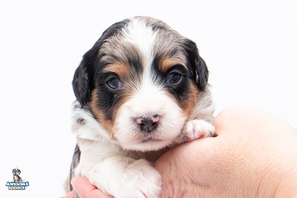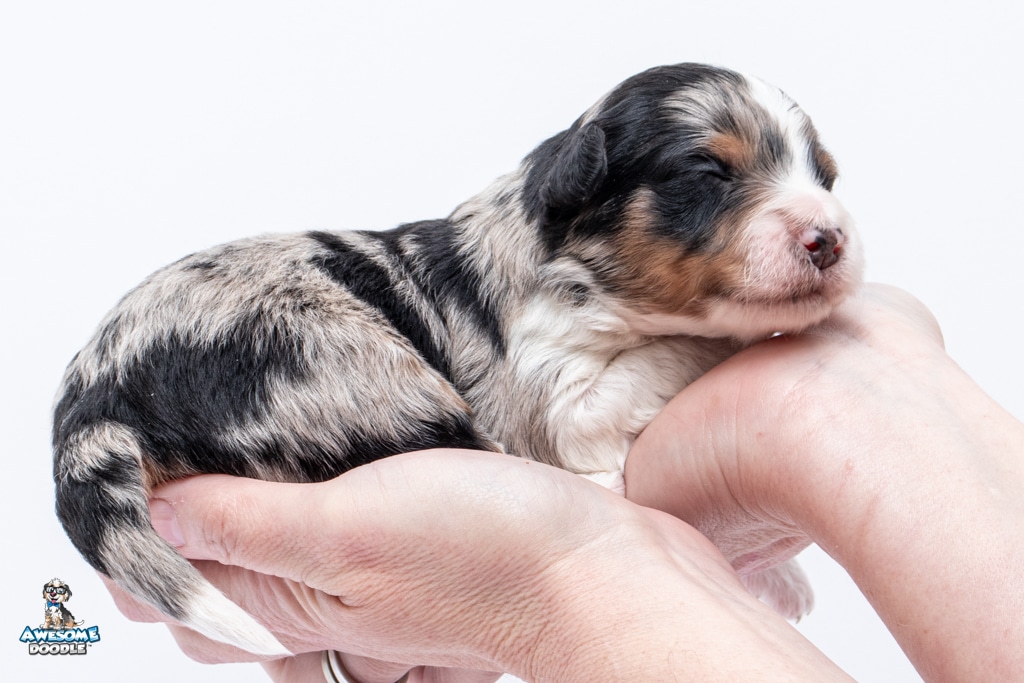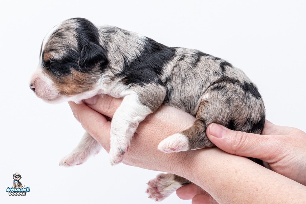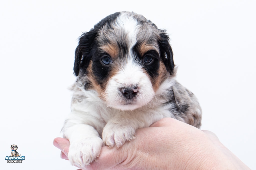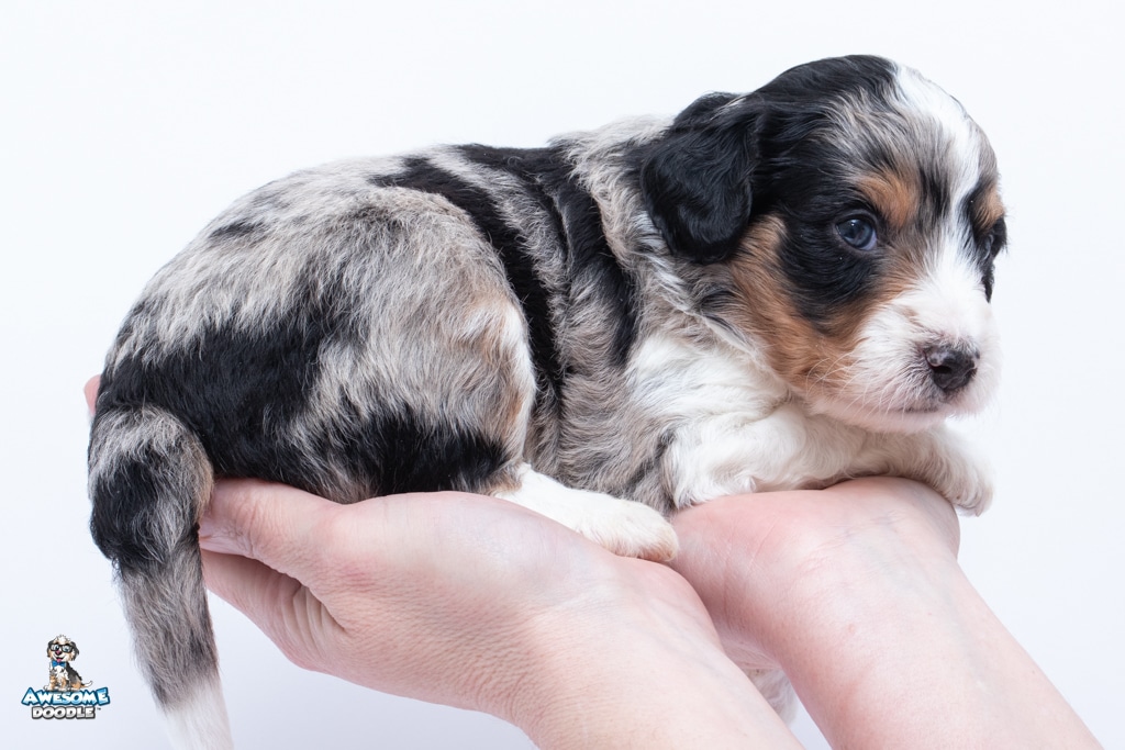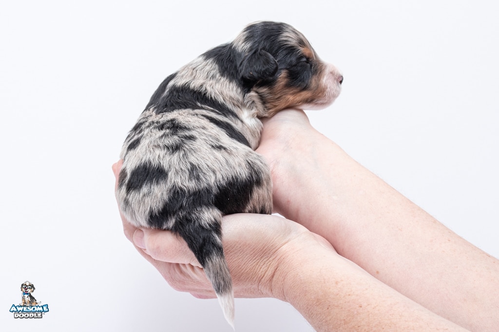 Quinn is a male Blue Merle w/ White & Copper F1 AussieDoodle puppy.