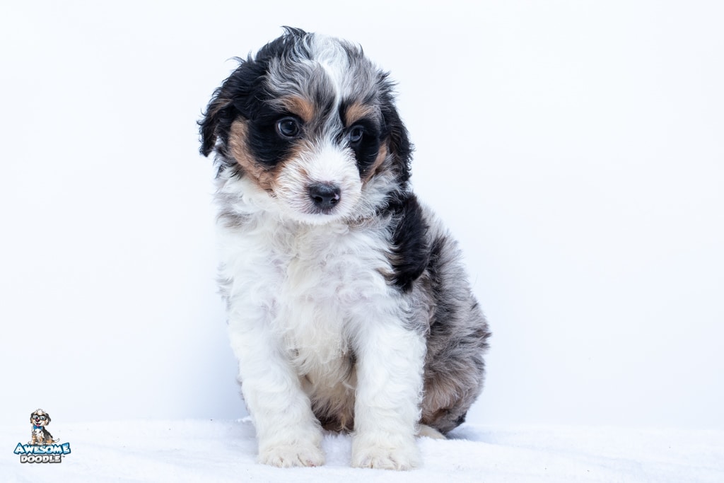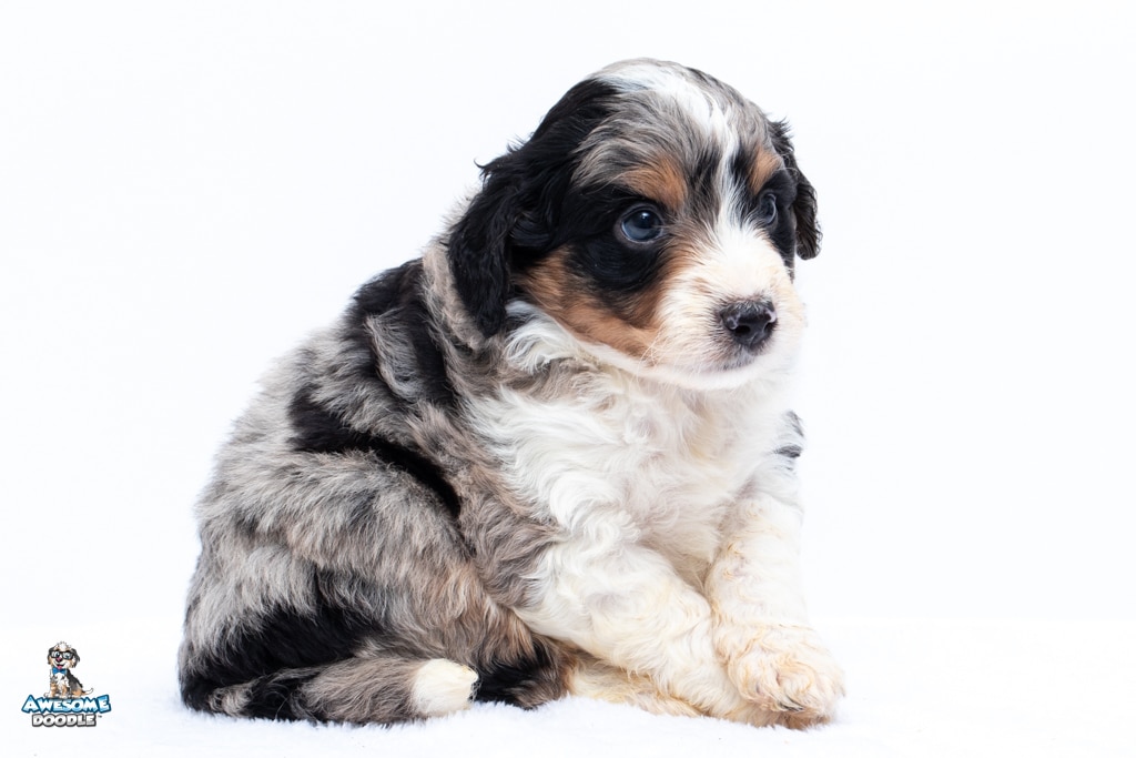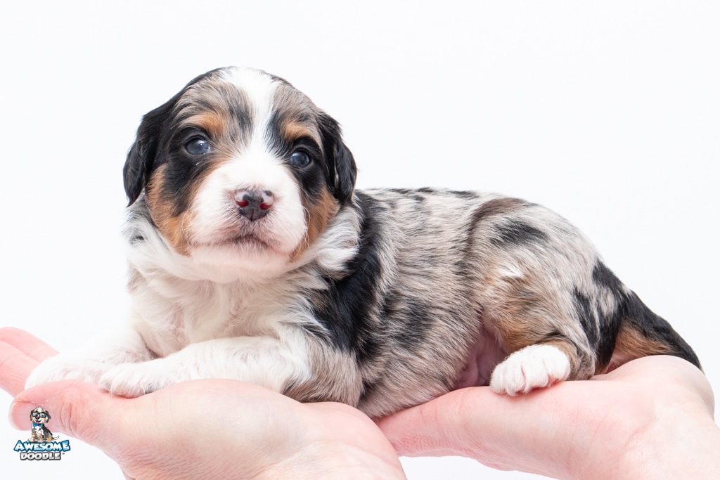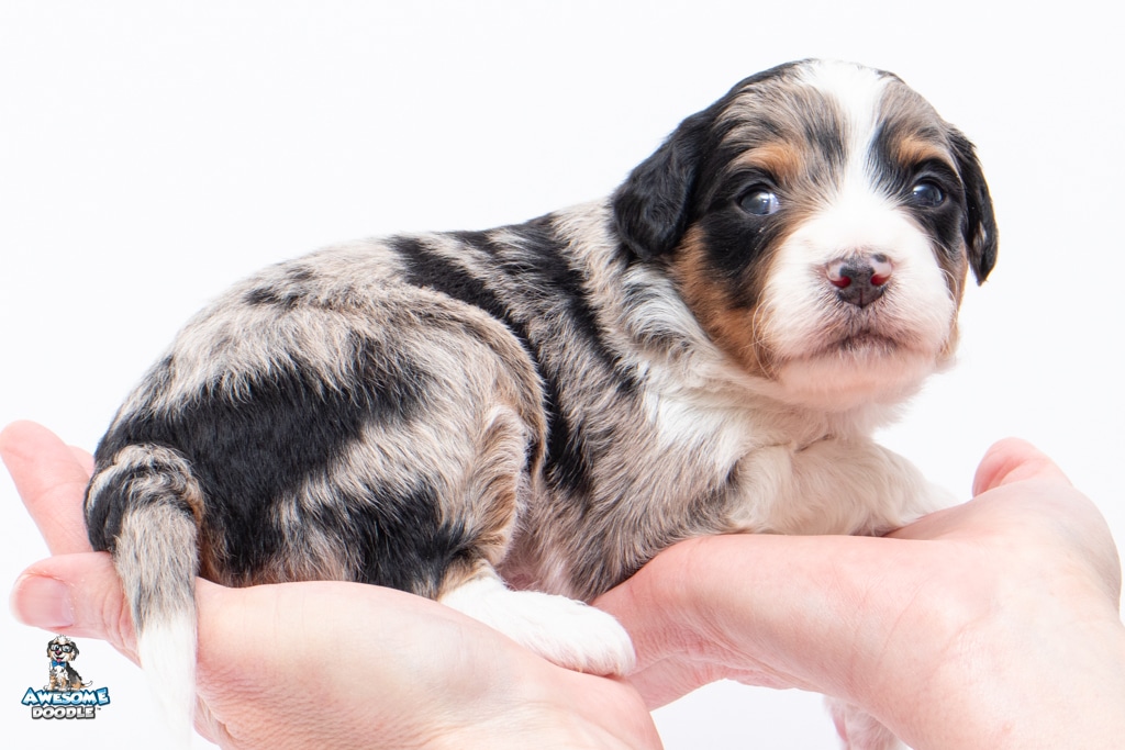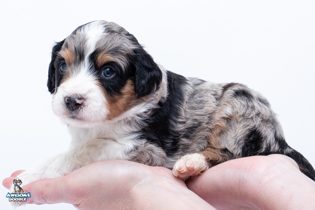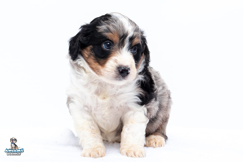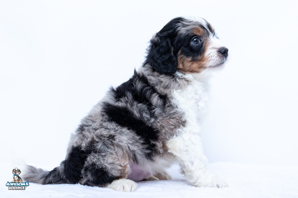 Quinn is a male Blue Merle w/ White & Copper F1 AussieDoodle puppy.