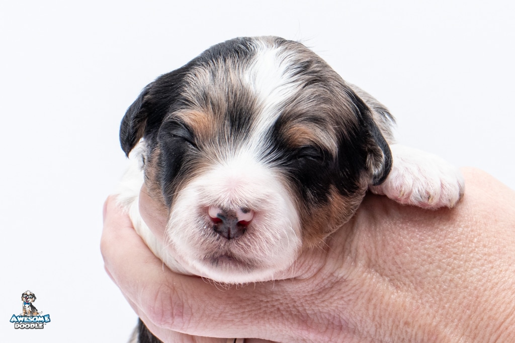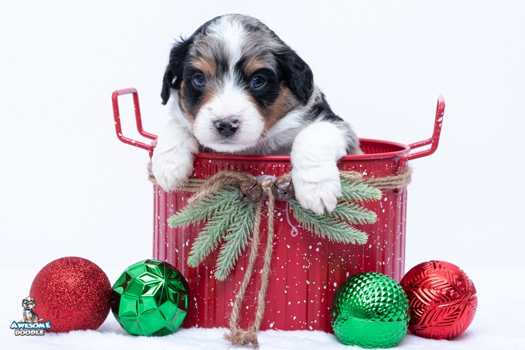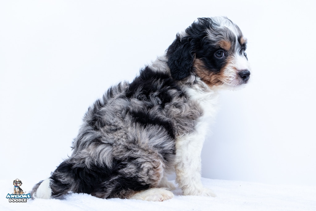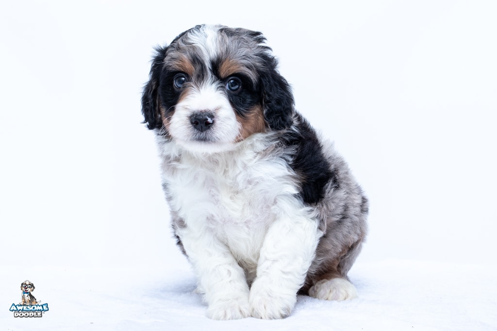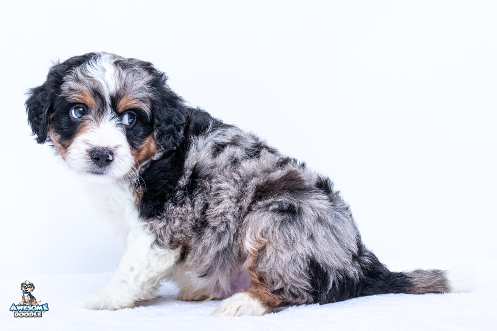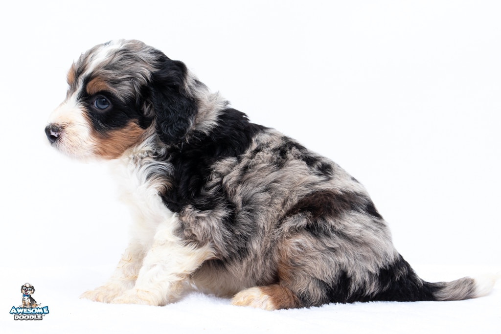 Quinn is a male Blue Merle w/ White & Copper F1 AussieDoodle puppy.