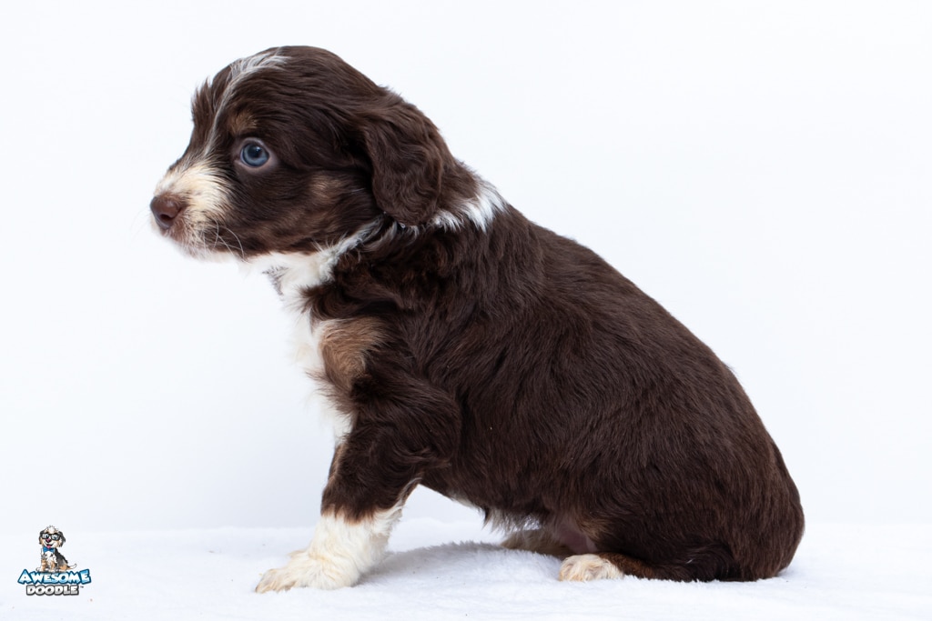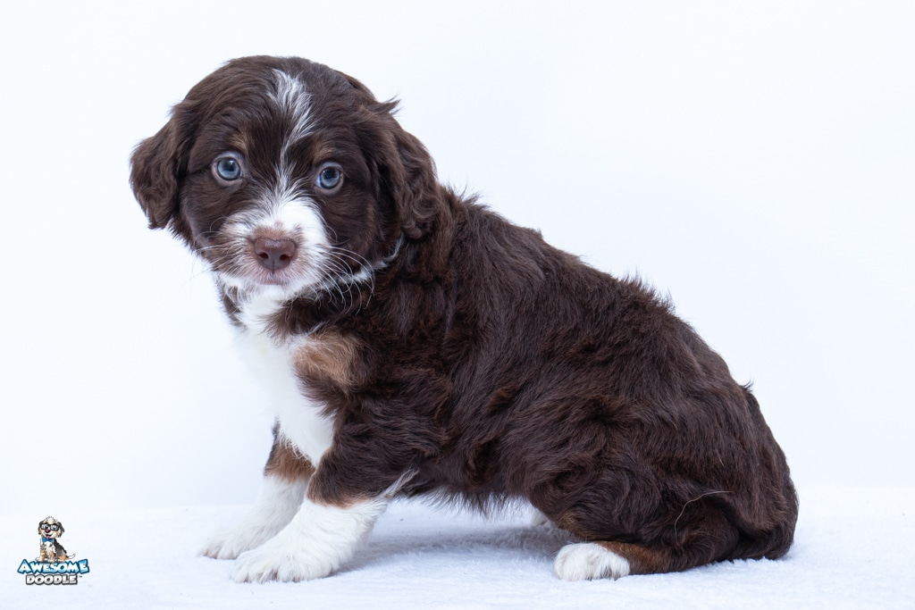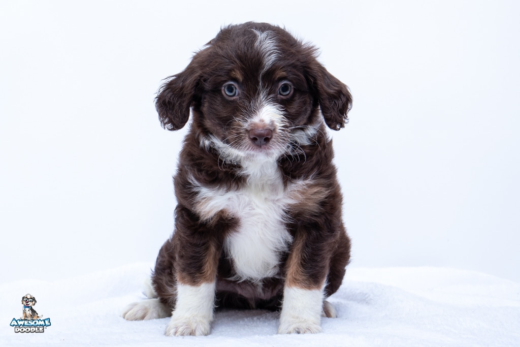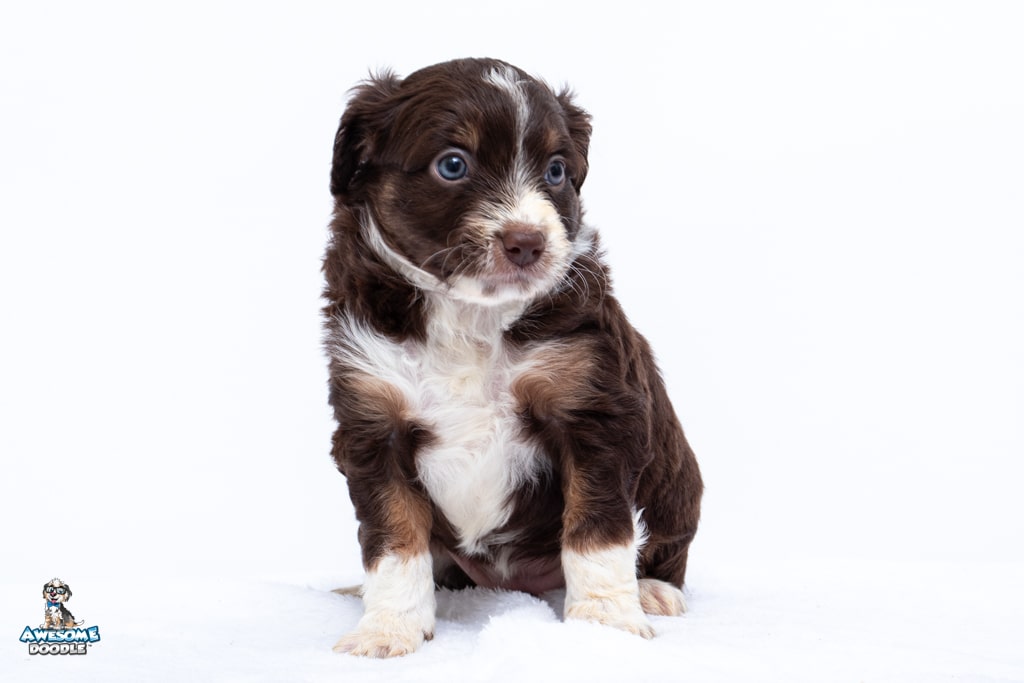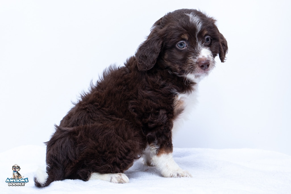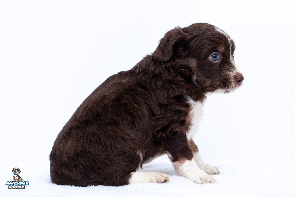 Penny is a female Chocolate Tri-Color F1 AussieDoodle puppy.