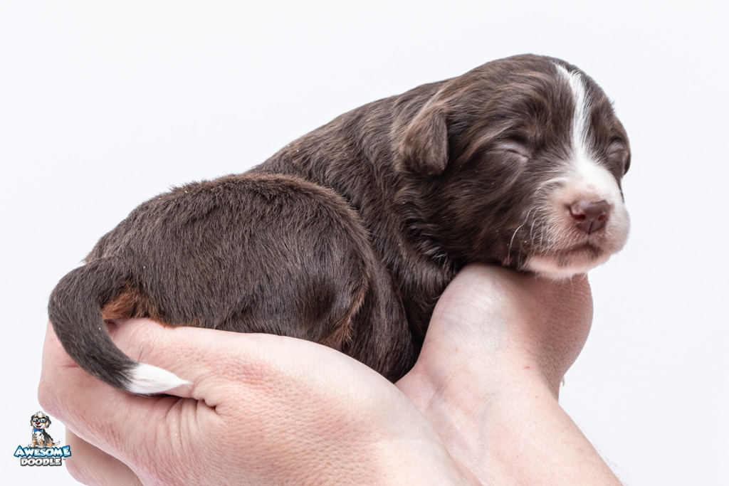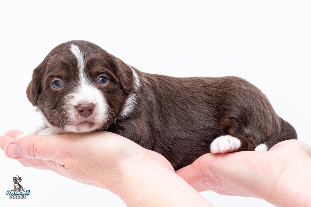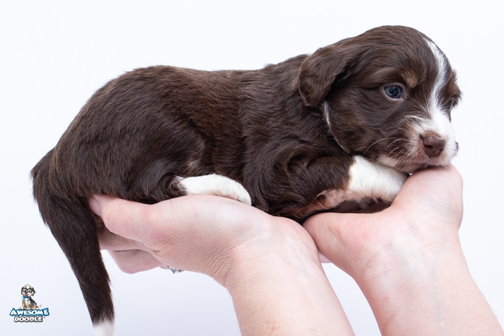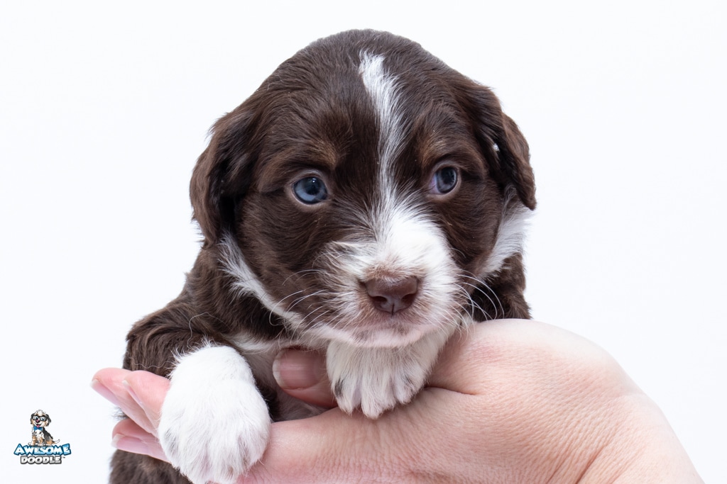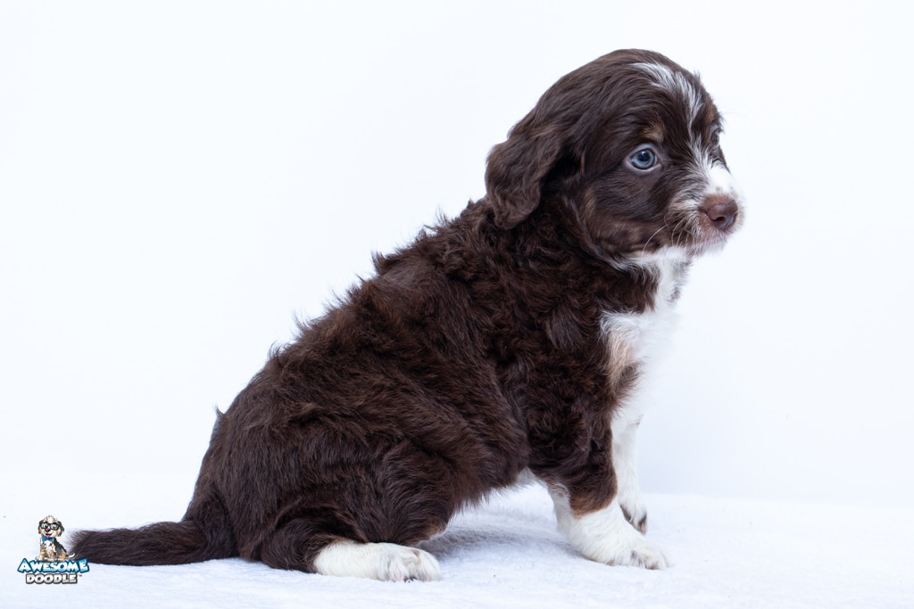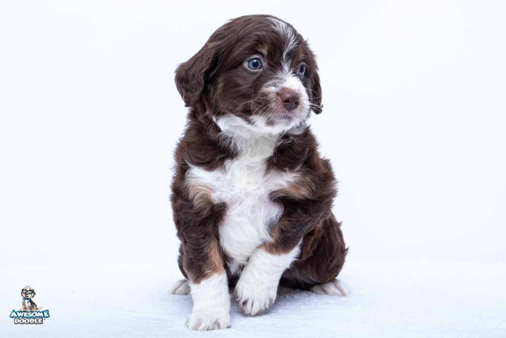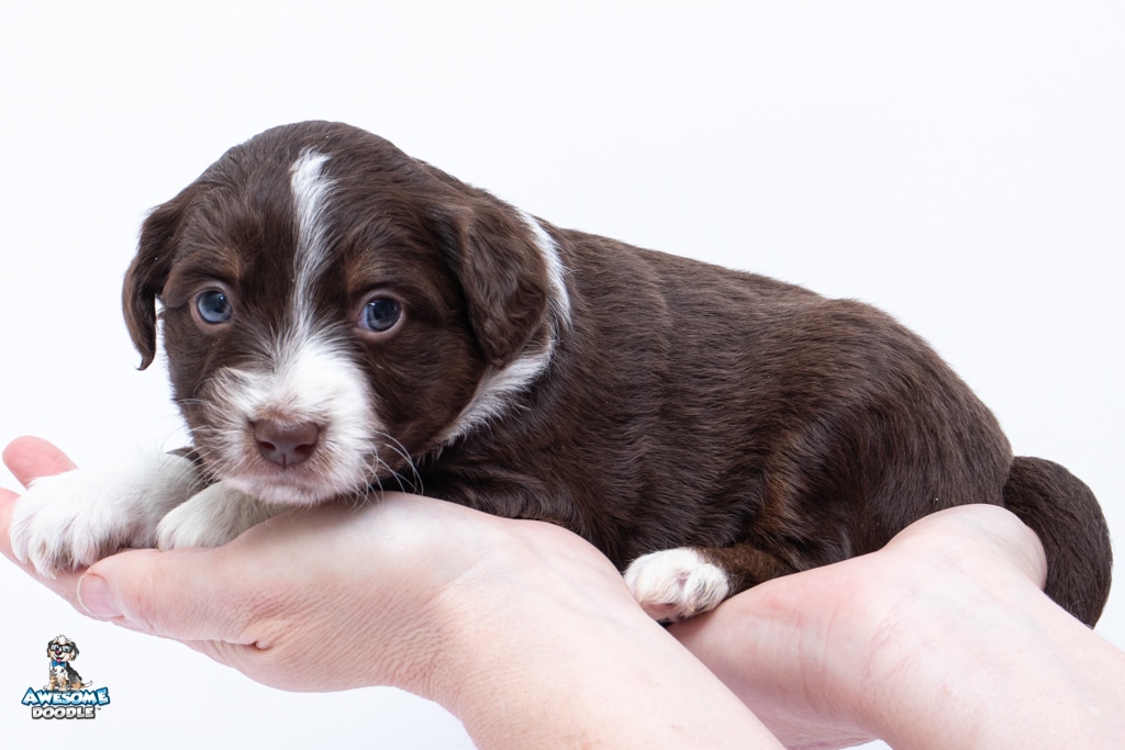 Penny is a female Chocolate Tri-Color F1 AussieDoodle puppy.