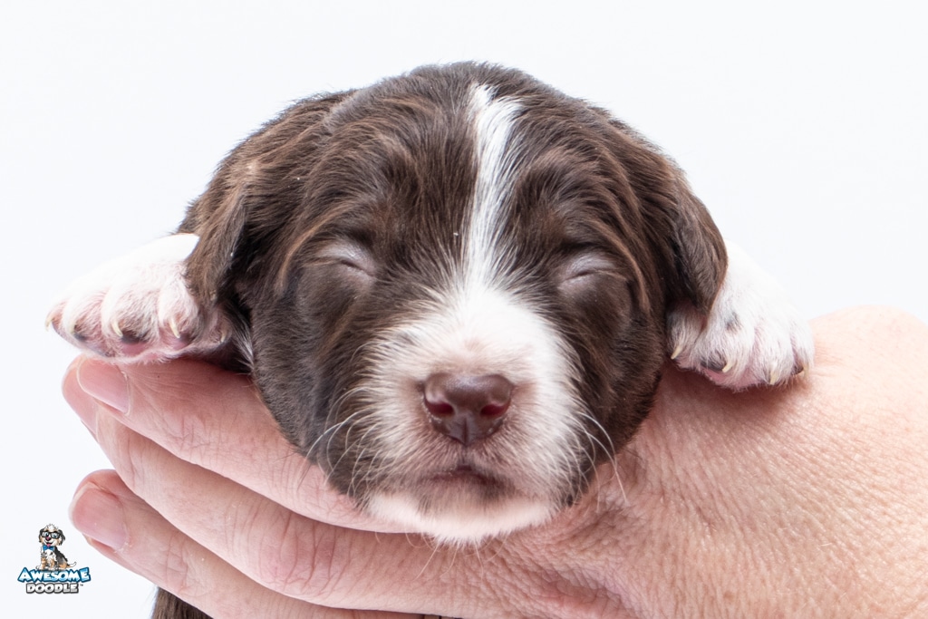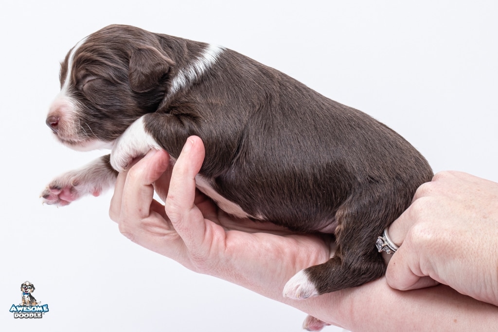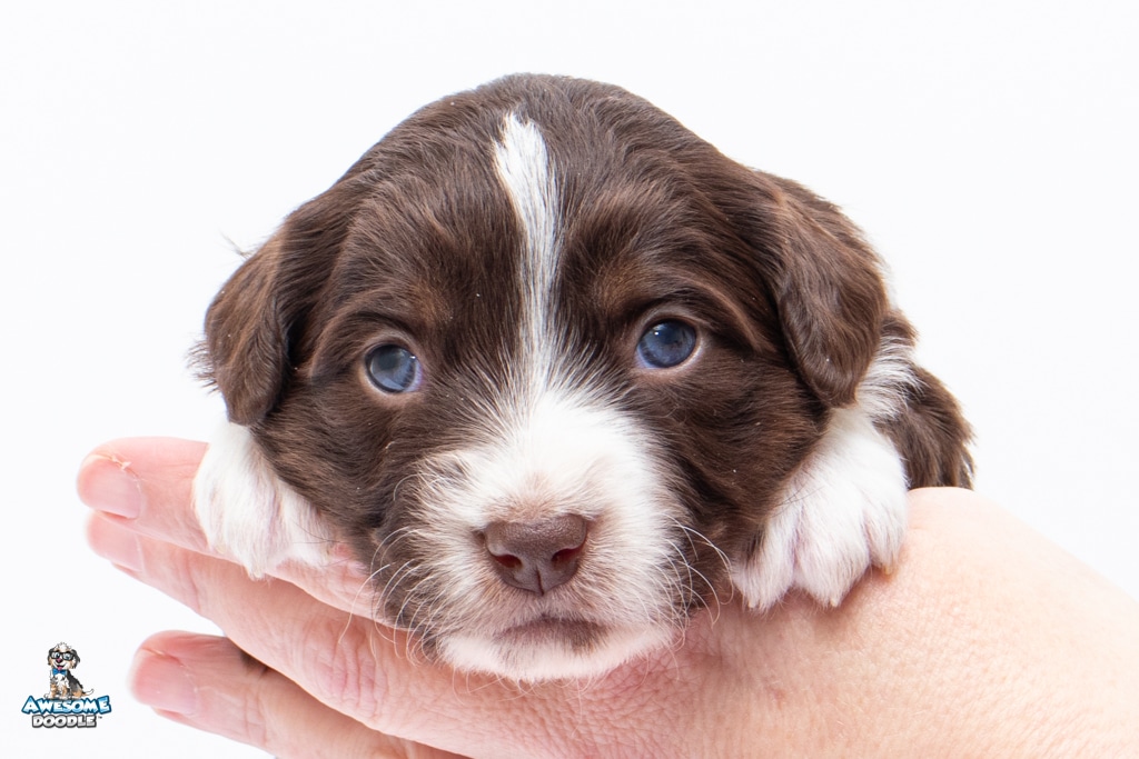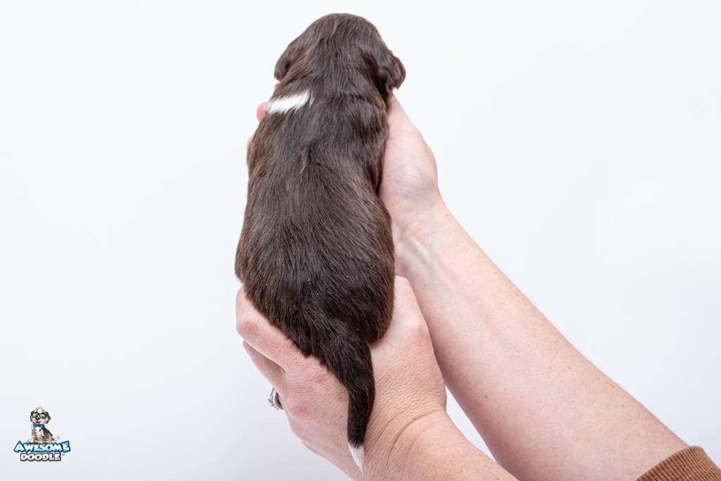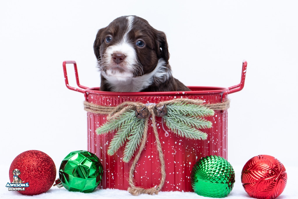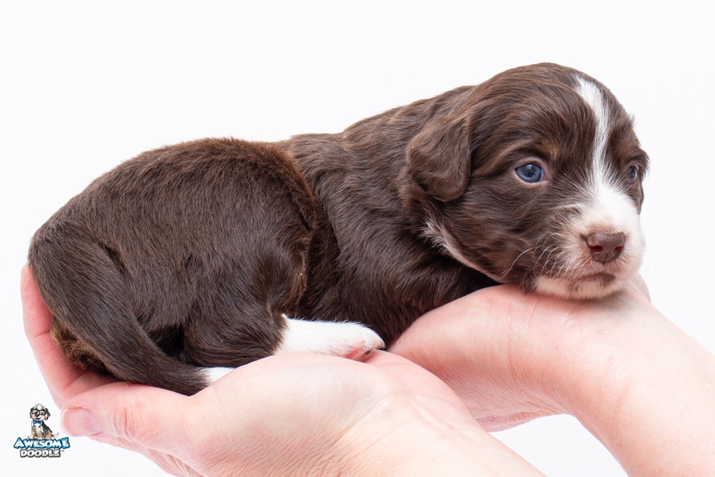 Penny is a female Chocolate Tri-Color F1 AussieDoodle puppy.