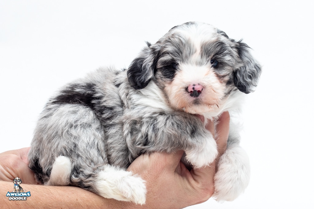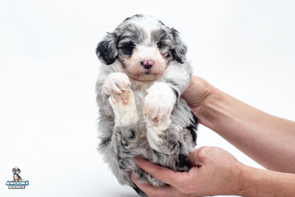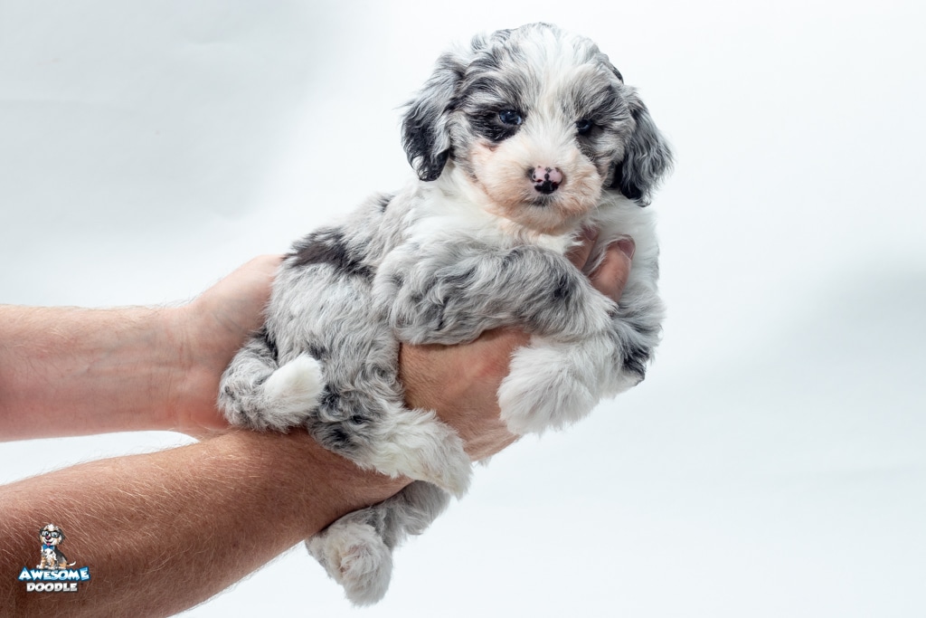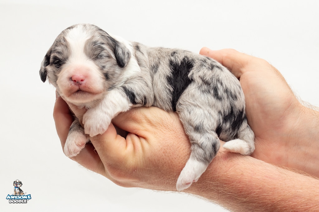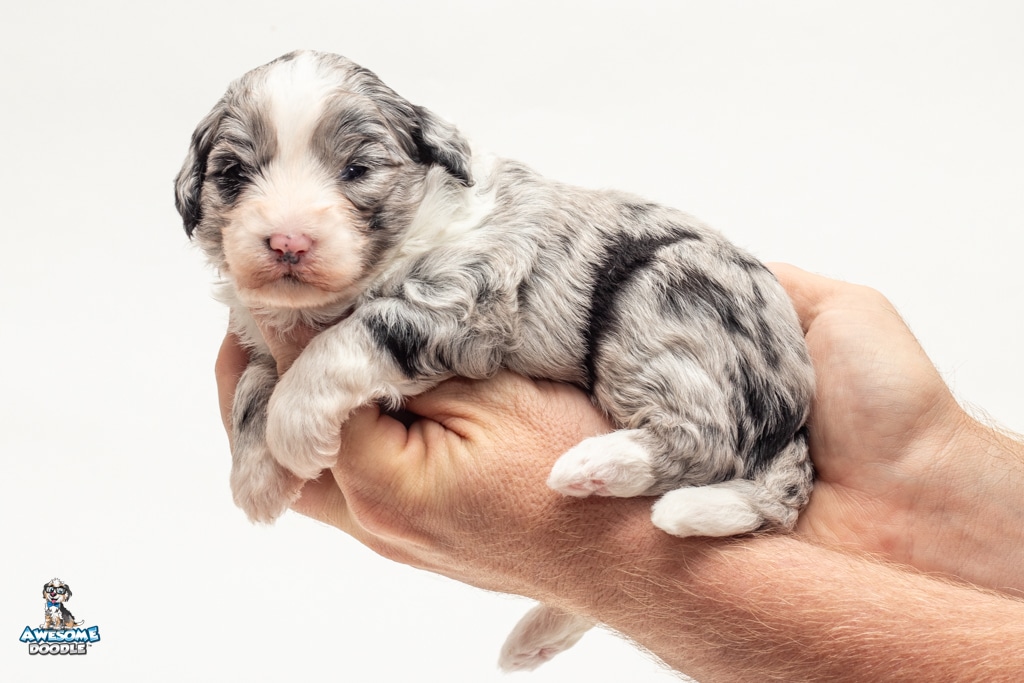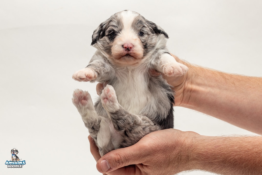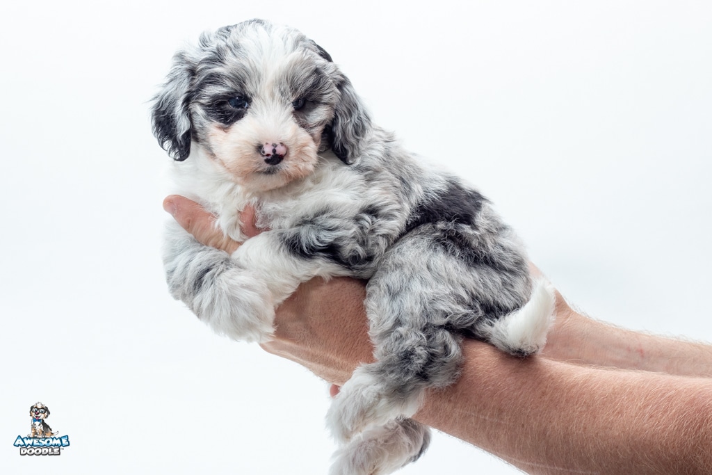 Brody is a male Blue Merle w/White F1 AussieDoodle puppy.