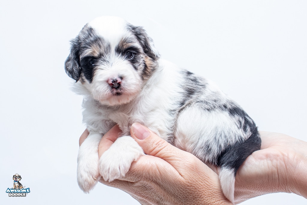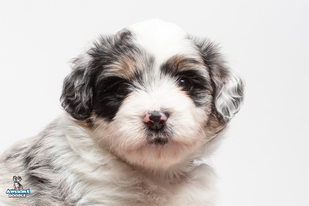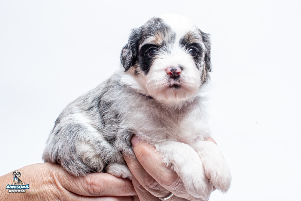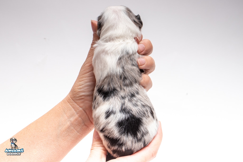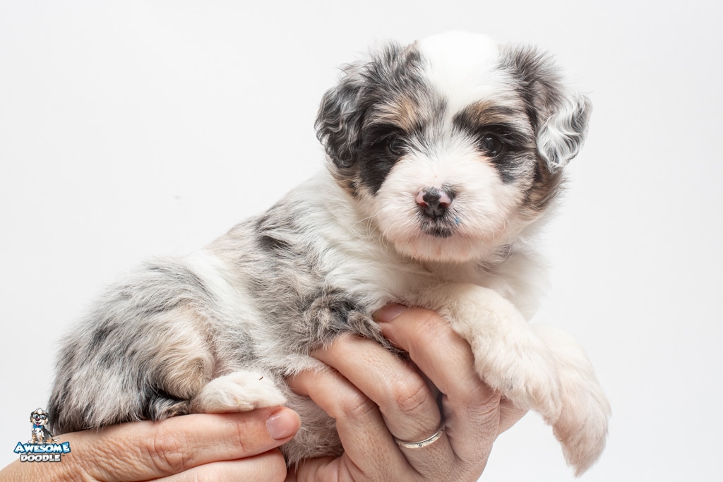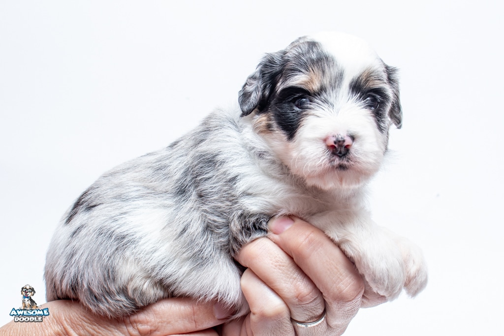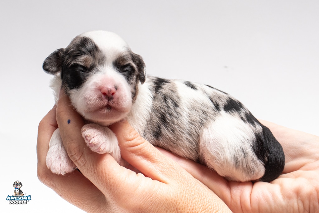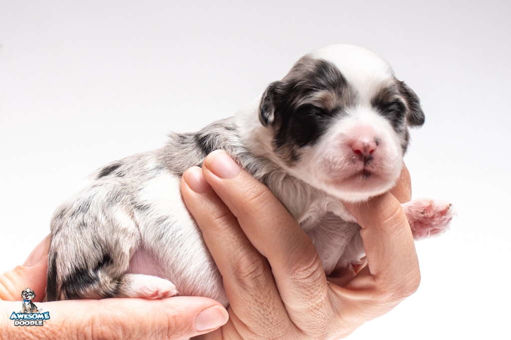 Sabrina is a female Blue Merle w/ White & Copper F1 AussieDoodle puppy.