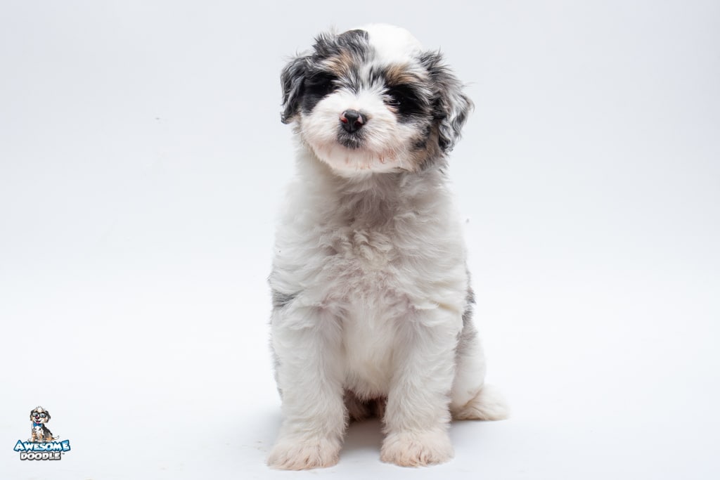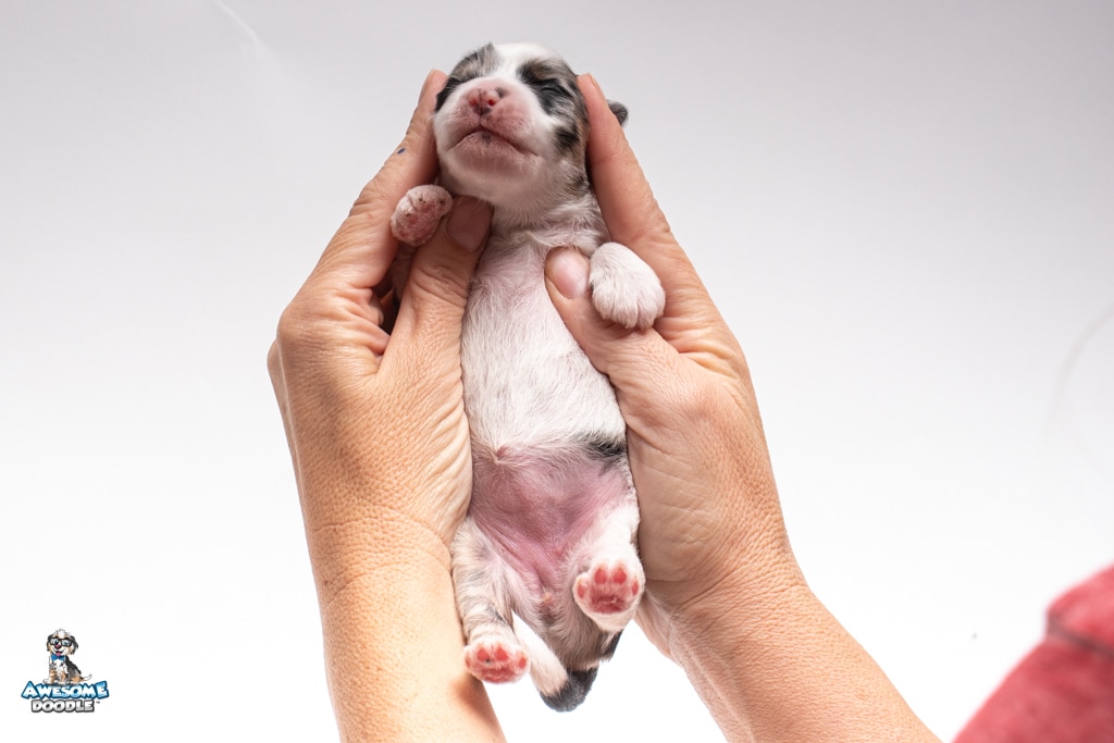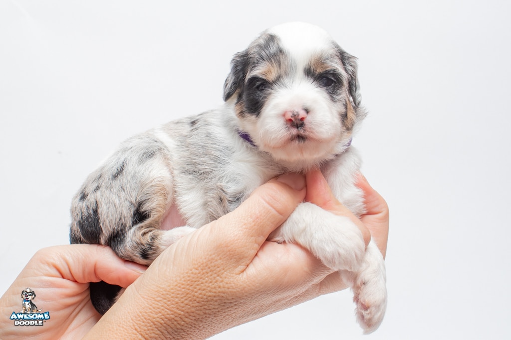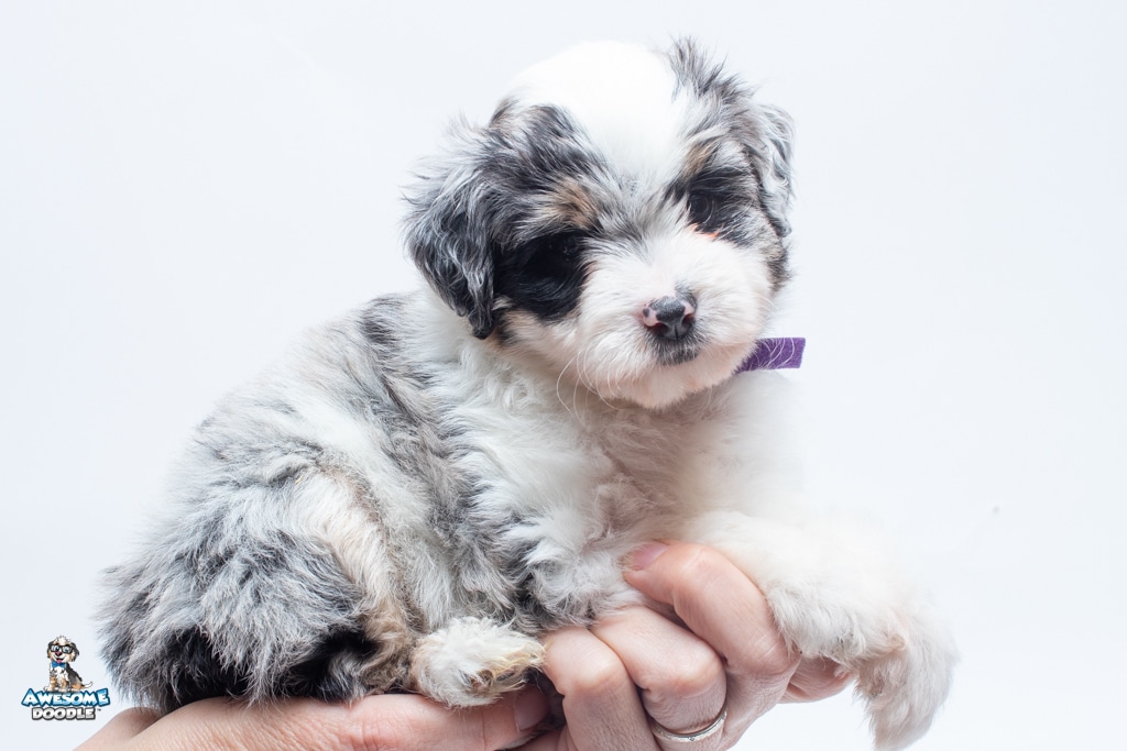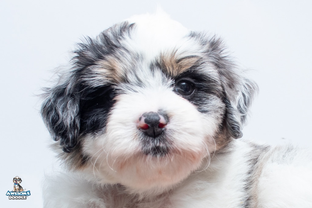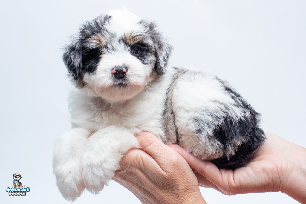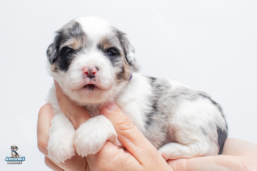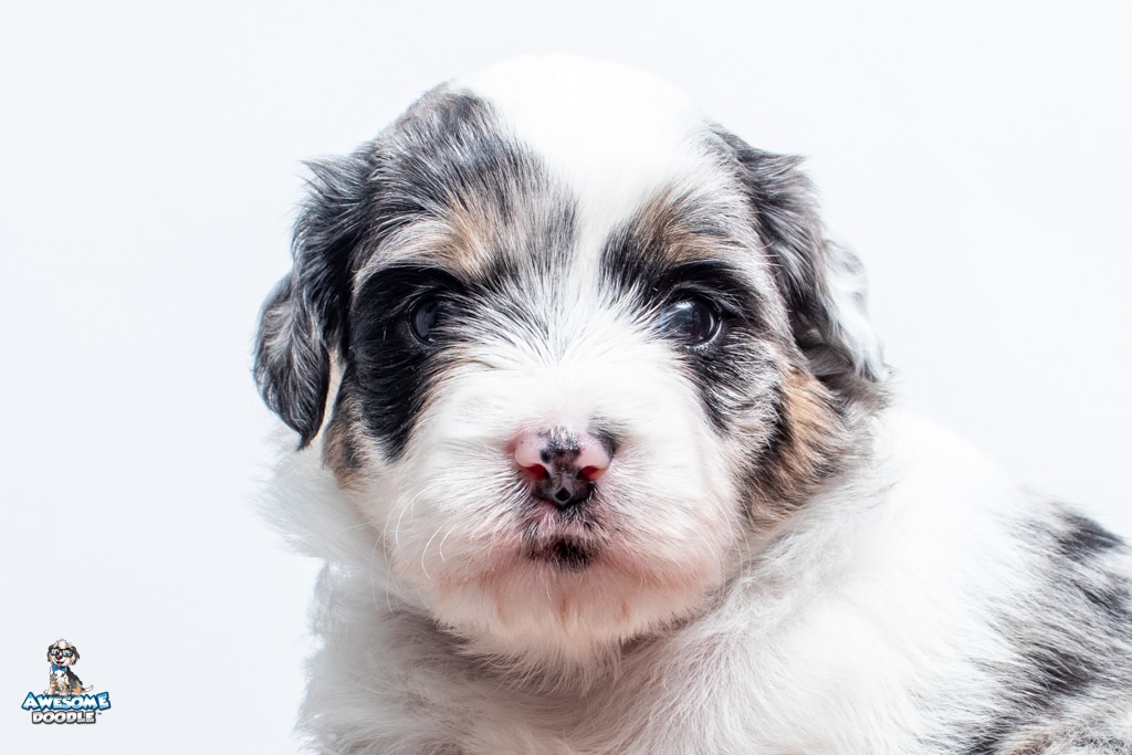 Sabrina is a female Blue Merle w/ White & Copper F1 AussieDoodle puppy.