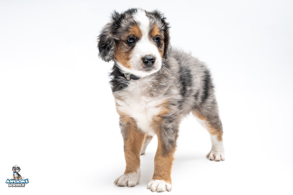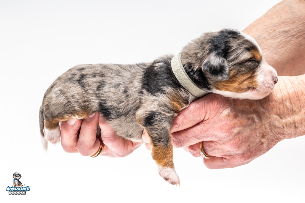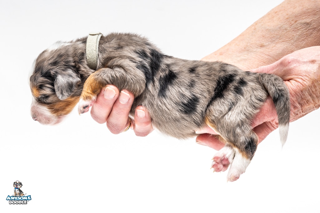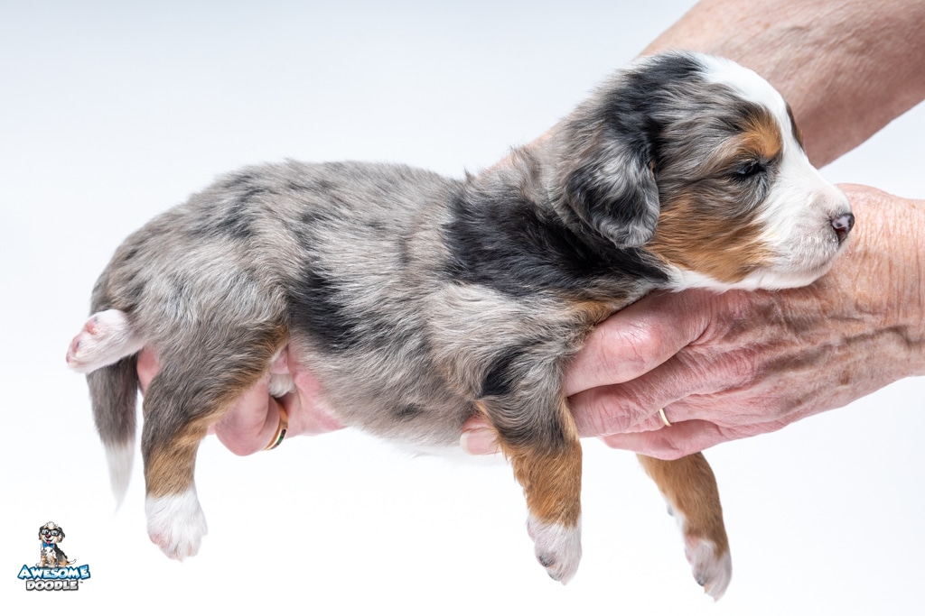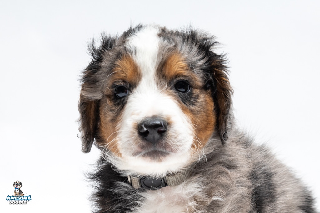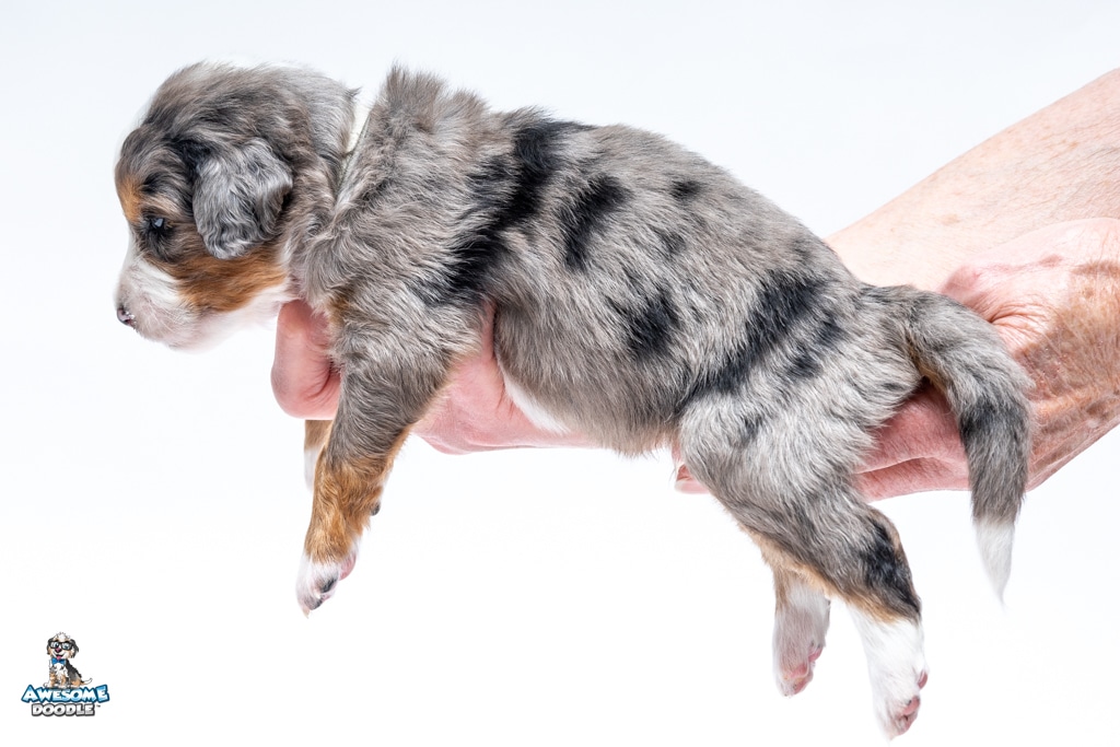 Scout is a male Blue Merle w/ White & Copper F1 AussieDoodle puppy.