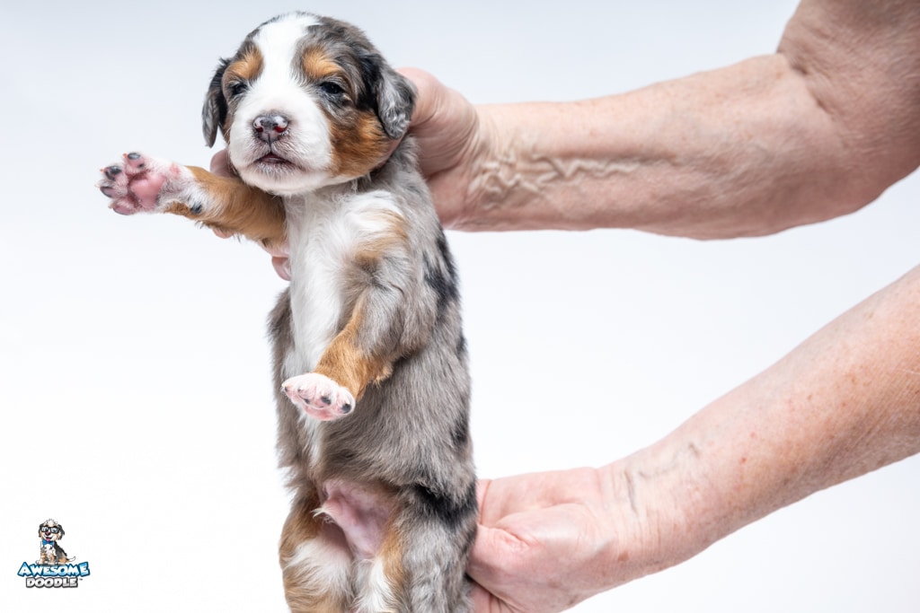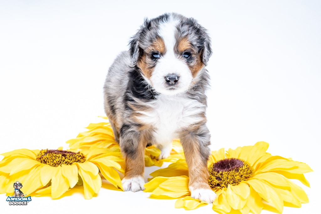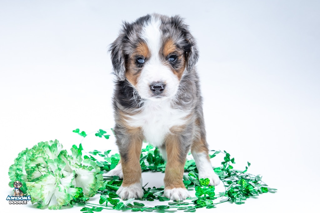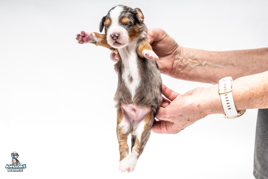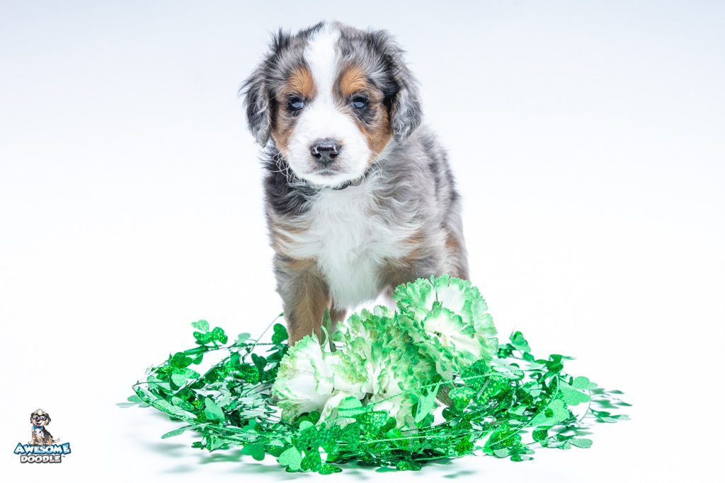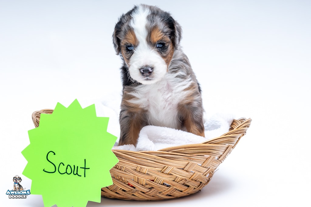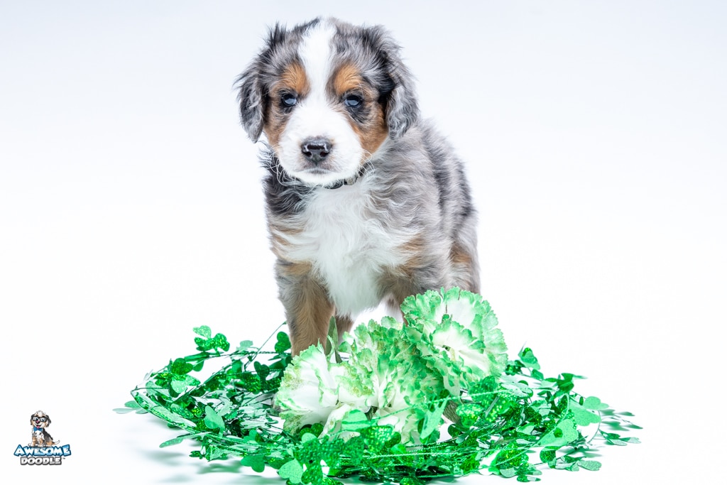 Scout is a male Blue Merle w/ White & Copper F1 AussieDoodle puppy.