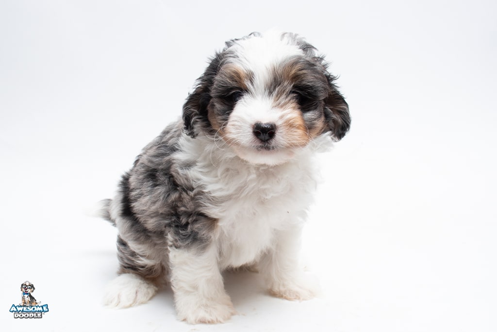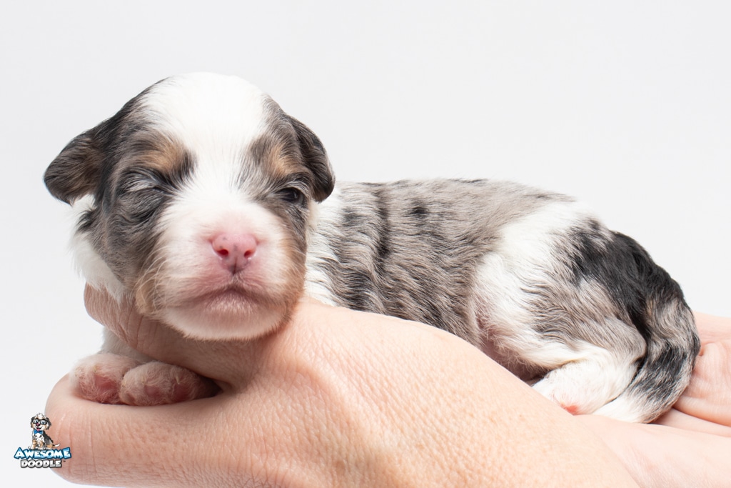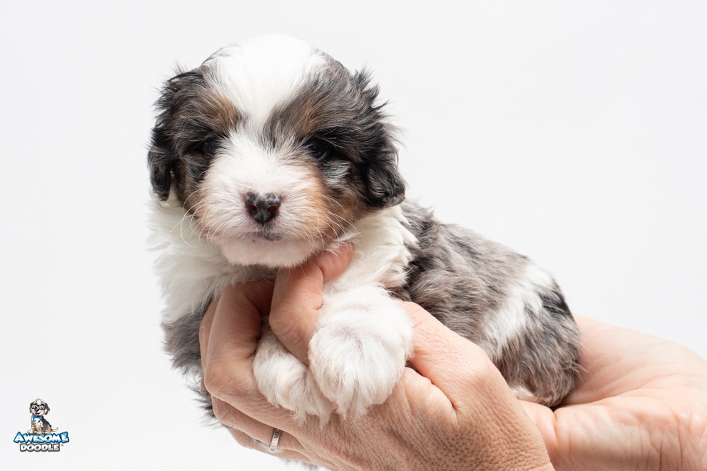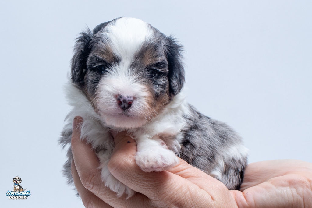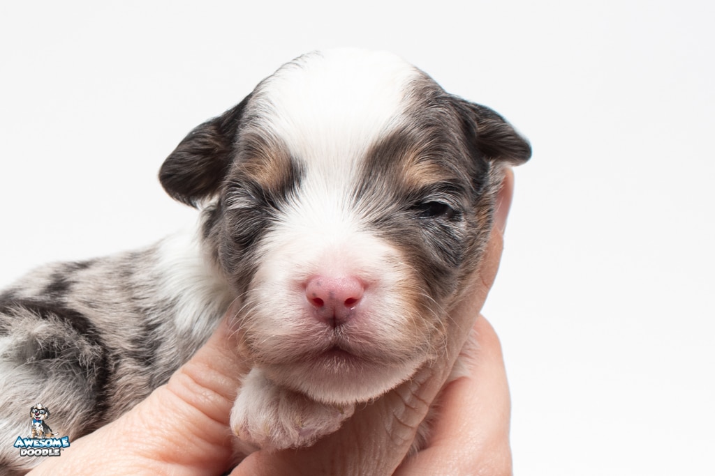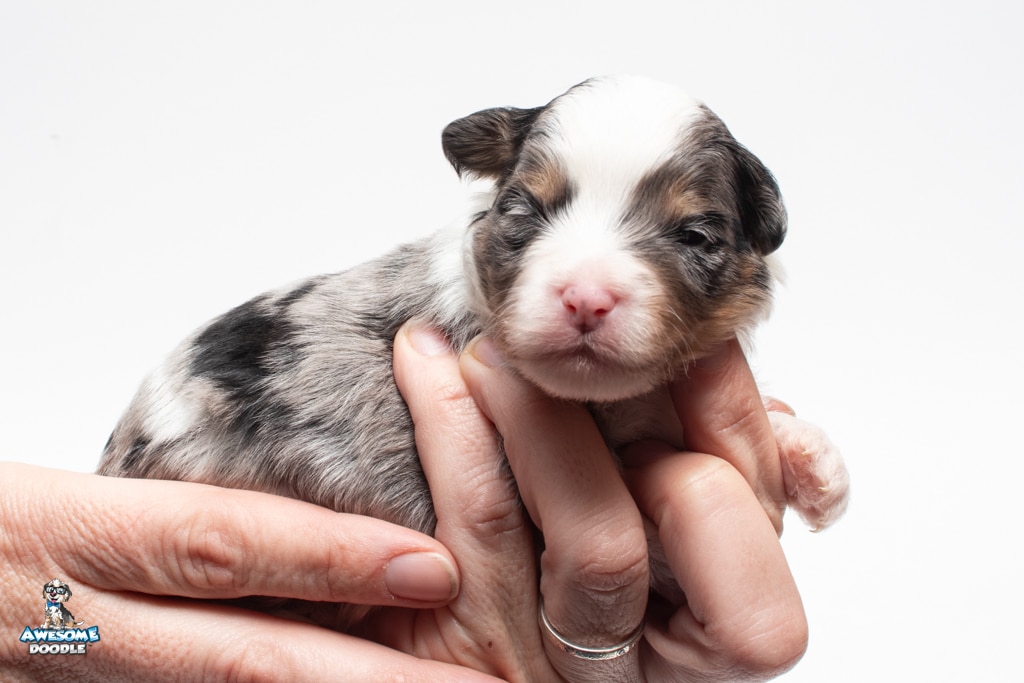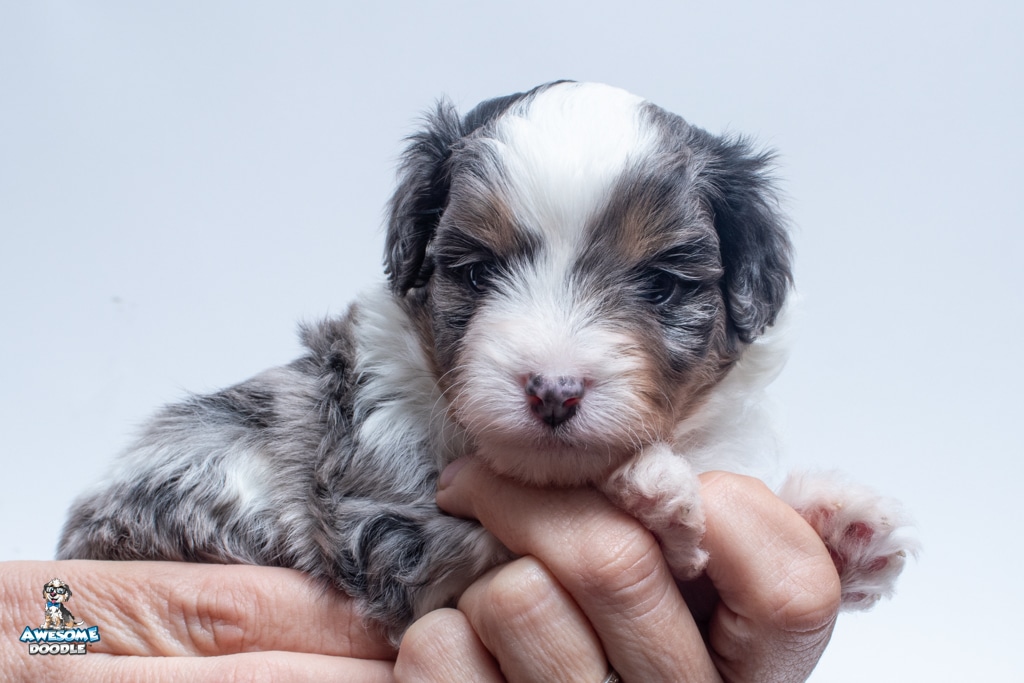 Ziggy is a male Blue Merle w/ White & Copper F1 AussieDoodle puppy.