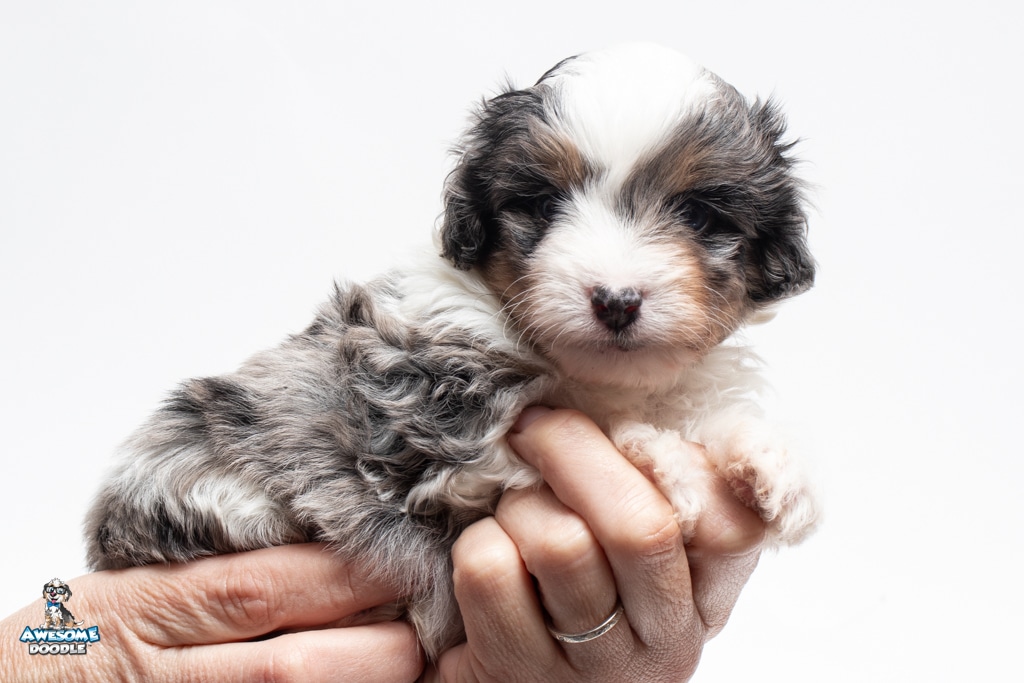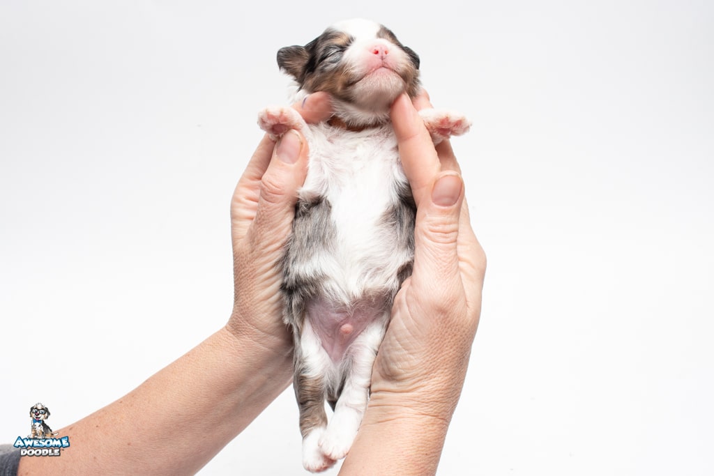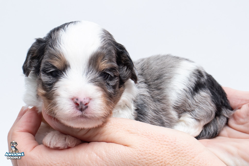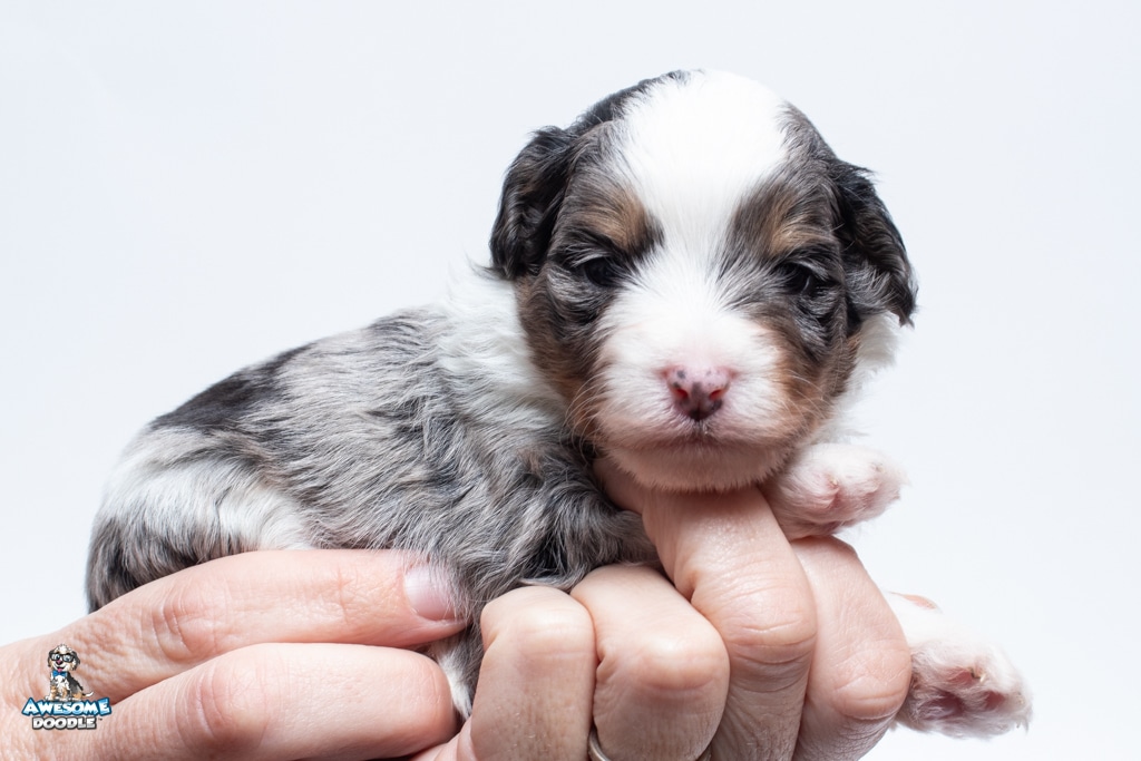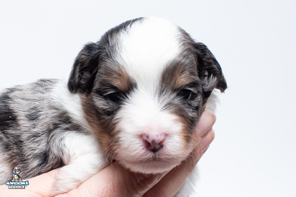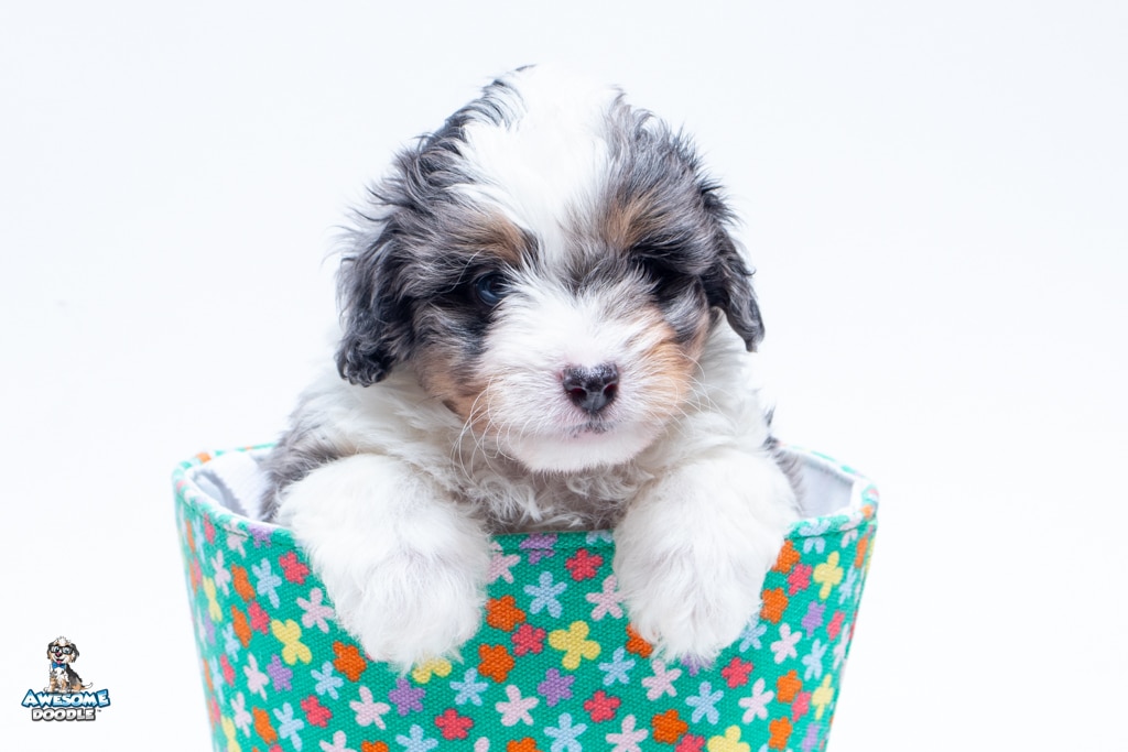 Ziggy is a male Blue Merle w/ White & Copper F1 AussieDoodle puppy.