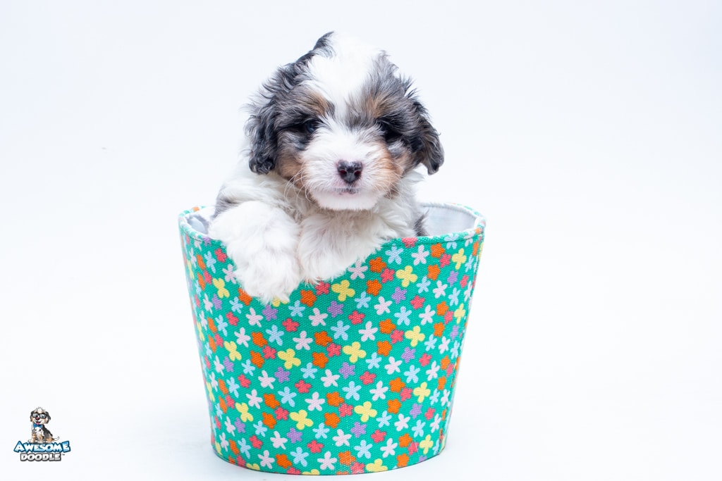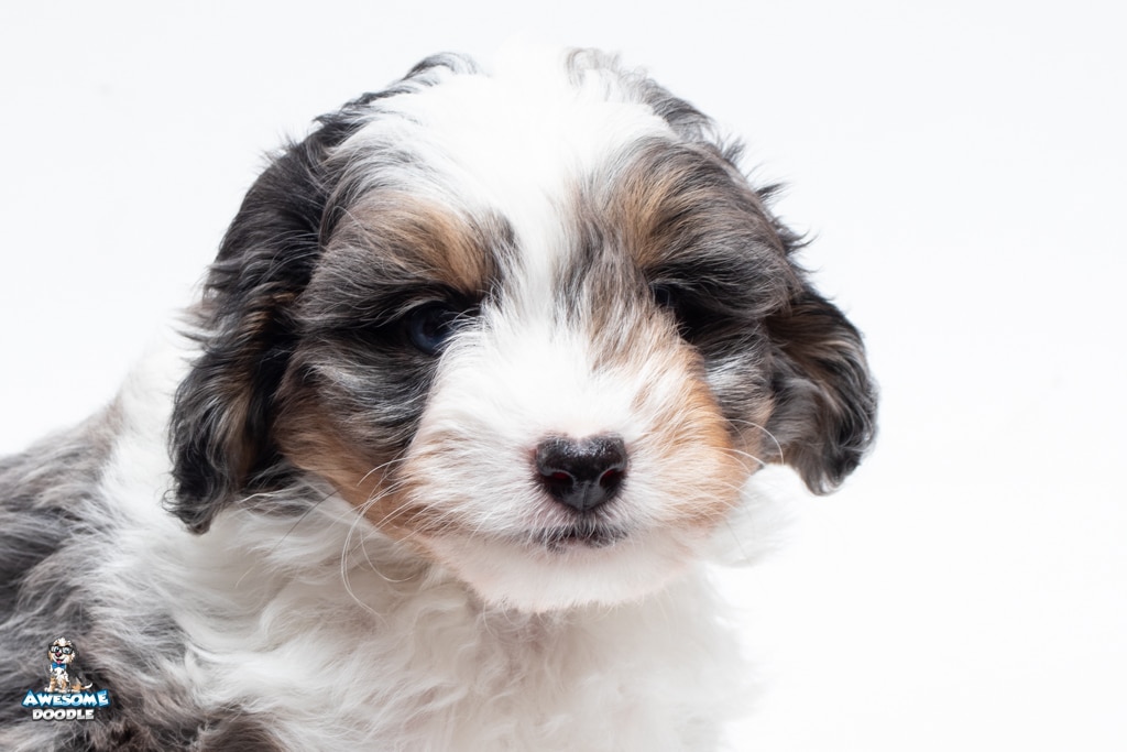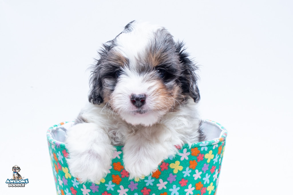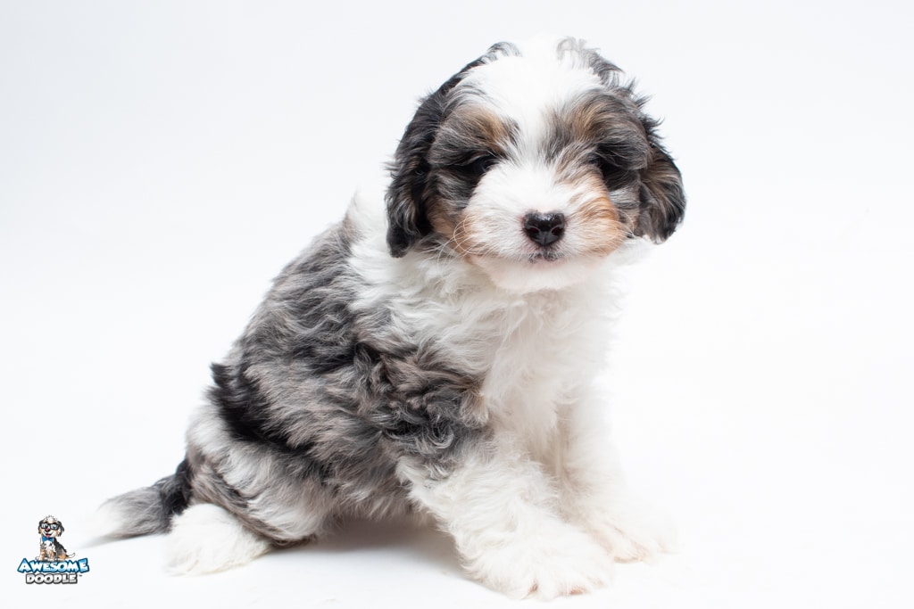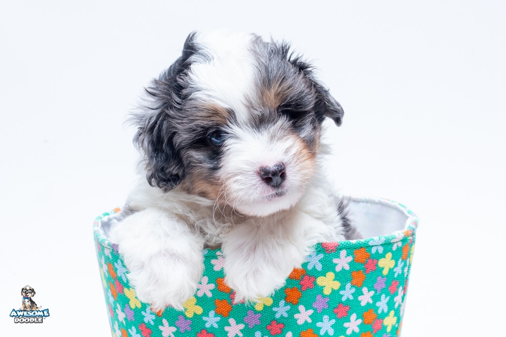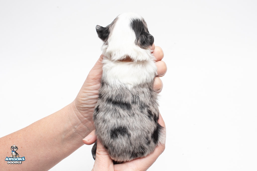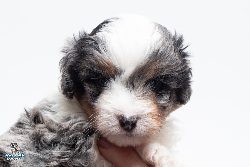 Ziggy is a male Blue Merle w/ White & Copper F1 AussieDoodle puppy.
