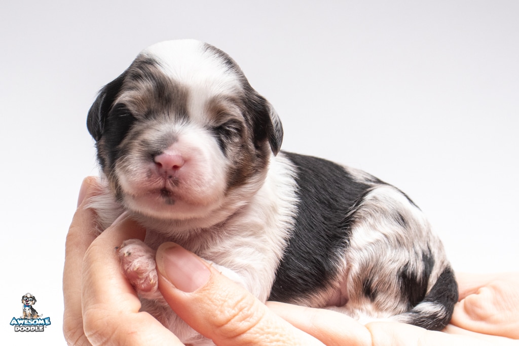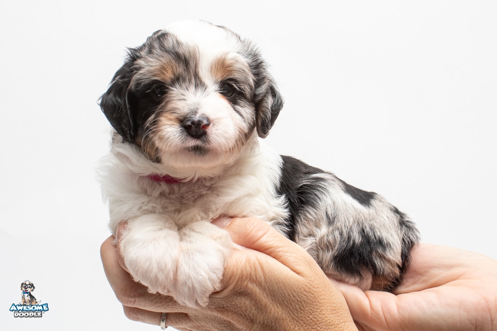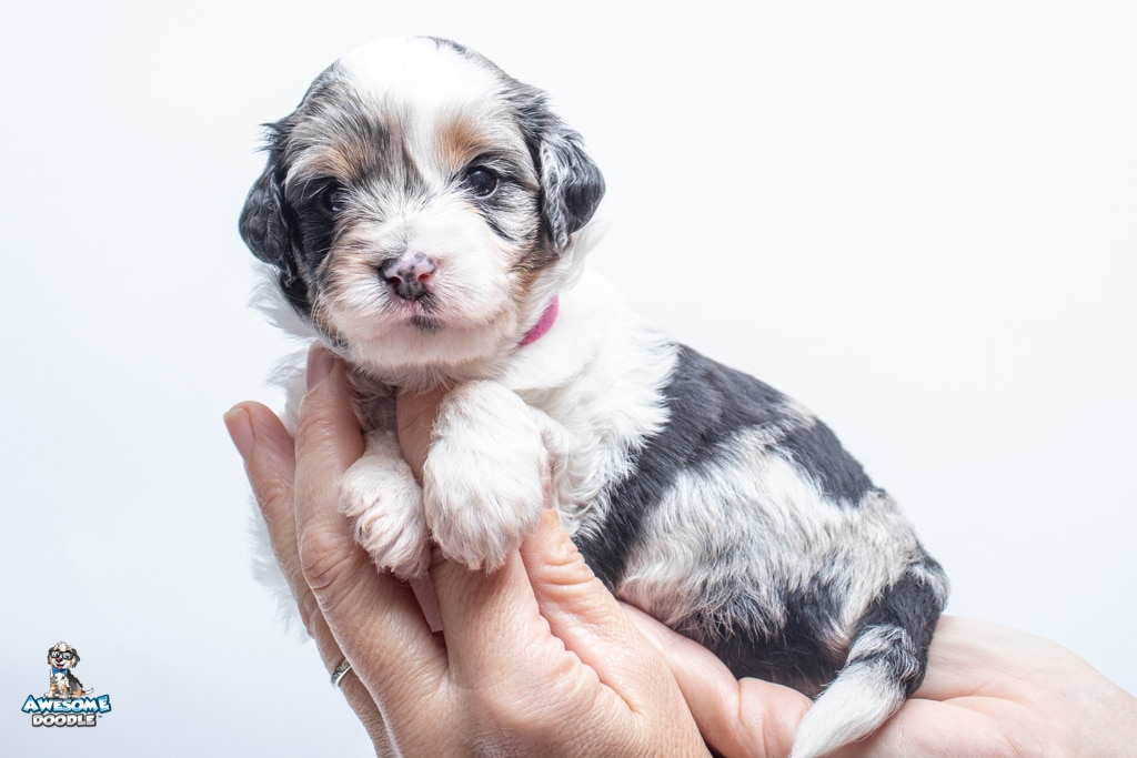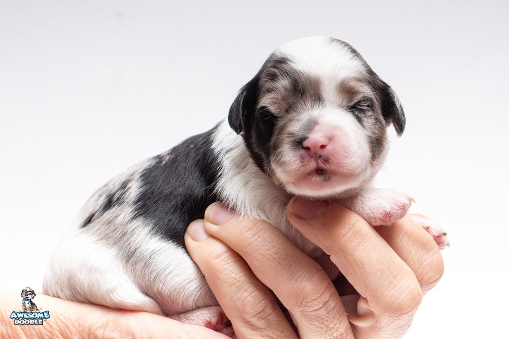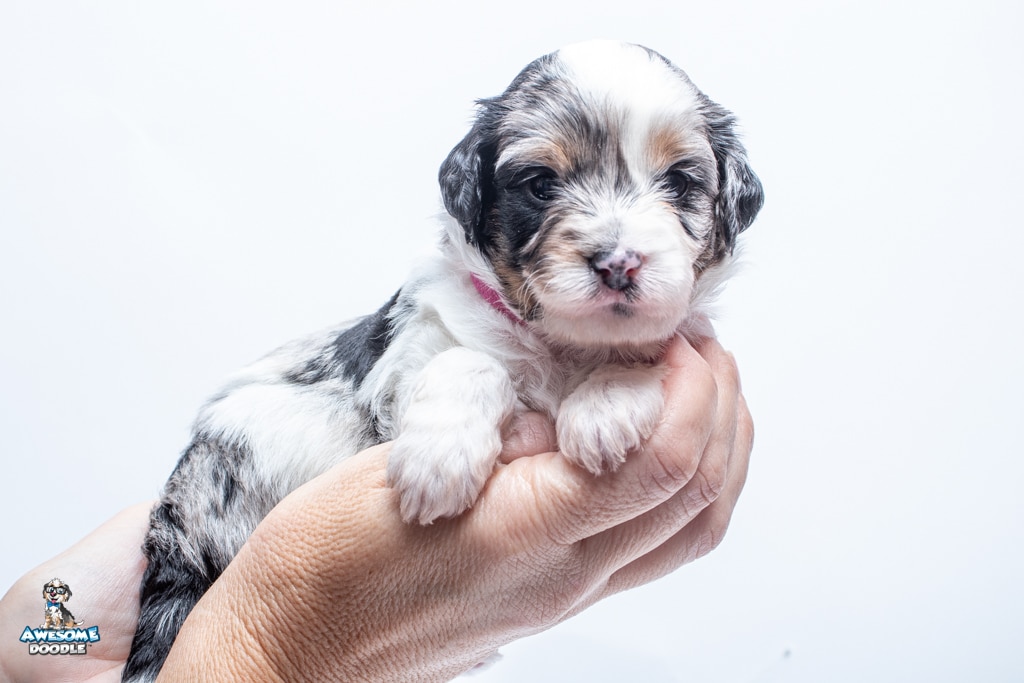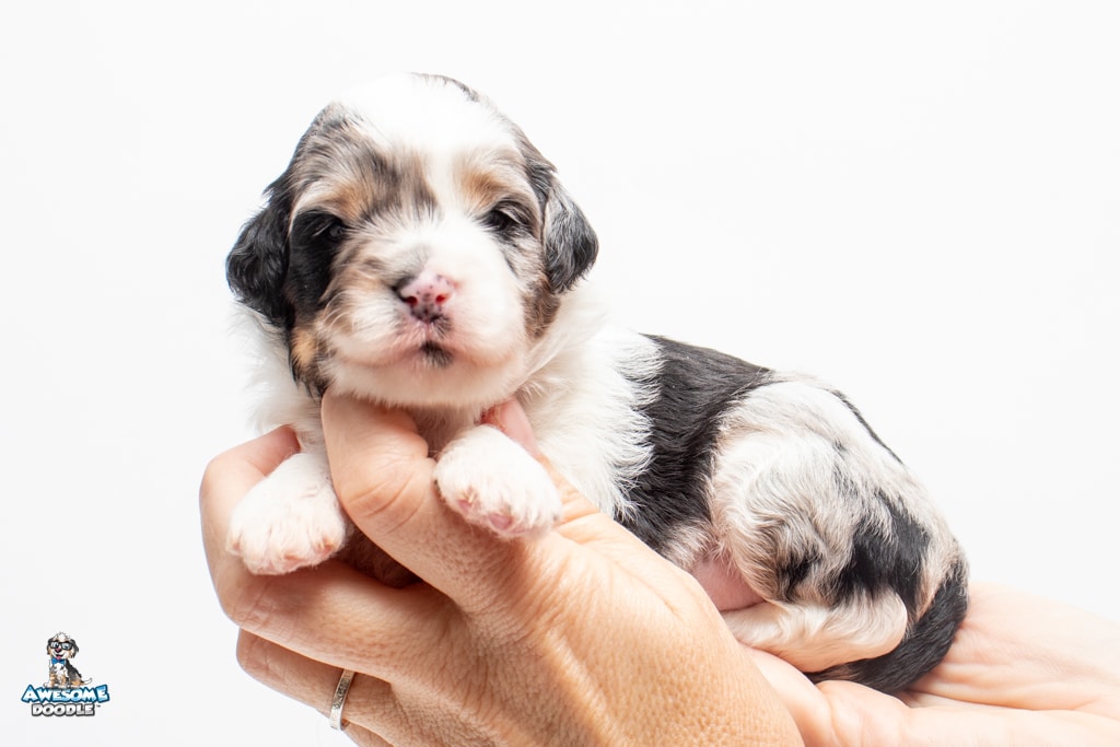 Zoey is a female Blue Merle w/ White & Copper F1 AussieDoodle puppy.