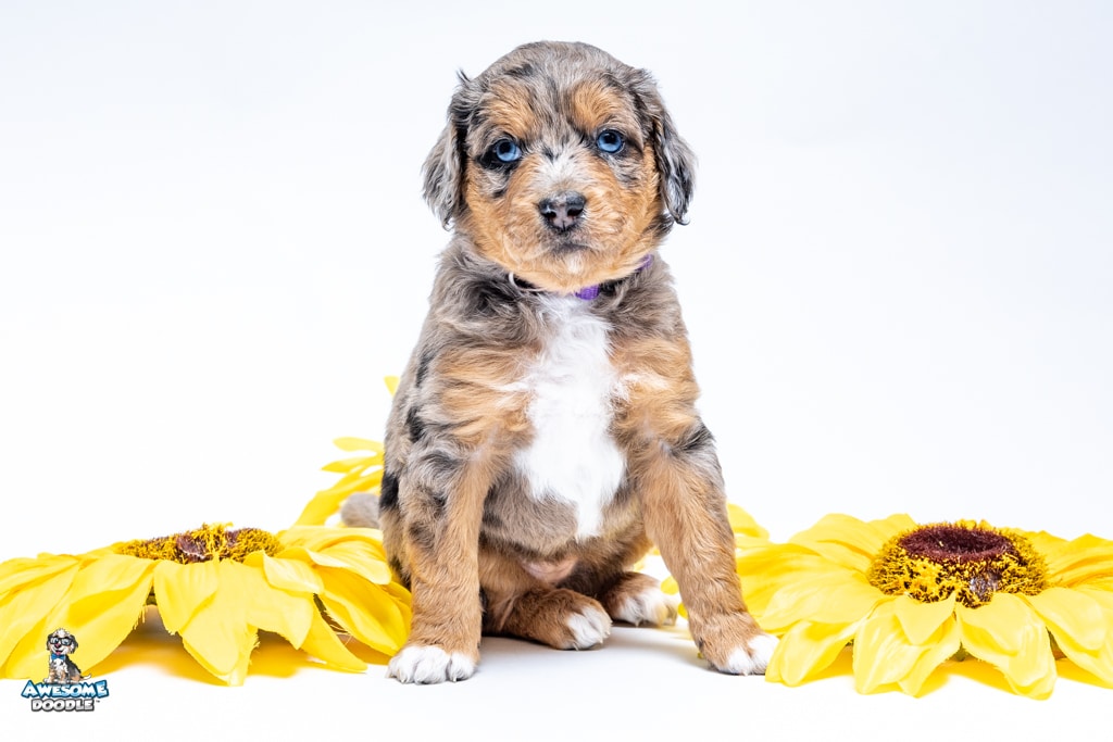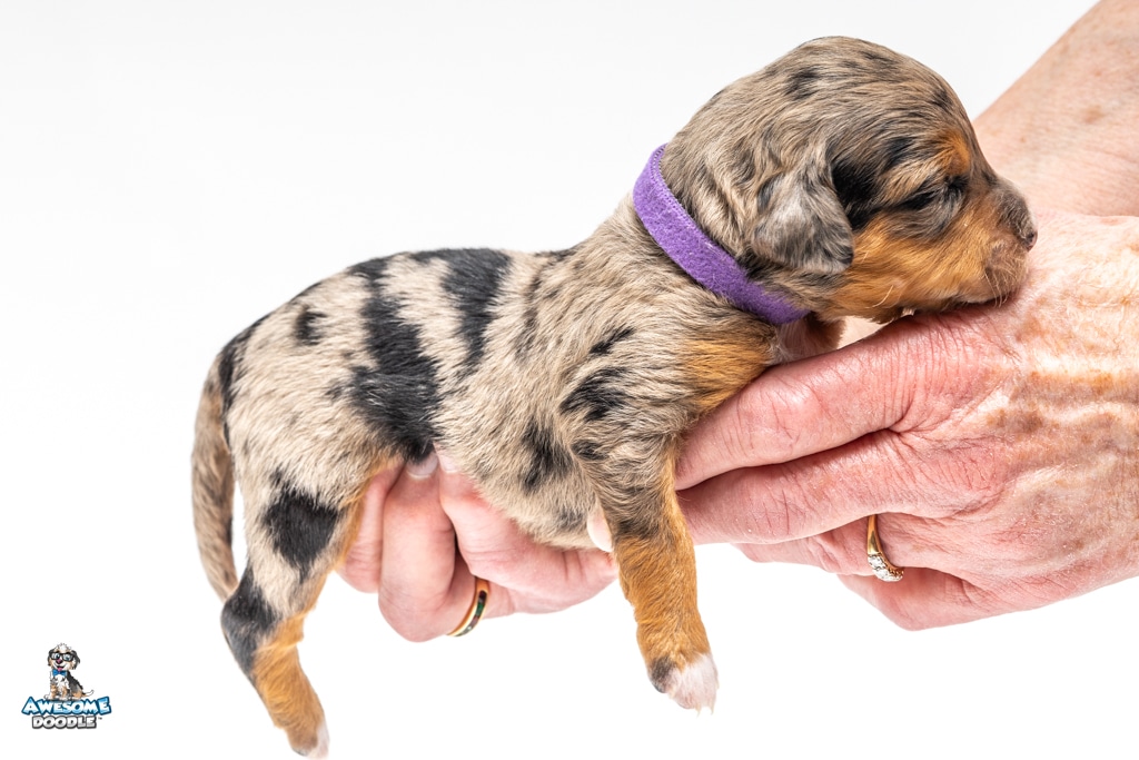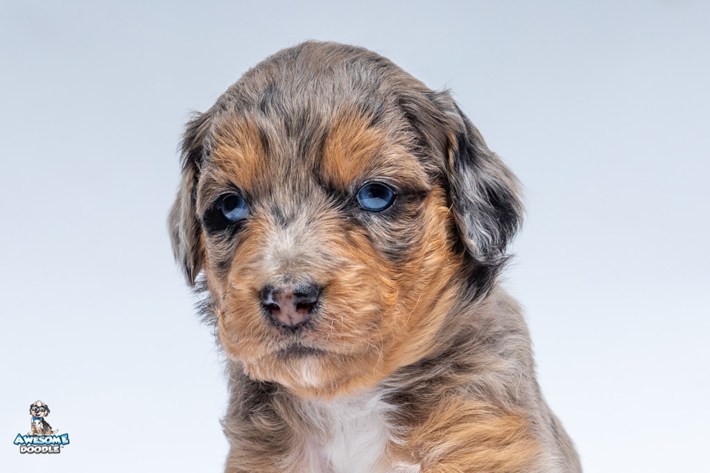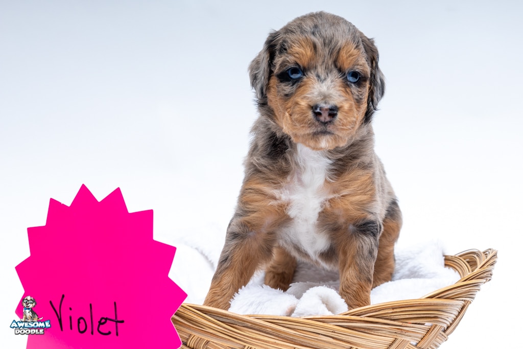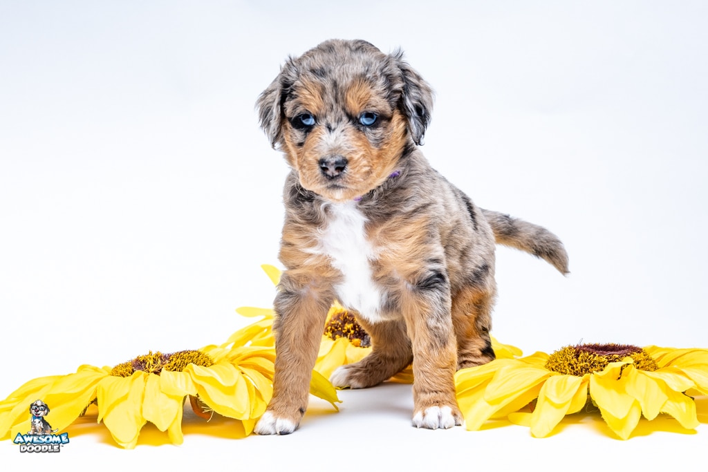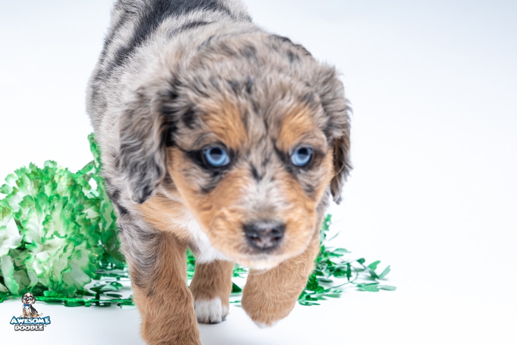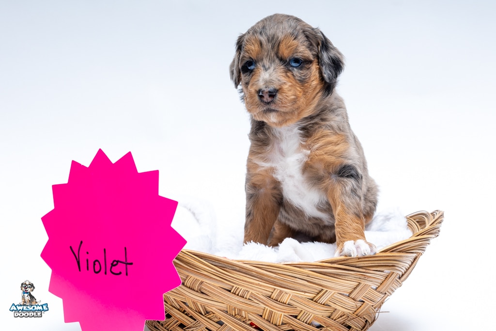 Violet is a female Phantom Blue Merle F1 AussieDoodle puppy.