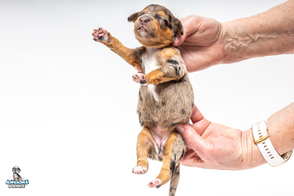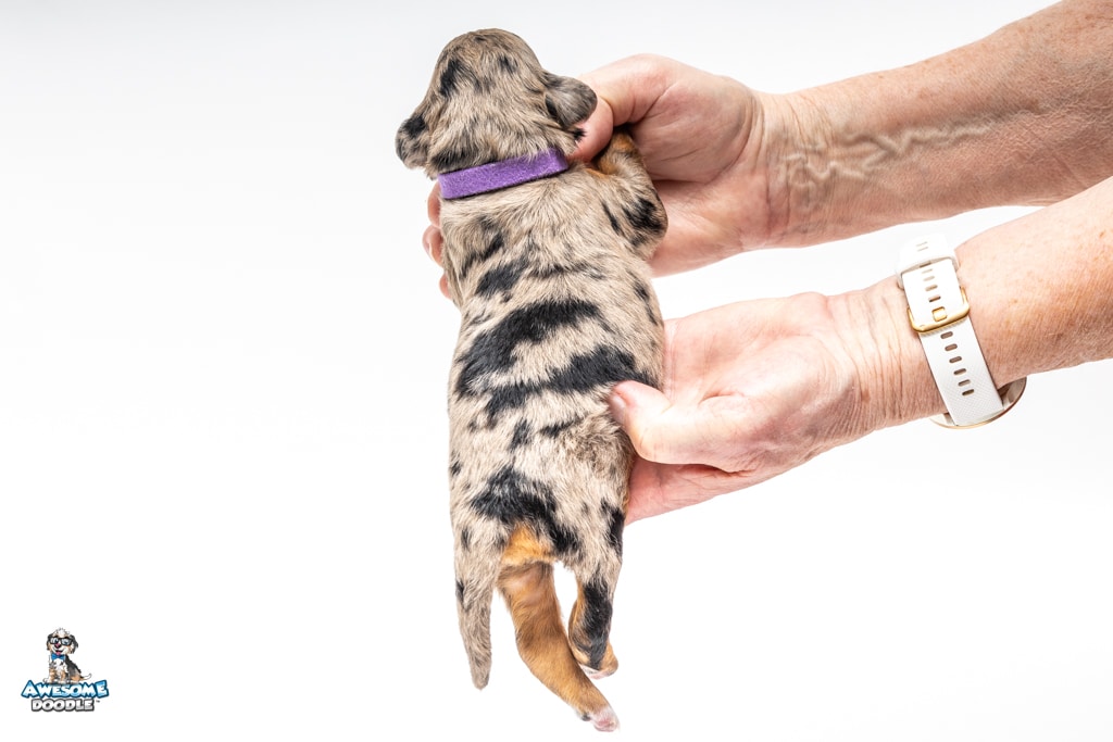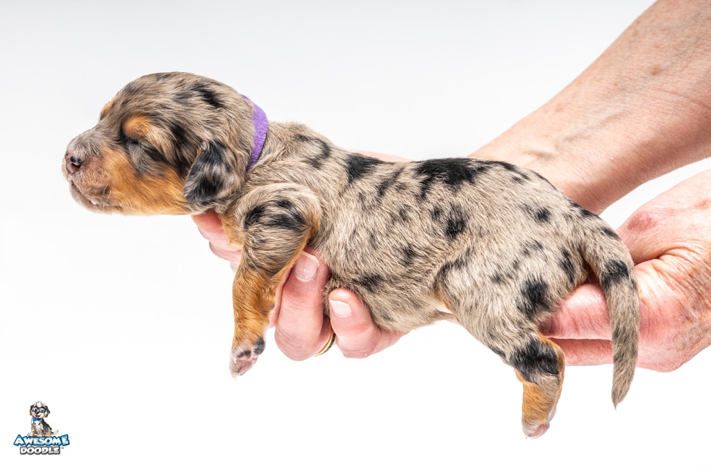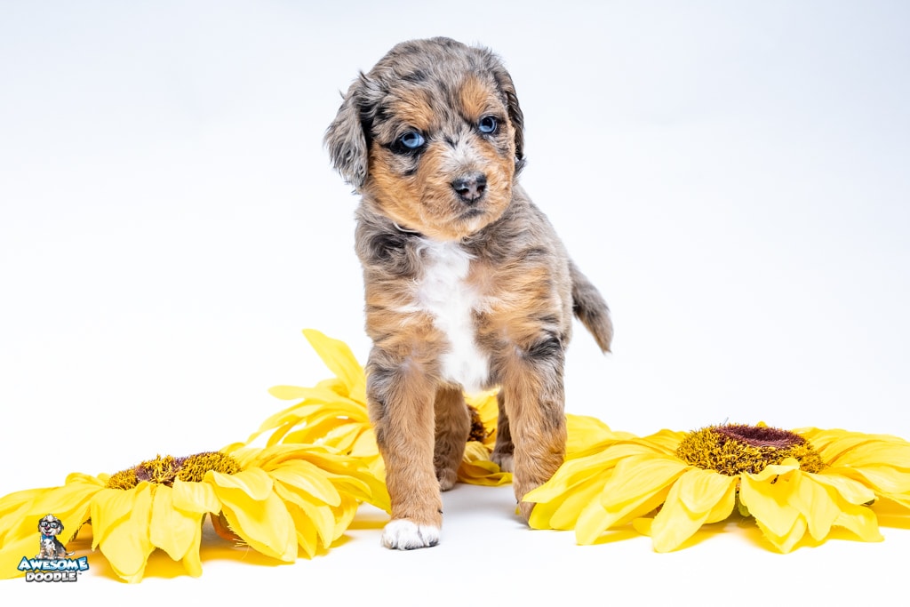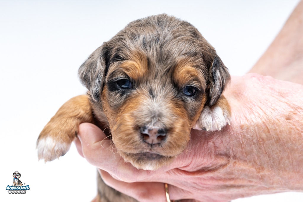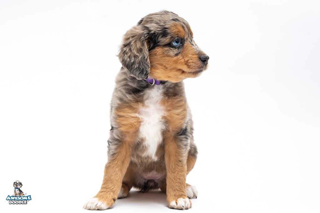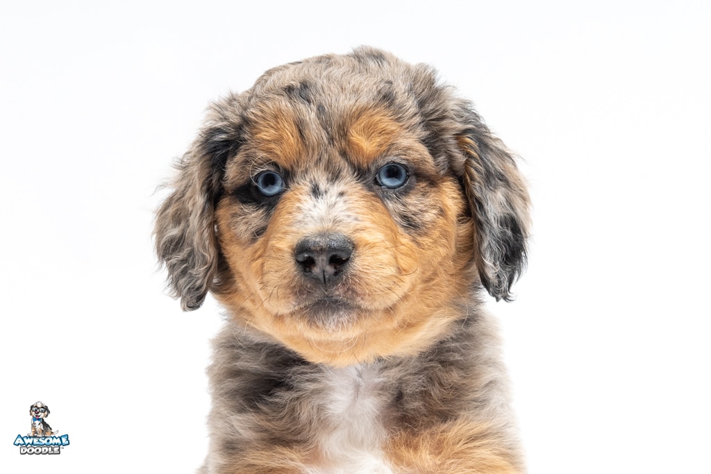 Violet is a female Phantom Blue Merle F1 AussieDoodle puppy.
