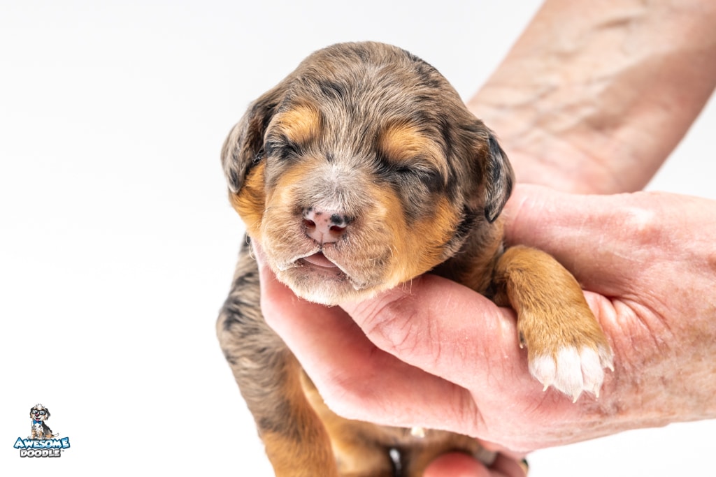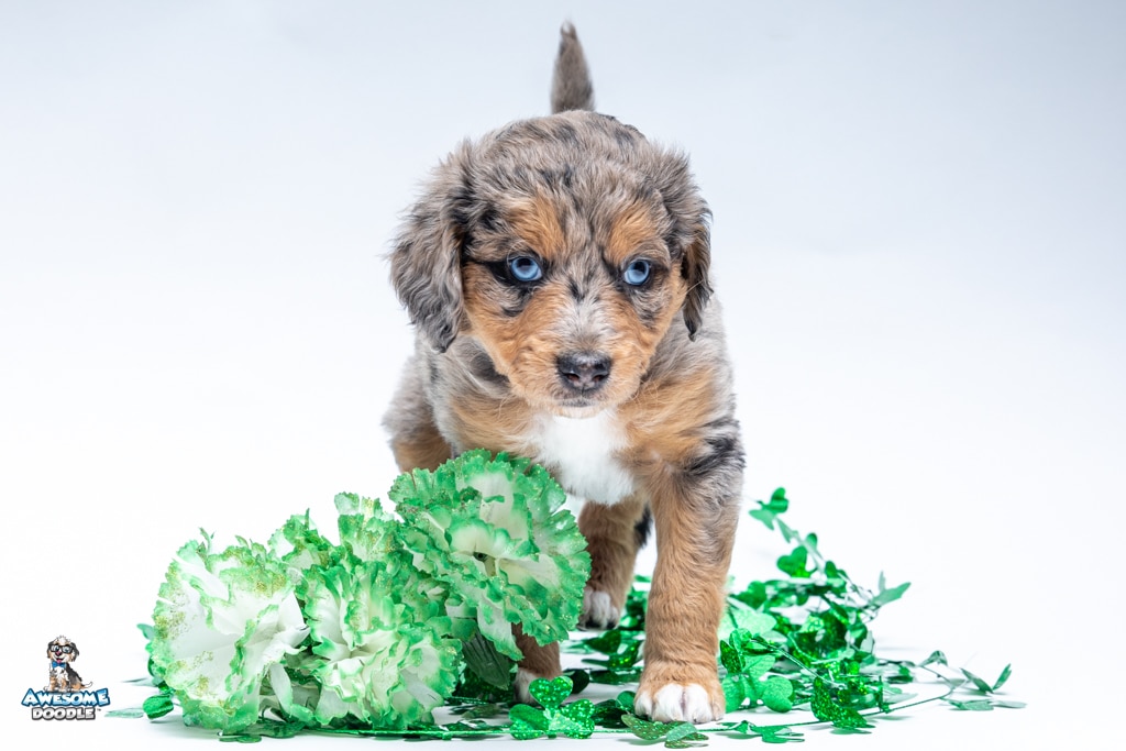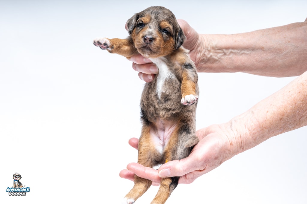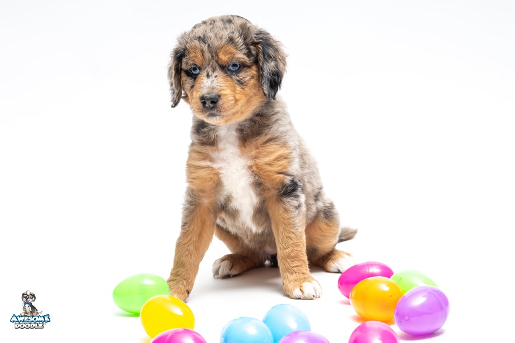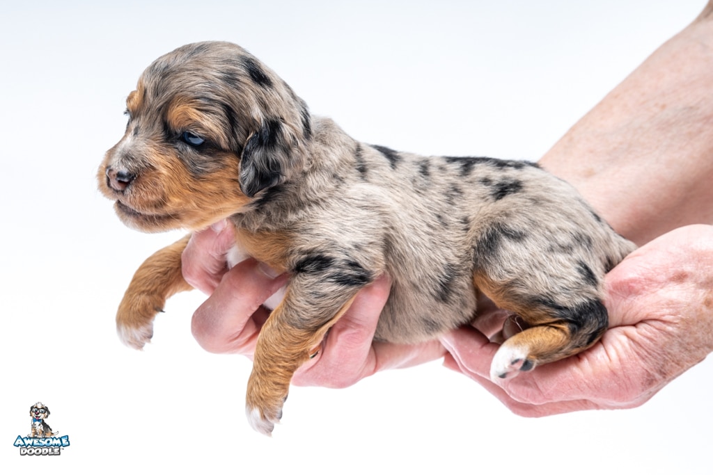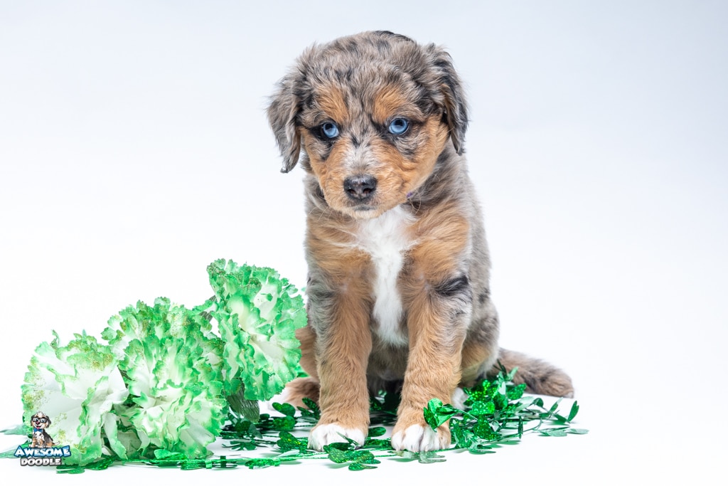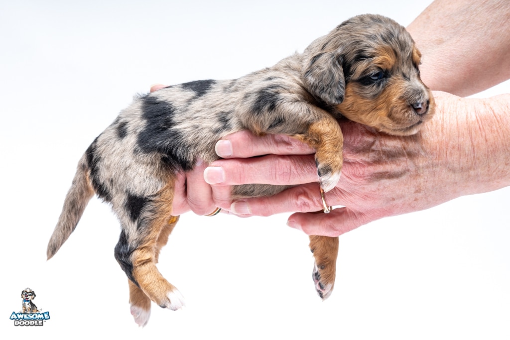 Violet is a female Phantom Blue Merle F1 AussieDoodle puppy.